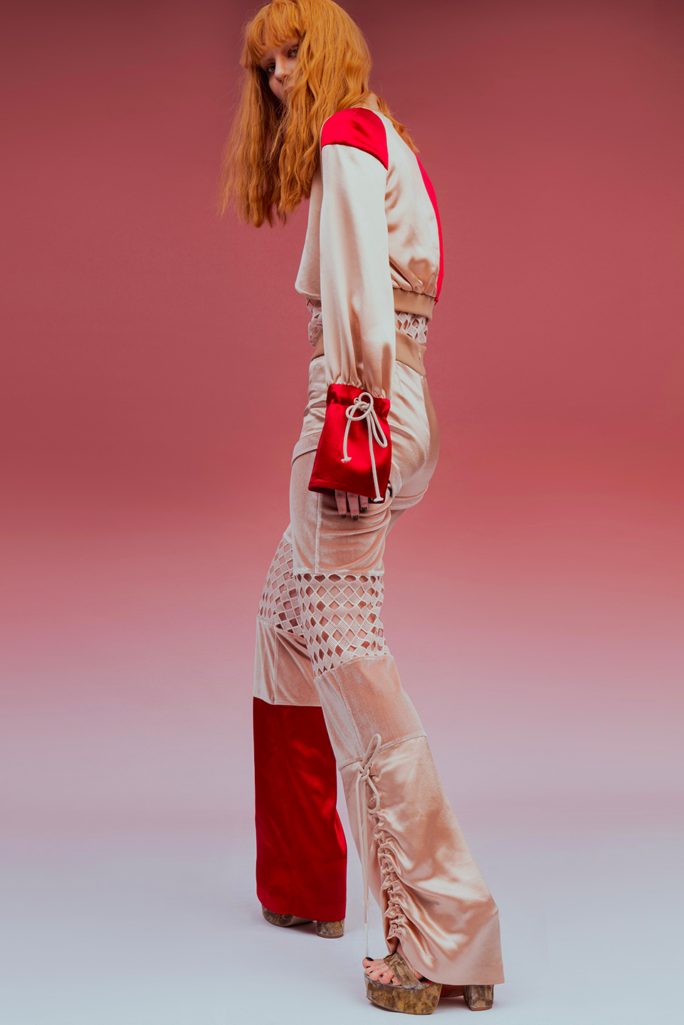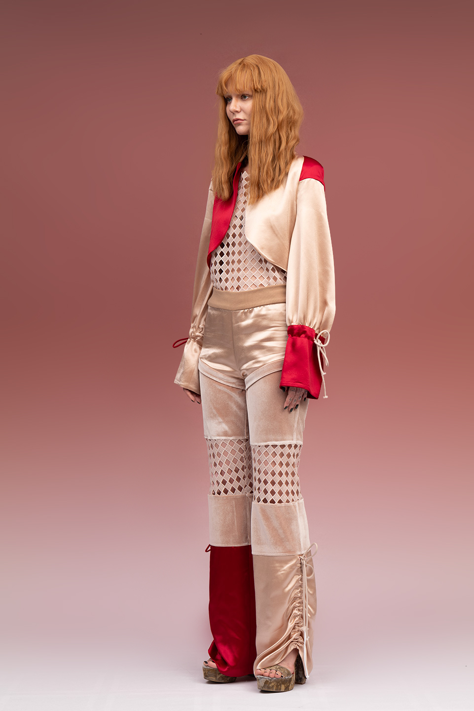This ensemble celebrates movement through luxurious fabrics and fluid lines. The bold fusion of vibrant red and champagne creates an energetic statement. When worn, it empowers you to chase your dreams with confidence, radiating vitality and determination.