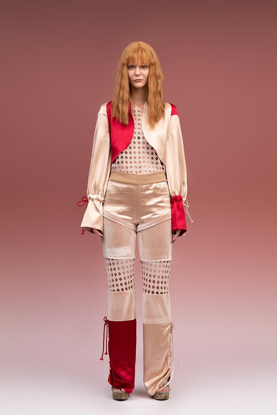 This ensemble celebrates movement through luxurious fabrics and fluid lines. The bold fusion of vibrant red and champagne creates an energetic statement. When worn, it empowers you to chase your dreams with confidence, radiating vitality and determination.