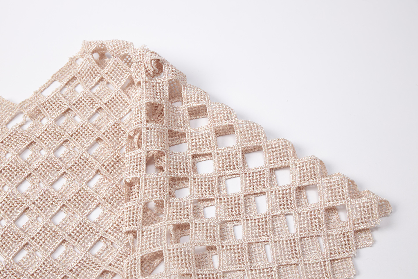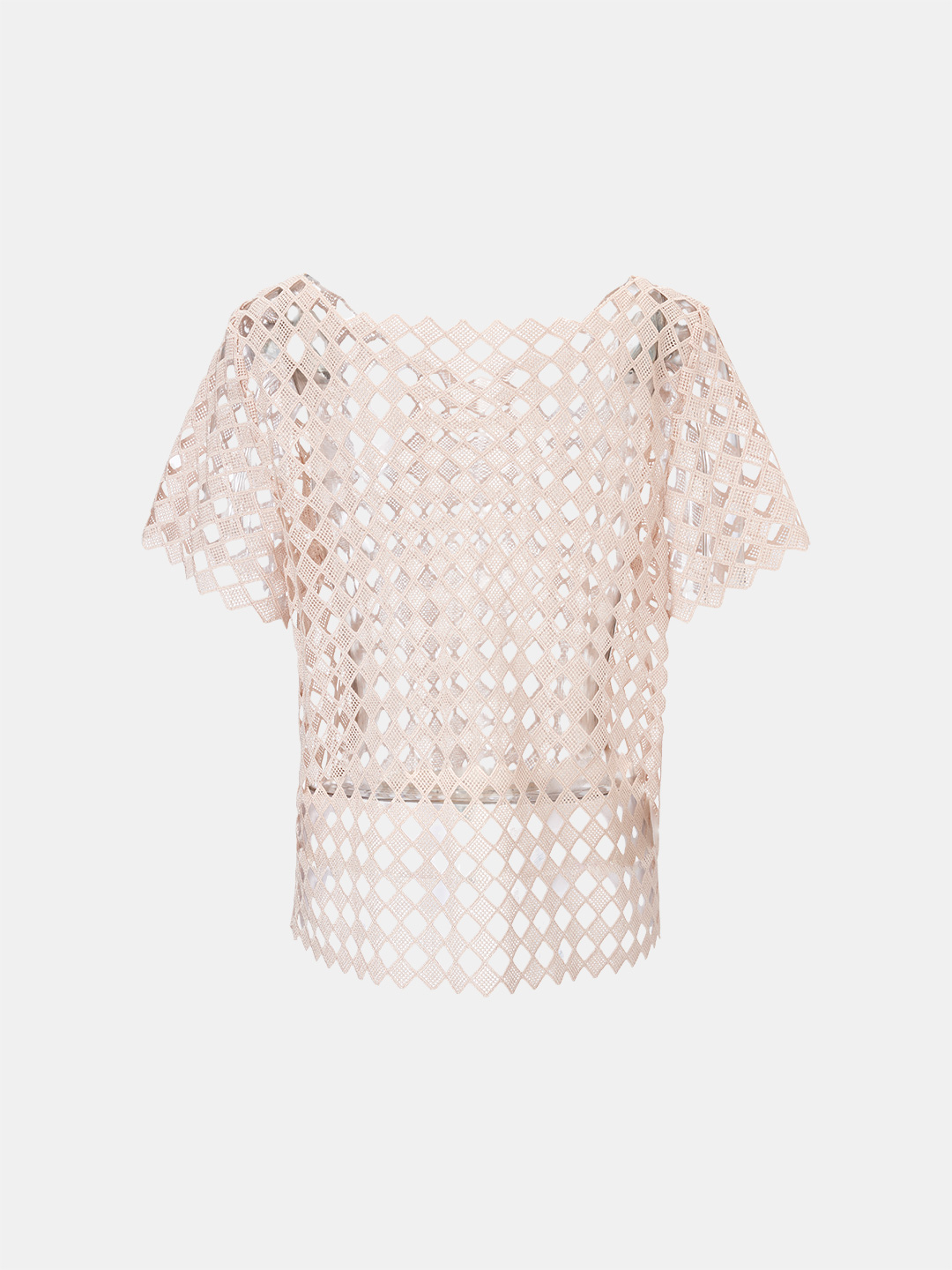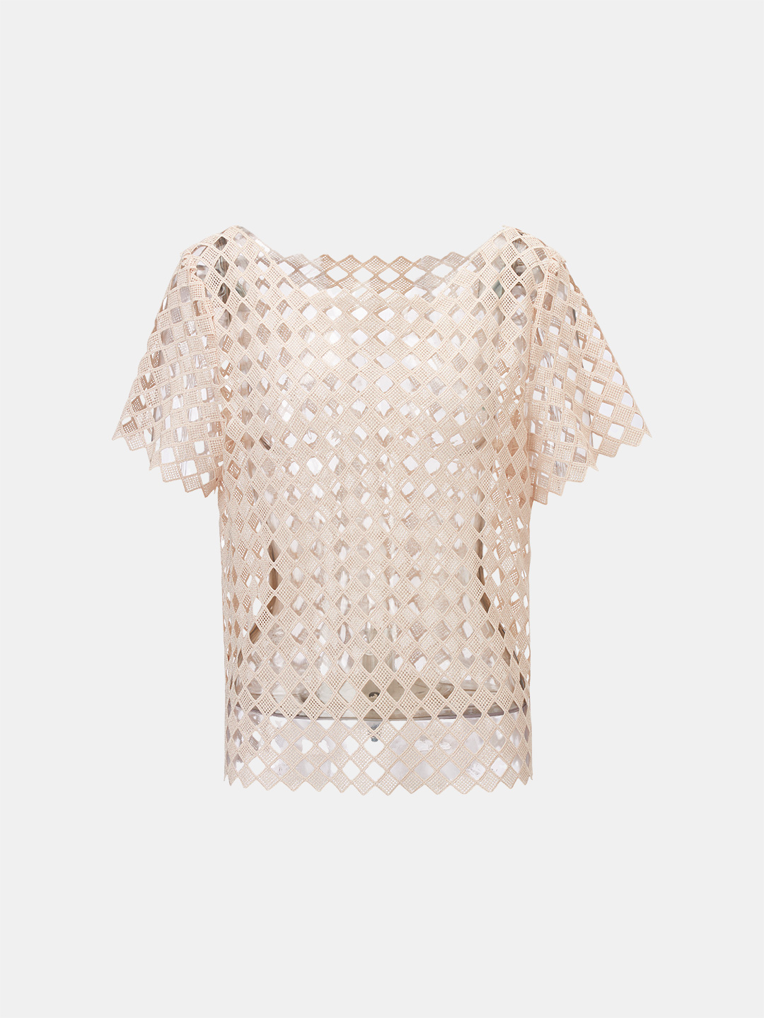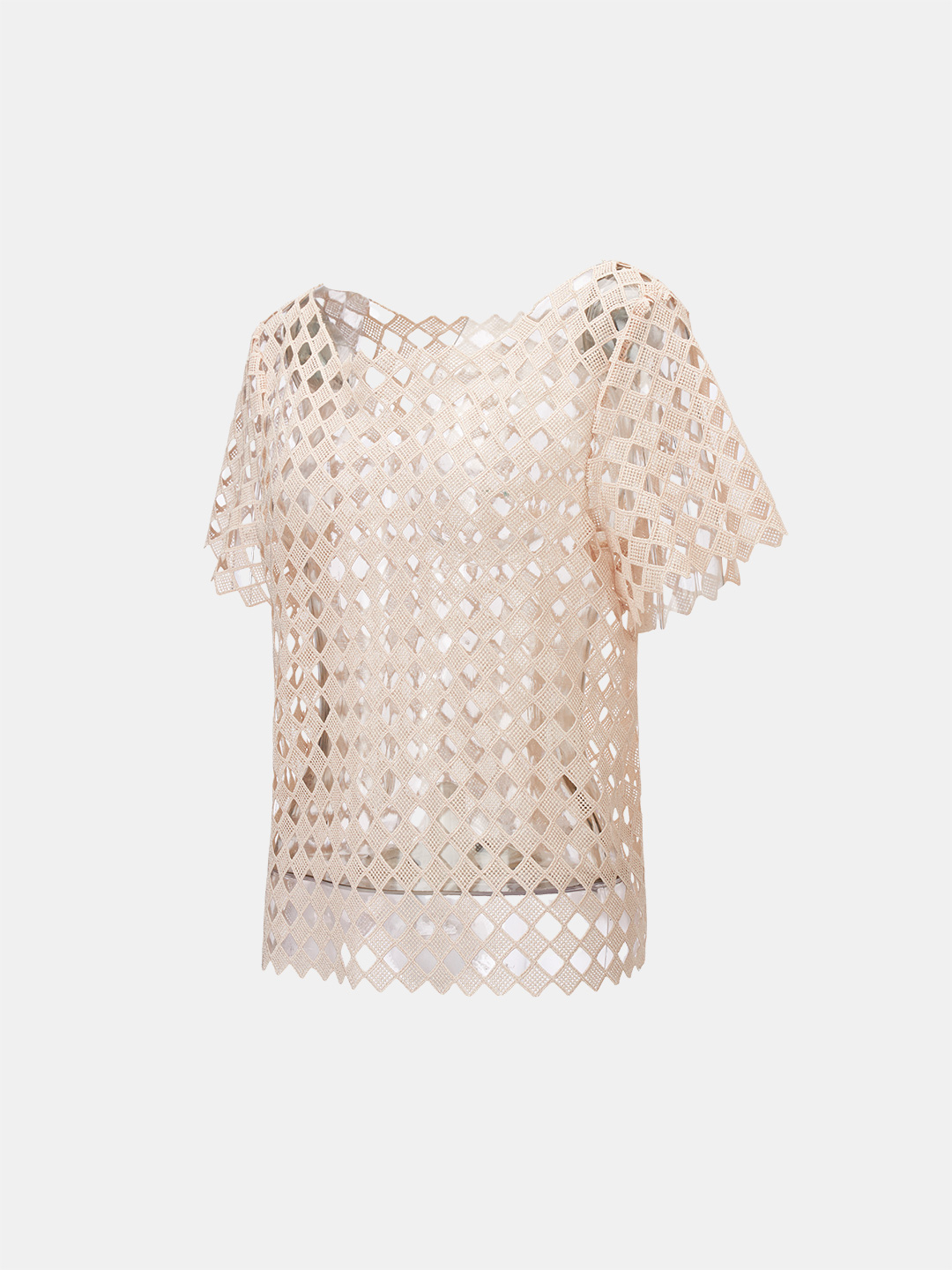 The champagne-toned T-shirt features specially crafted fabrics adorned with meticulously designed hollow patterns, showcasing a distinctive artistic charm. The evenly sized hollows are arranged with precision, highlighting symmetry and harmony.