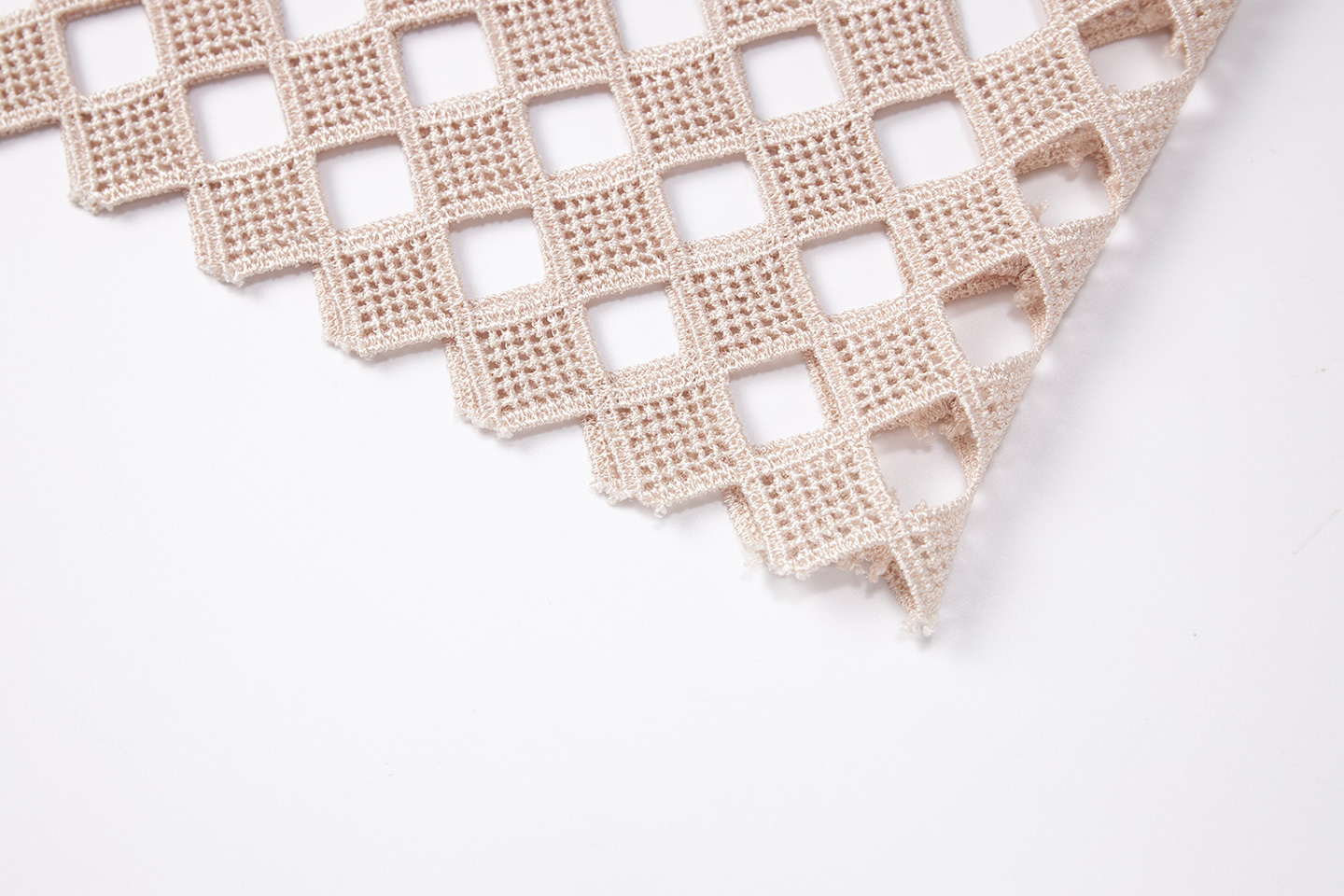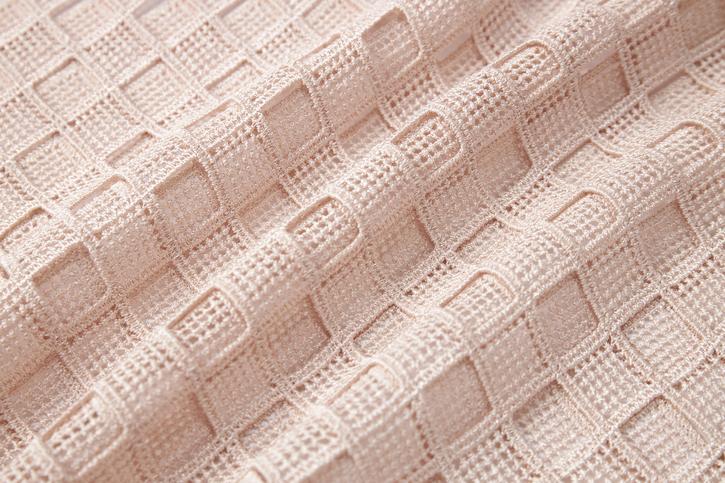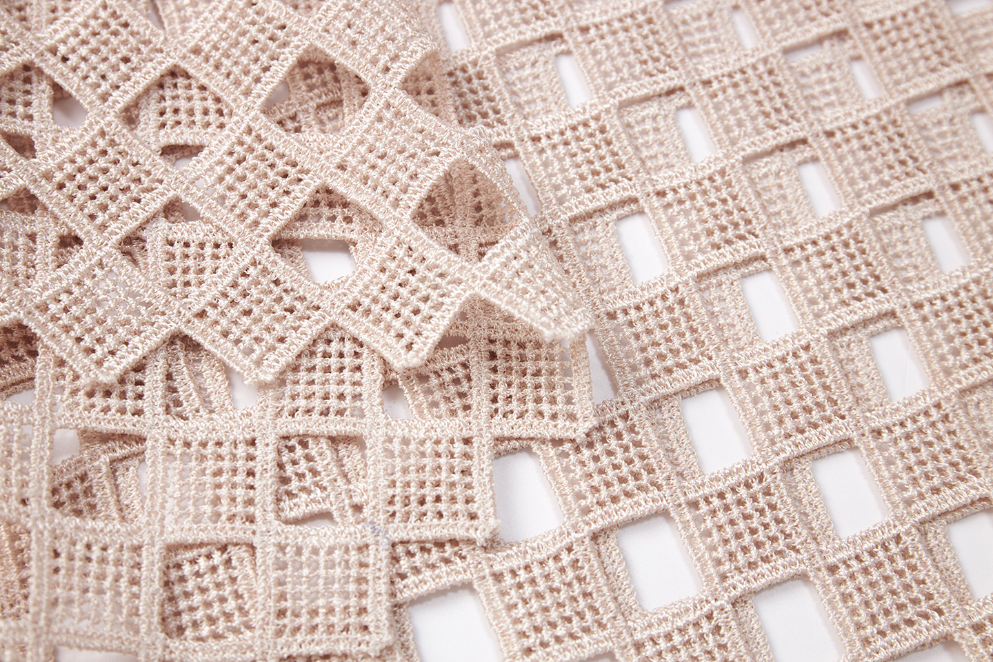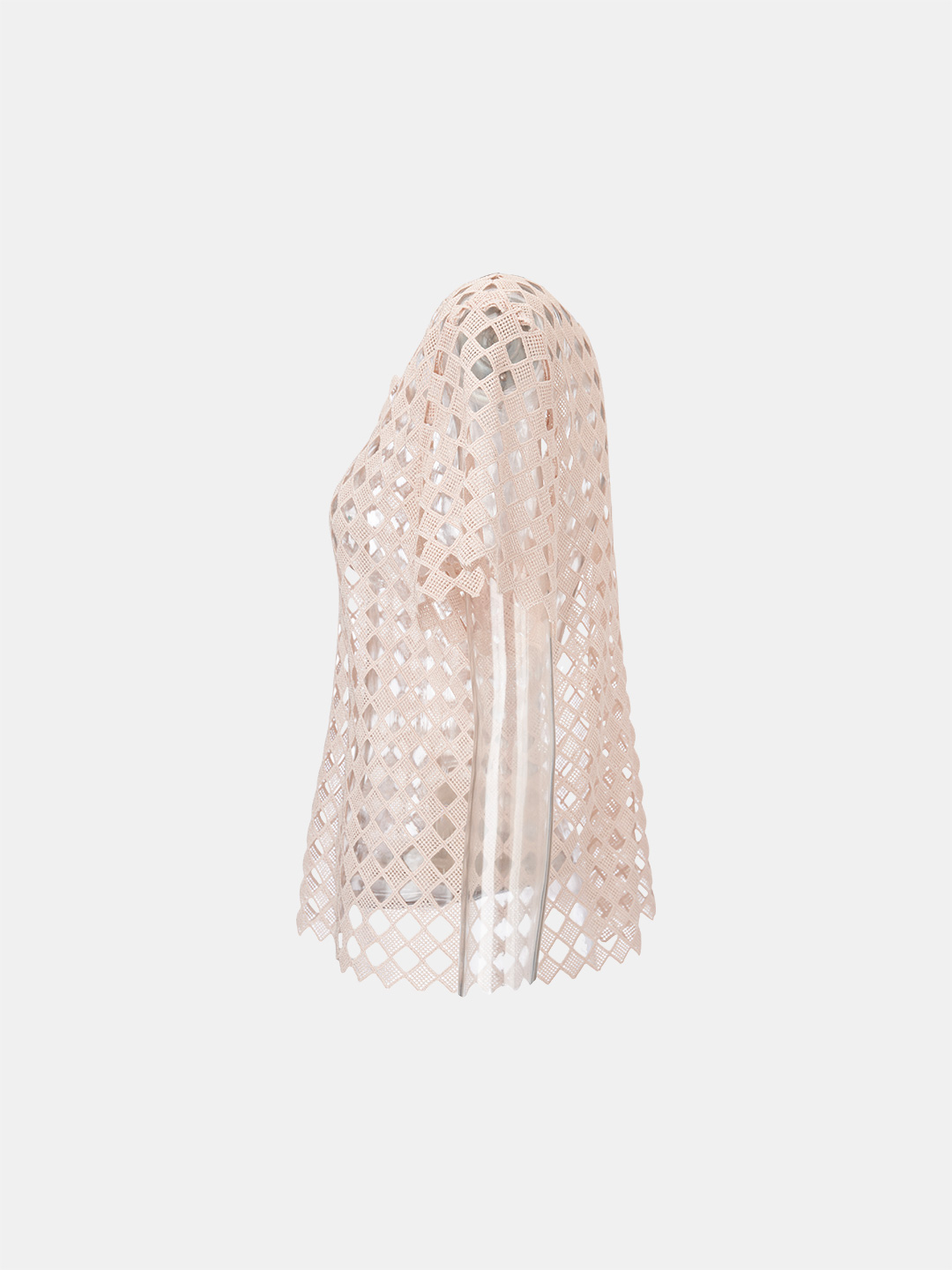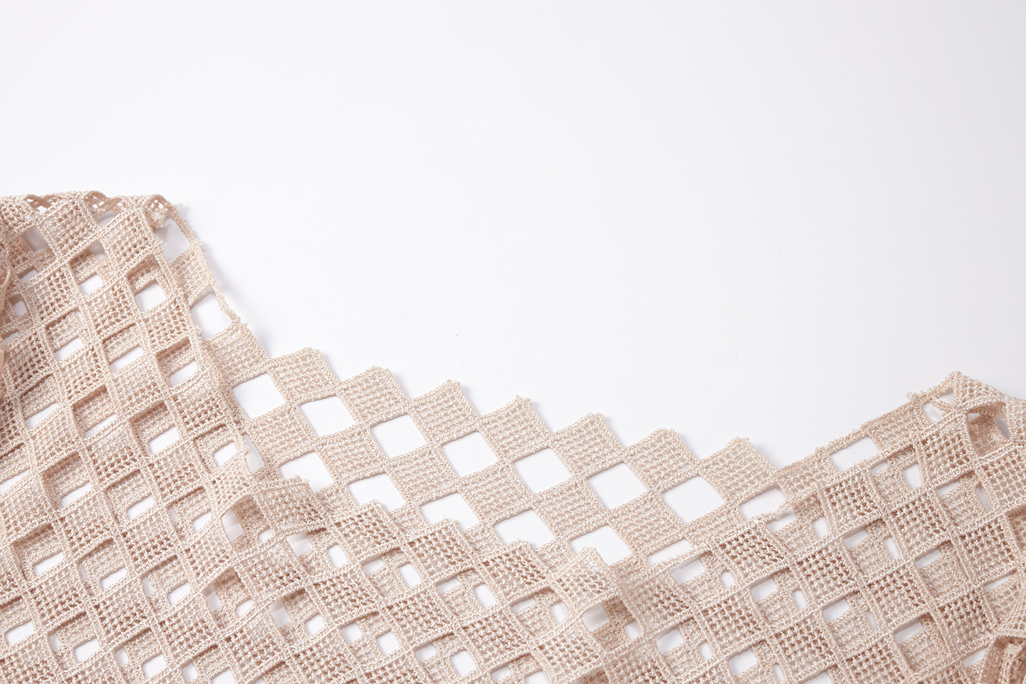 The champagne-toned T-shirt features specially crafted fabrics adorned with meticulously designed hollow patterns, showcasing a distinctive artistic charm. The evenly sized hollows are arranged with precision, highlighting symmetry and harmony.