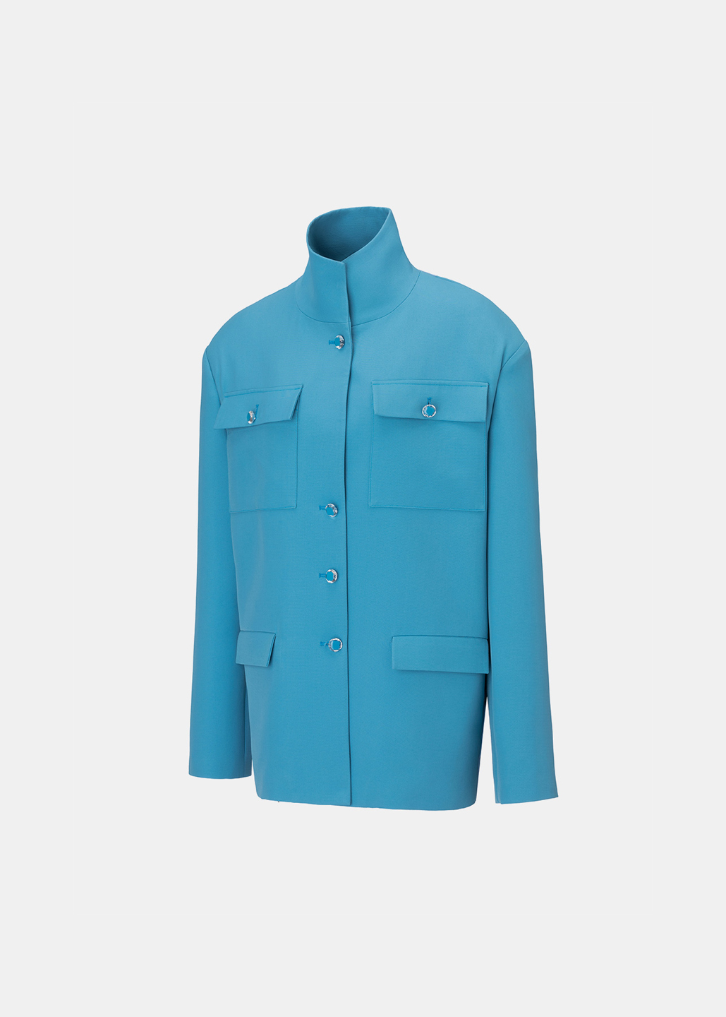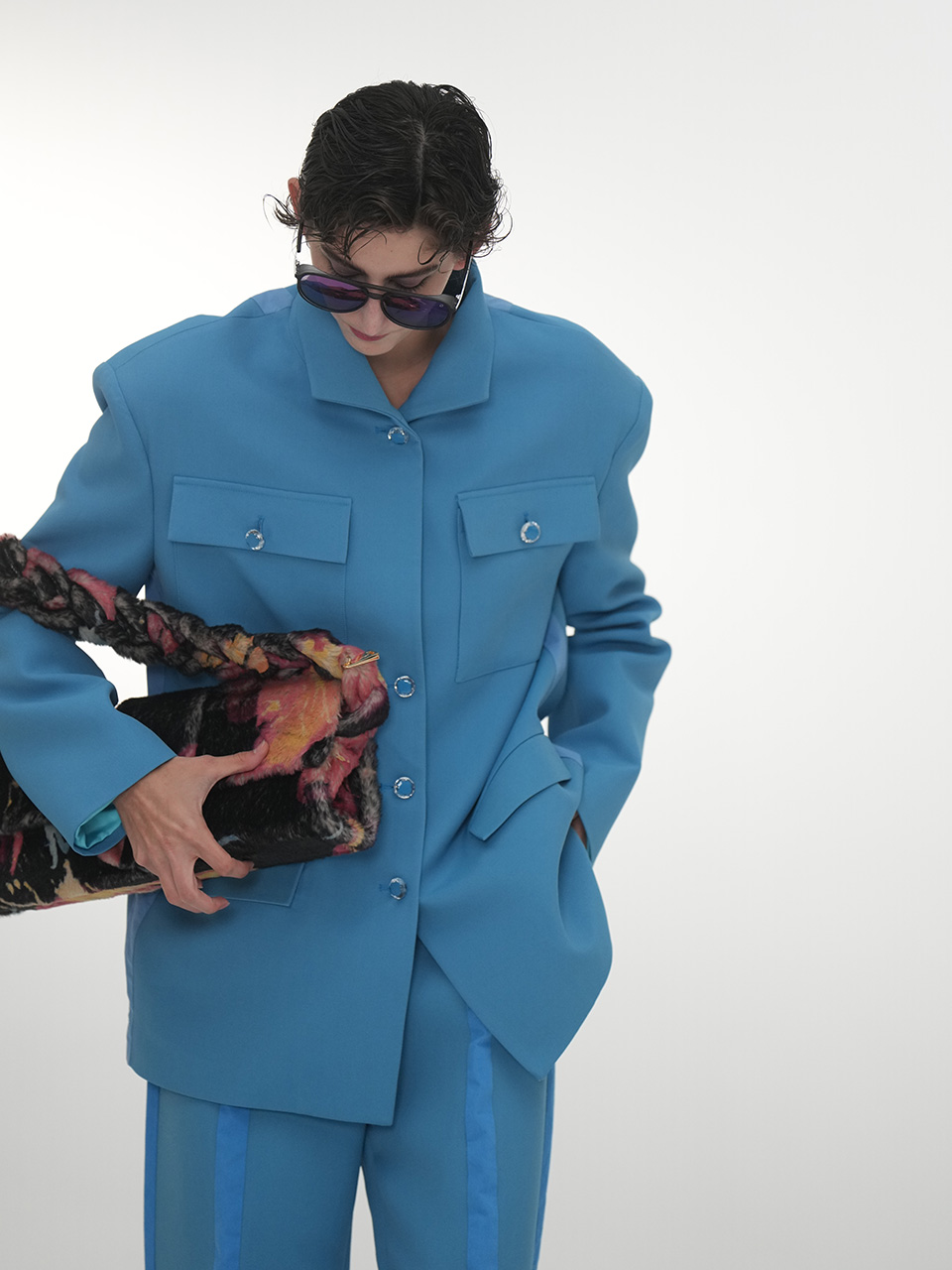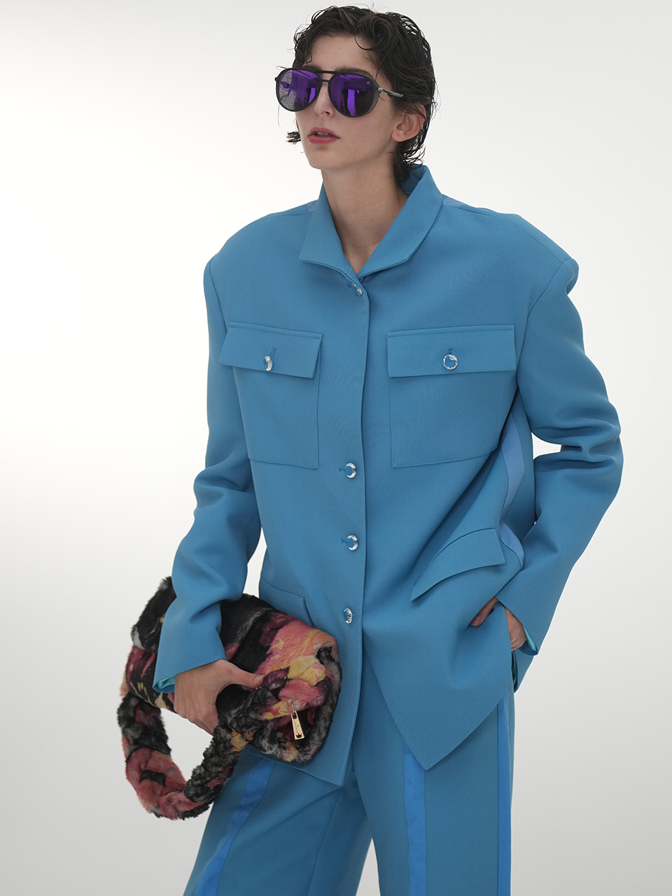 选用鲜明蓝色调,That’s CHU 采用经典立领与宽阔肩部剪裁。简约设计中低调融合力量感与不羁气质。多功能口袋提升实用性,背部浅蓝面料拼接灵感源自阳光在湖面的反射,打造简约与个性兼具的百搭单品。
