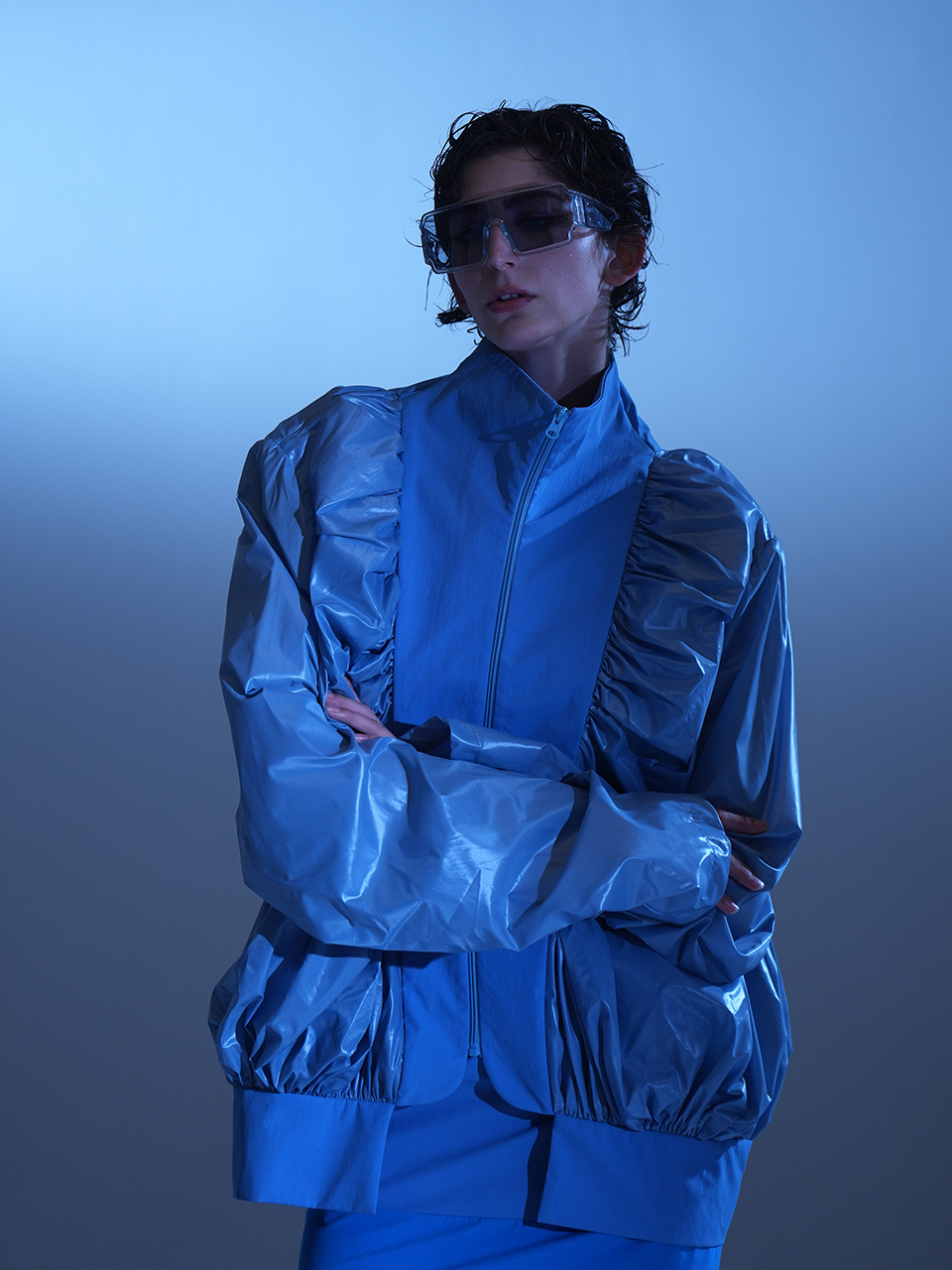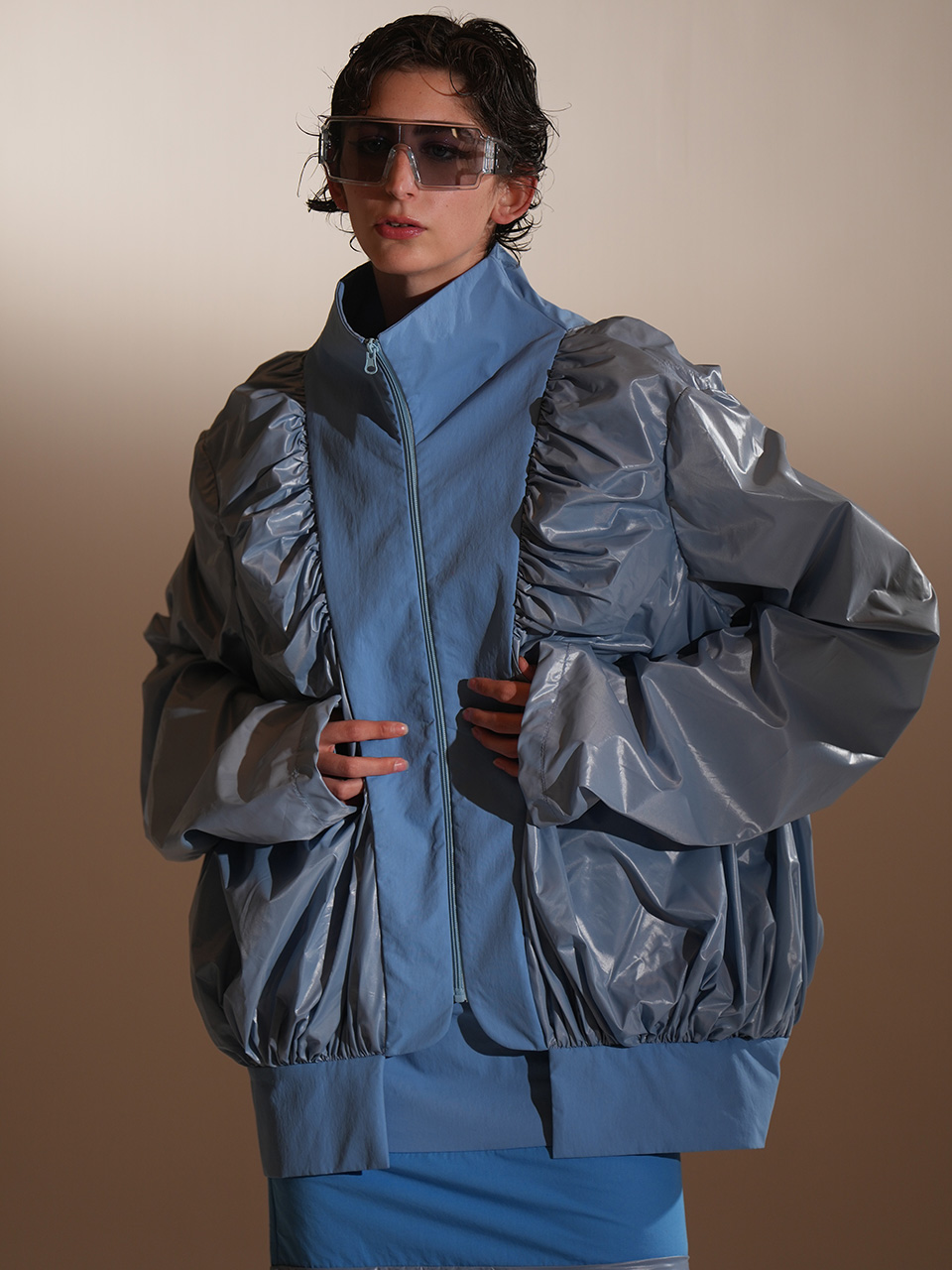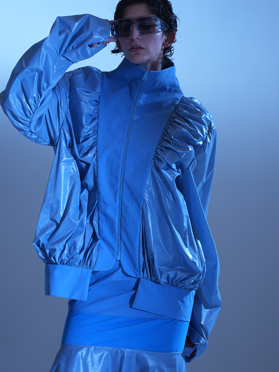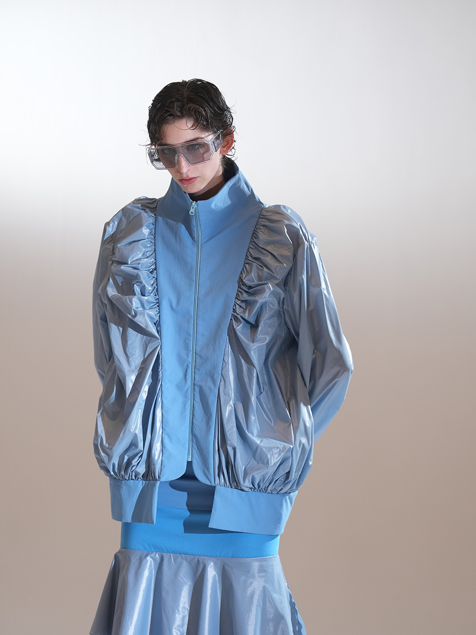 大面积的抽褶设计增加了服装的立体感和灵动性,极具辨识度。细腻的褶裥与主面料交织,动静结合,碰撞出独特火花。宽松的版型展现出潇洒与青春气息。