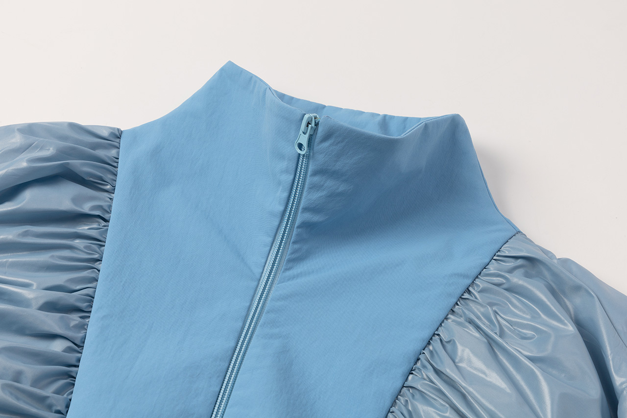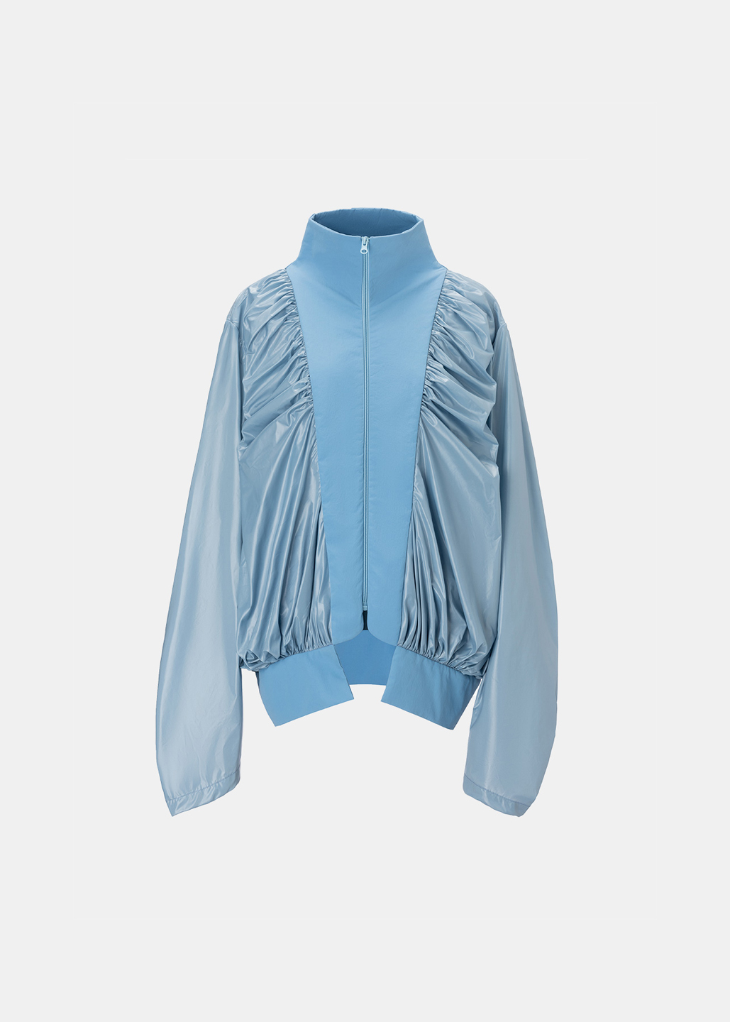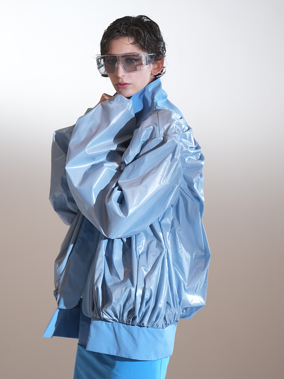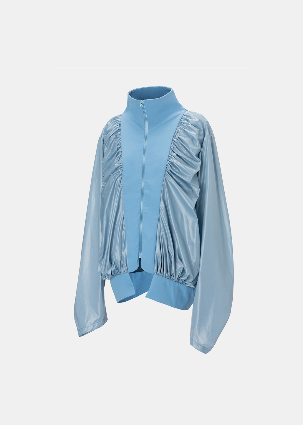 大面积的抽褶设计增加了服装的立体感和灵动性,极具辨识度。细腻的褶裥与主面料交织,动静结合,碰撞出独特火花。宽松的版型展现出潇洒与青春气息。