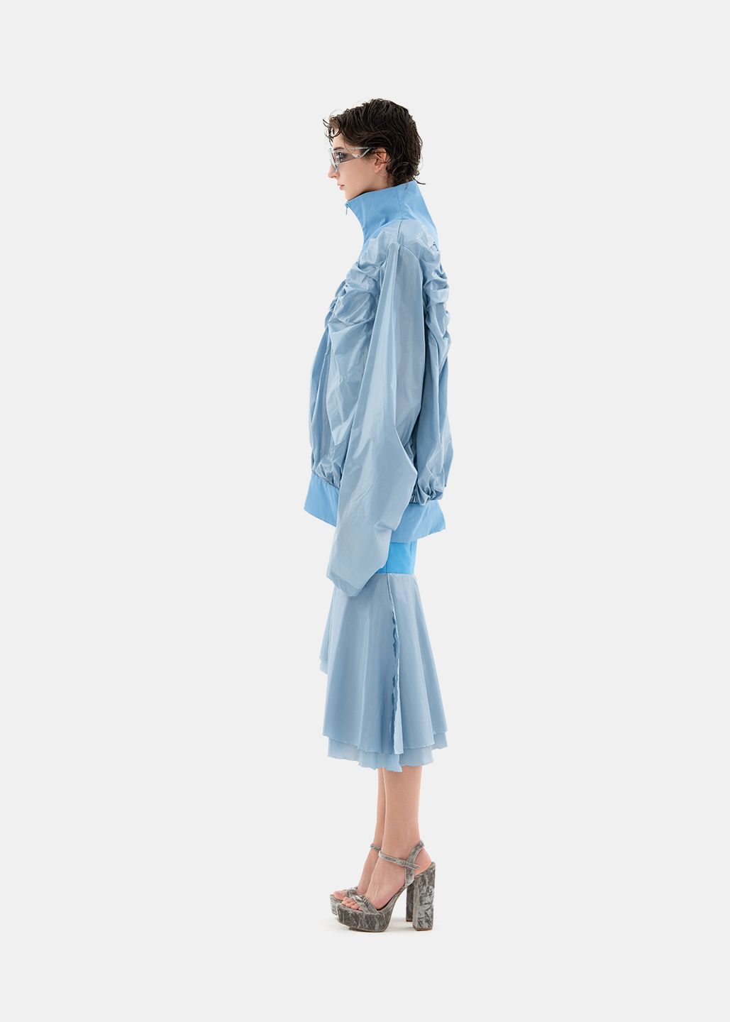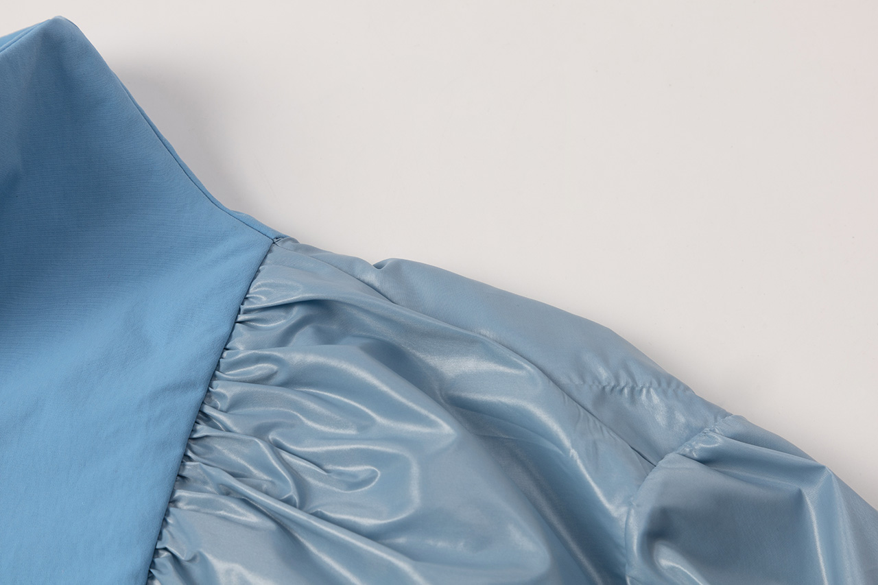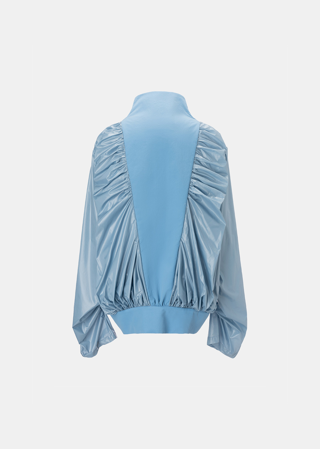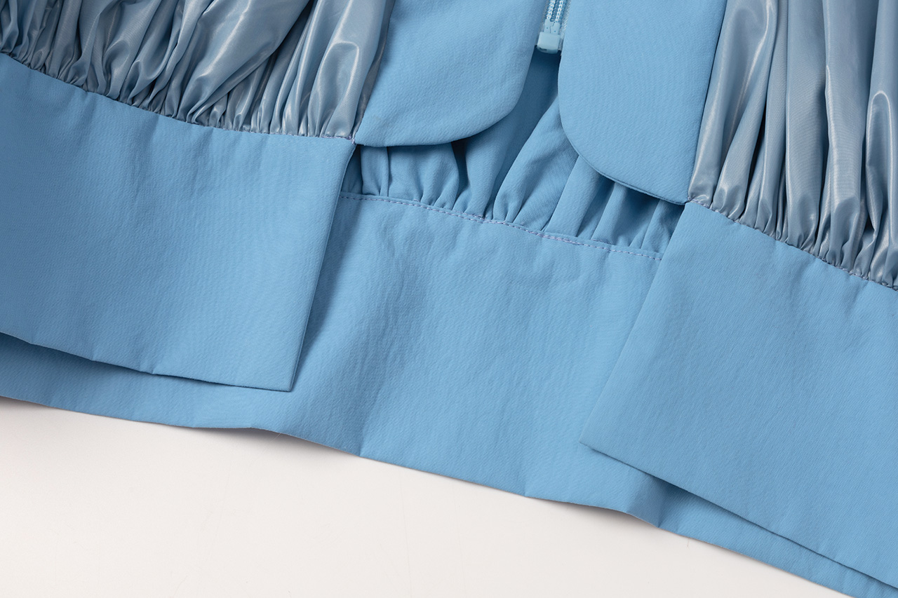 大面积的抽褶设计增加了服装的立体感和灵动性,极具辨识度。细腻的褶裥与主面料交织,动静结合,碰撞出独特火花。宽松的版型展现出潇洒与青春气息。