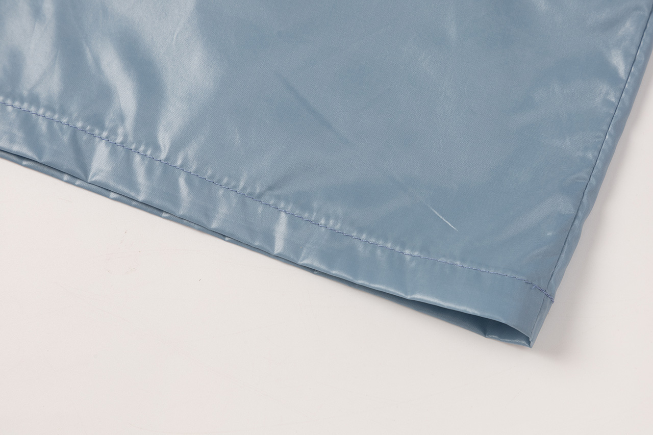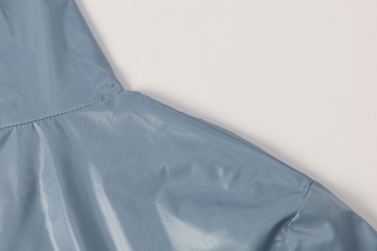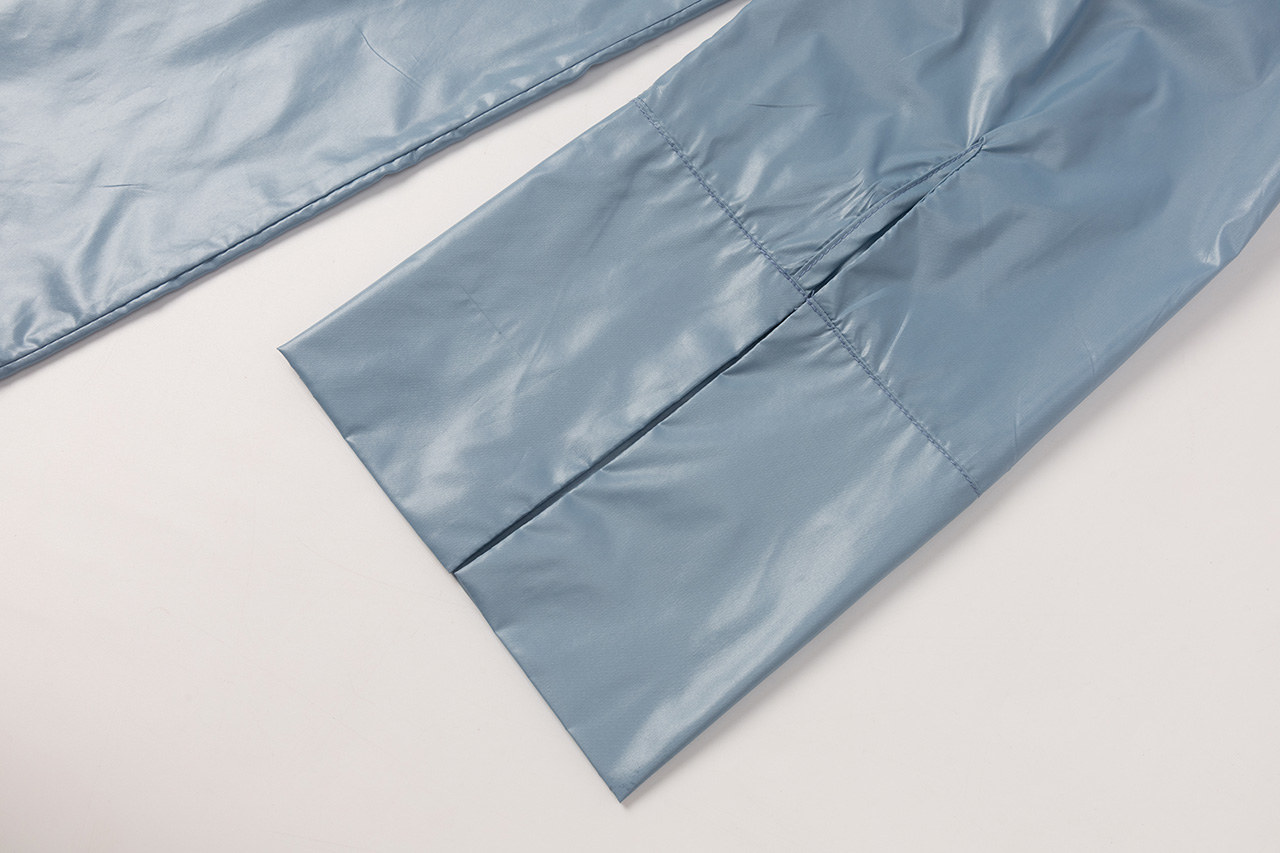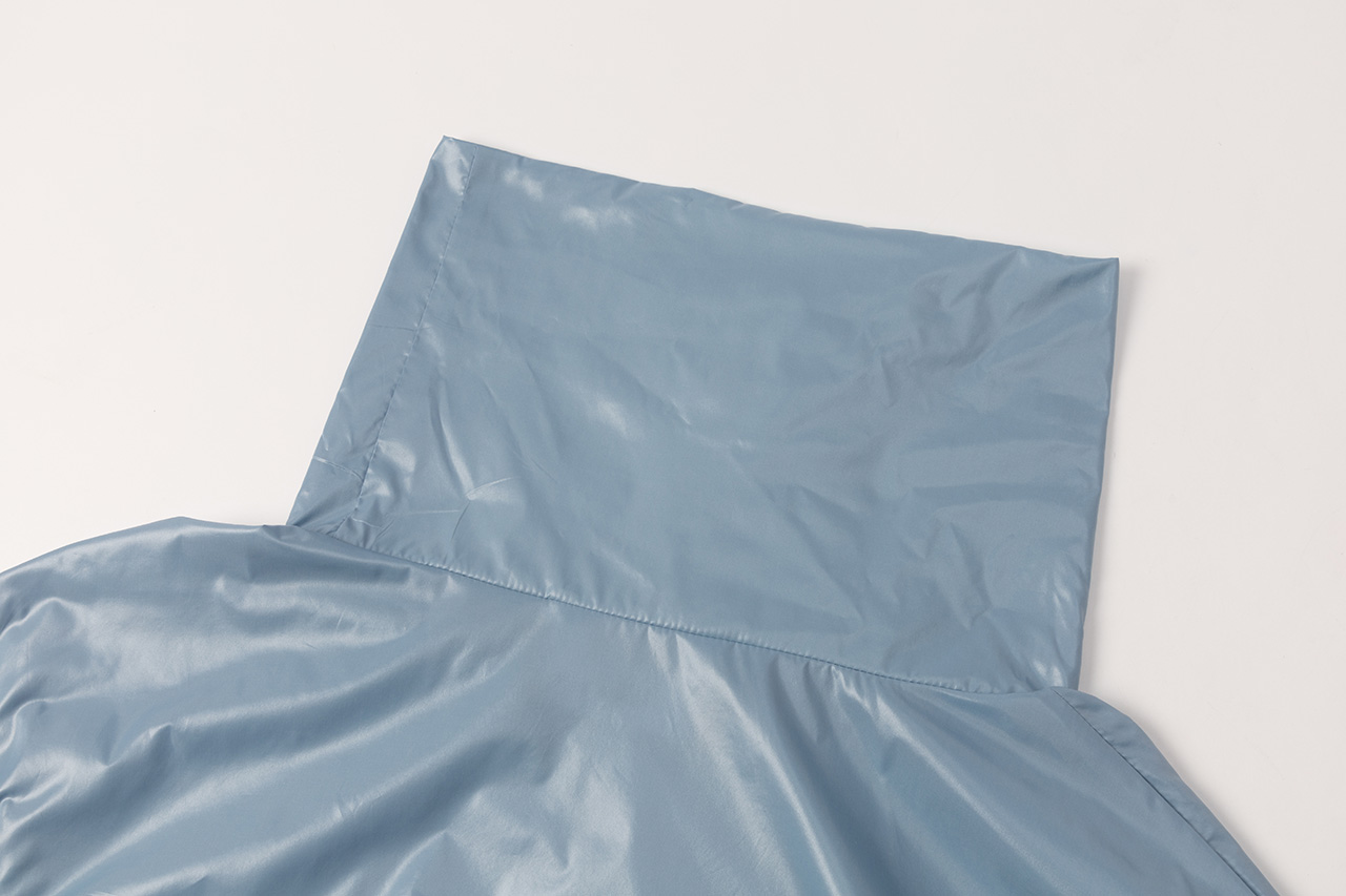这款雨衣面料不仅耐磨抗刮,还呈现出独特的光泽感。立领设计简洁利落,袖口的长卡其细节与主面料相呼应,展现风格统一。整件衣服没有多余的装饰,回归最纯粹的状态,只为突出面料的质感和设计的简约之美。