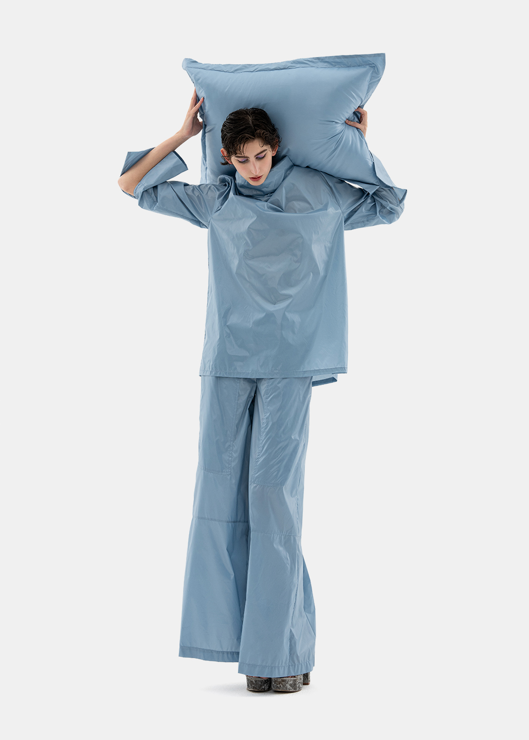 整套设计如同风暴前的宁静,面料垂坠感极佳,能清晰展现人体曲线与动态。没有繁复装饰,干净利落。随风行走时,仿佛能听到它们独特的韵律。