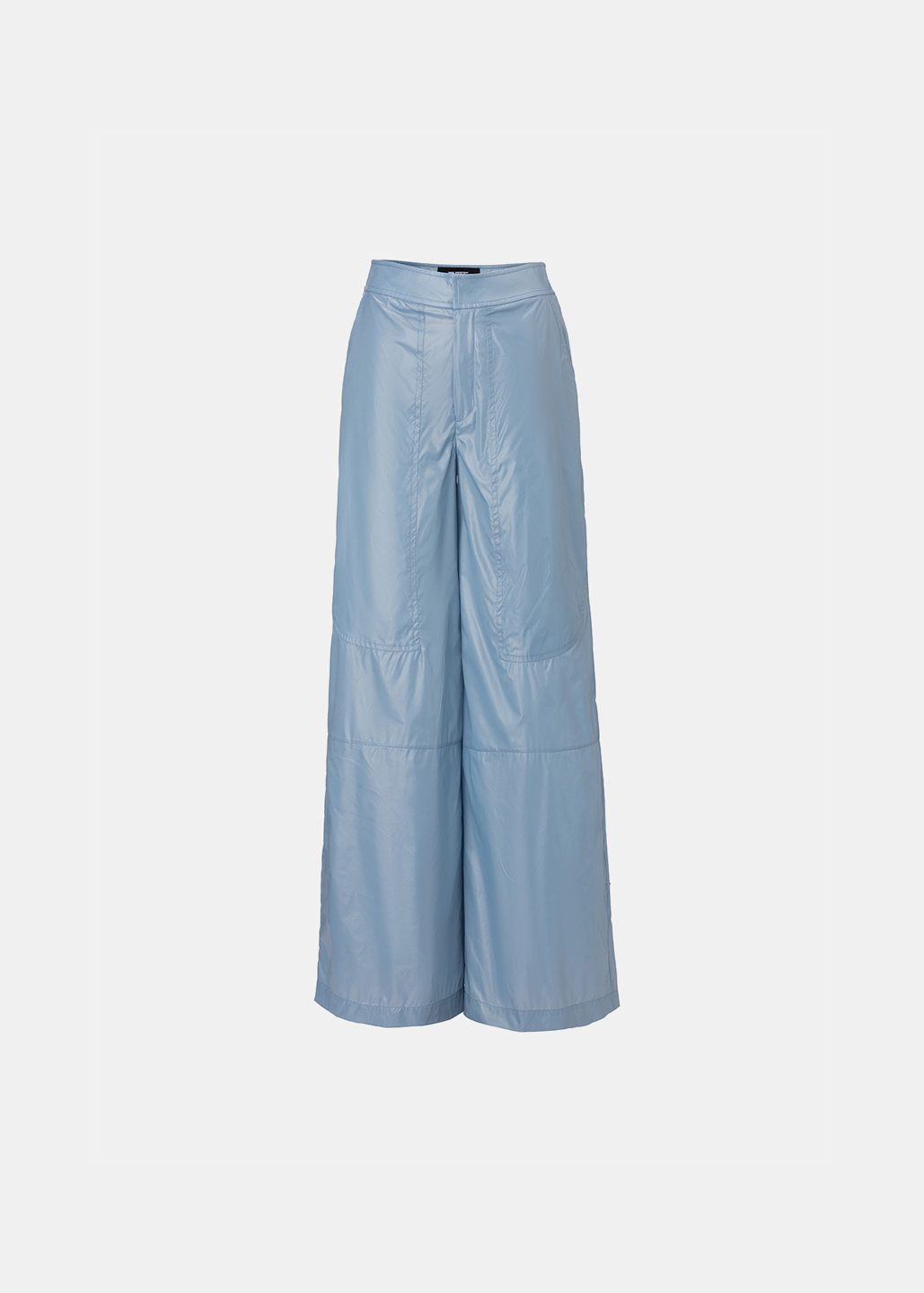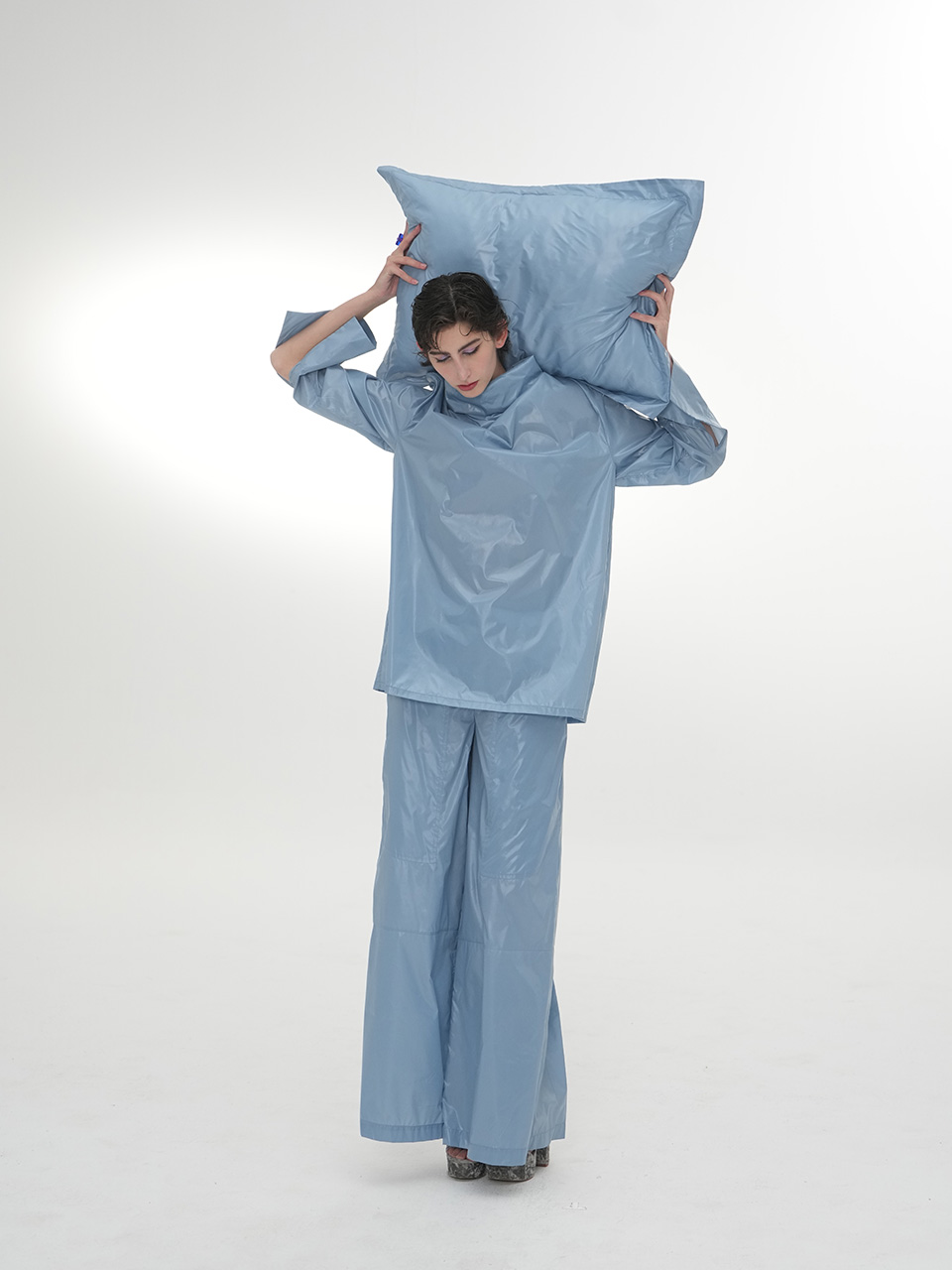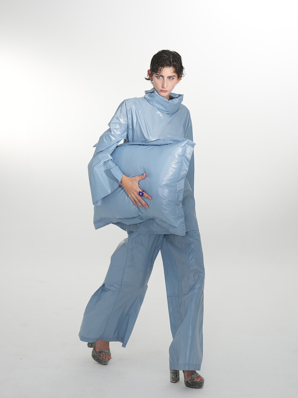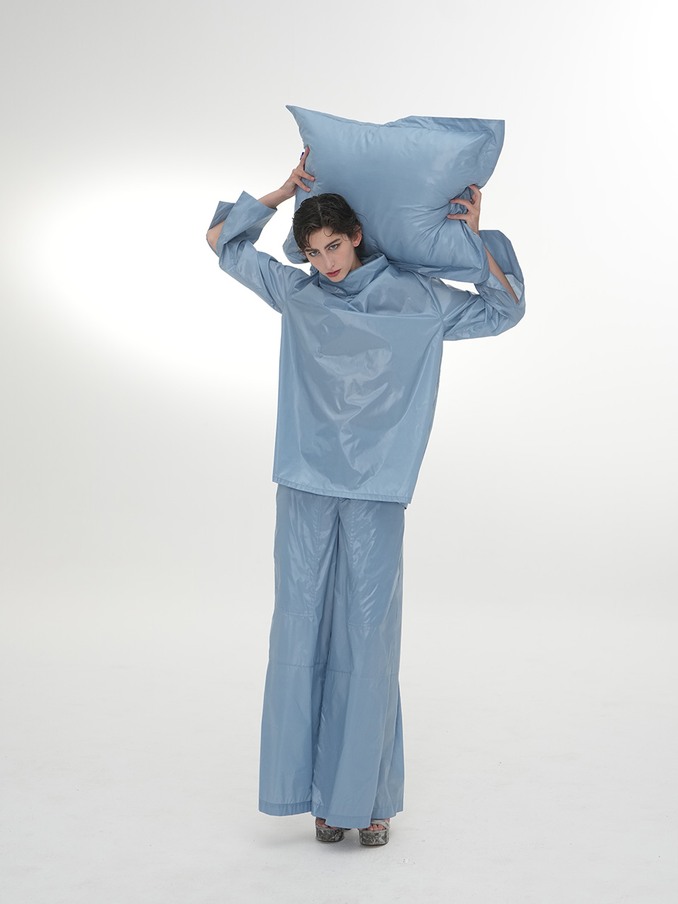 雾蓝色调柔和优雅,与裤装的动态线条相得益彰。精细的剪裁与缝线工艺增添了裤装的层次感与立体感,为穿着者提供独特的时尚表达。