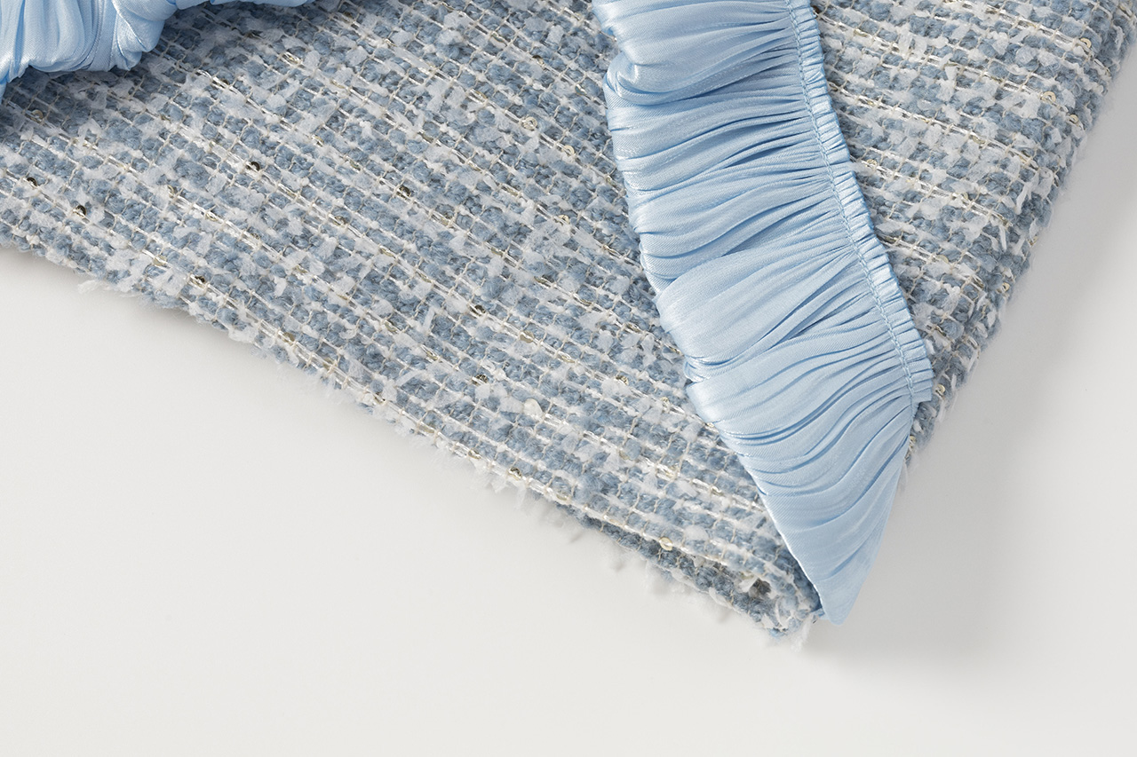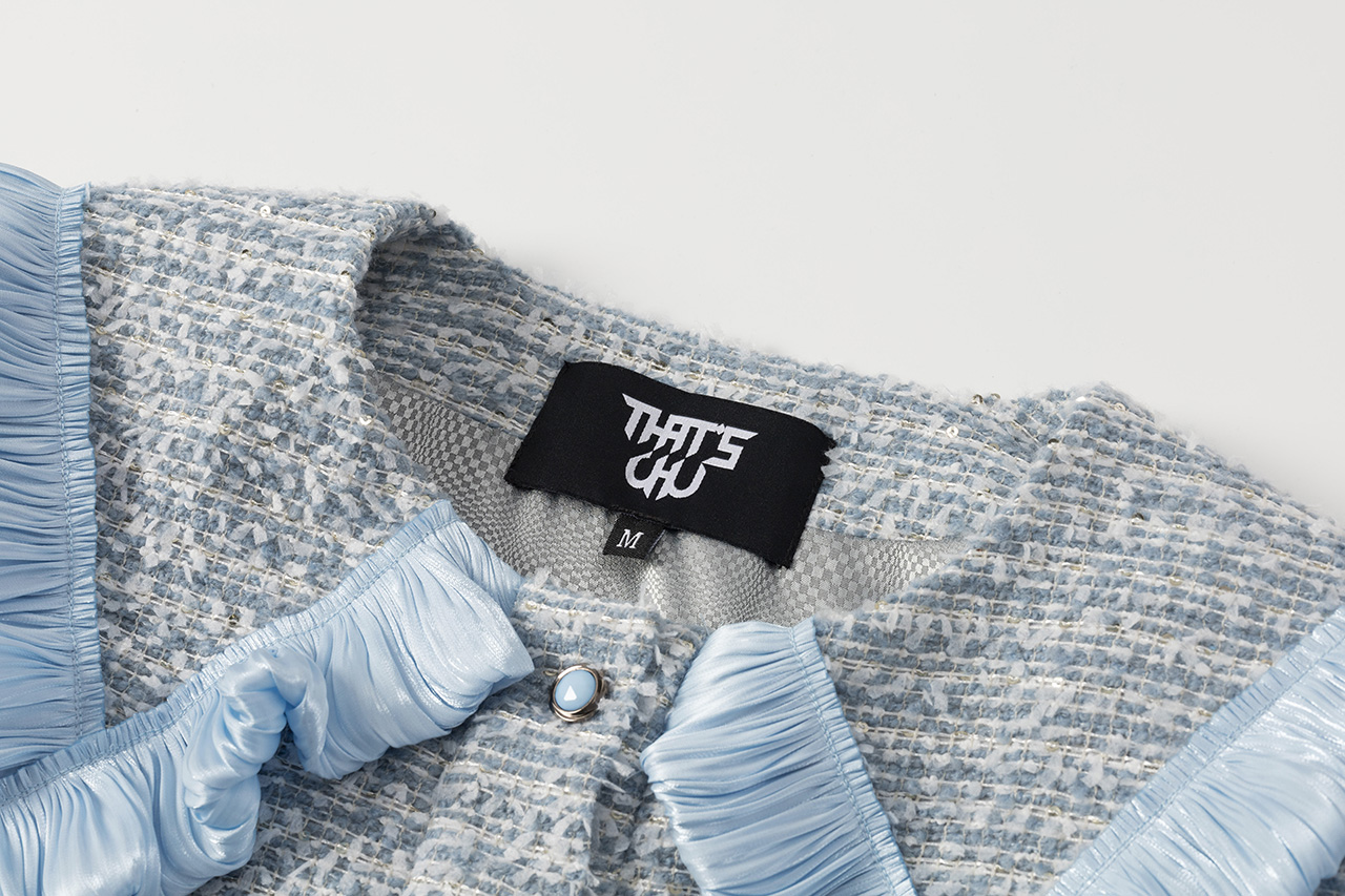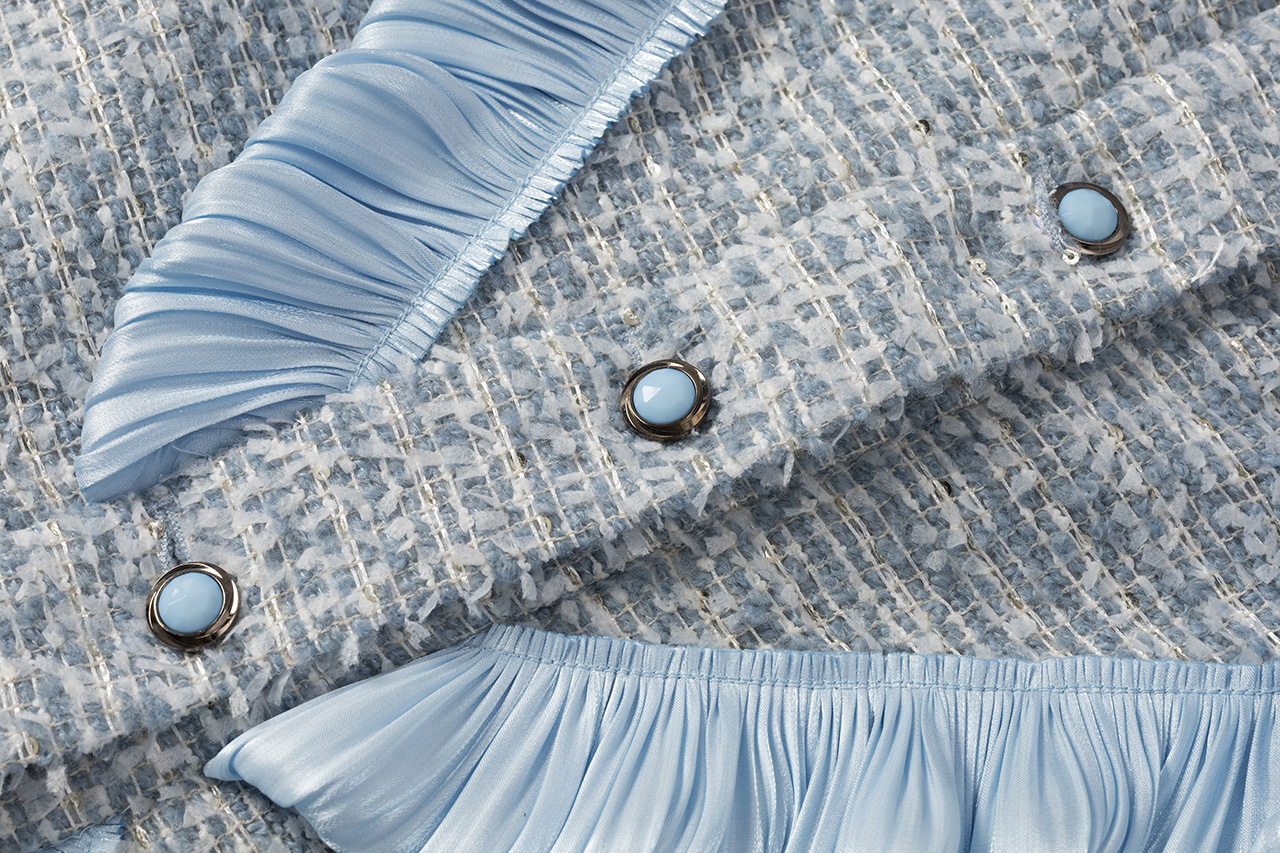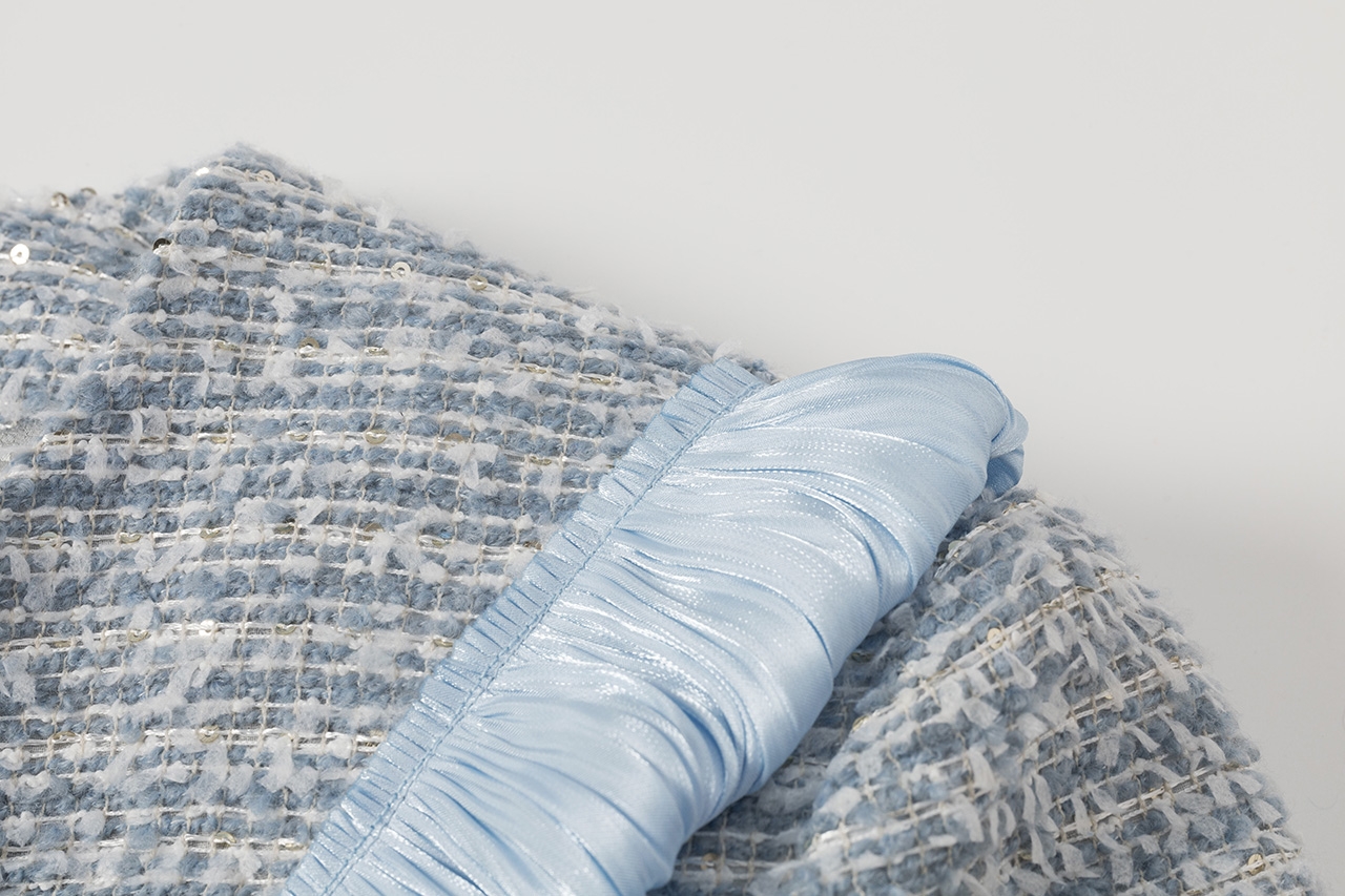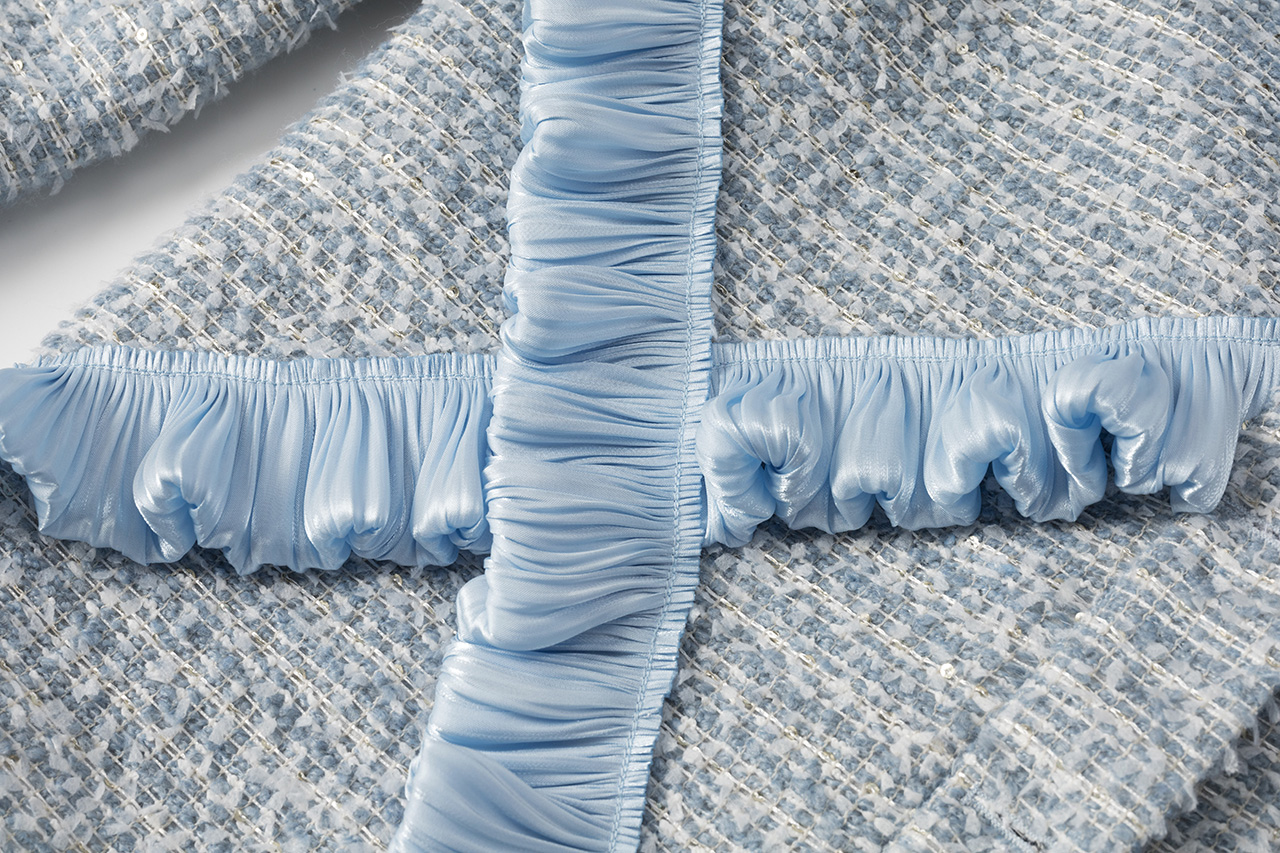 采用高品质粗花呢面料,触感柔软,质地细腻,展现出高端质感。浅蓝色蕾丝以独特的X形蜿蜒排列,为整体增添活泼灵动的气息,宛如海浪轻拍海岸。利落的剪裁、挺括的版型与精致的纽扣,每一处细节都彰显小香风的精致与优雅。