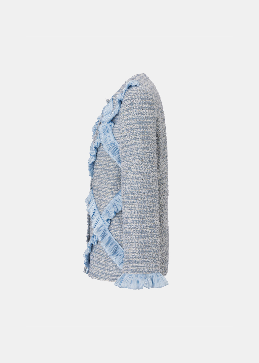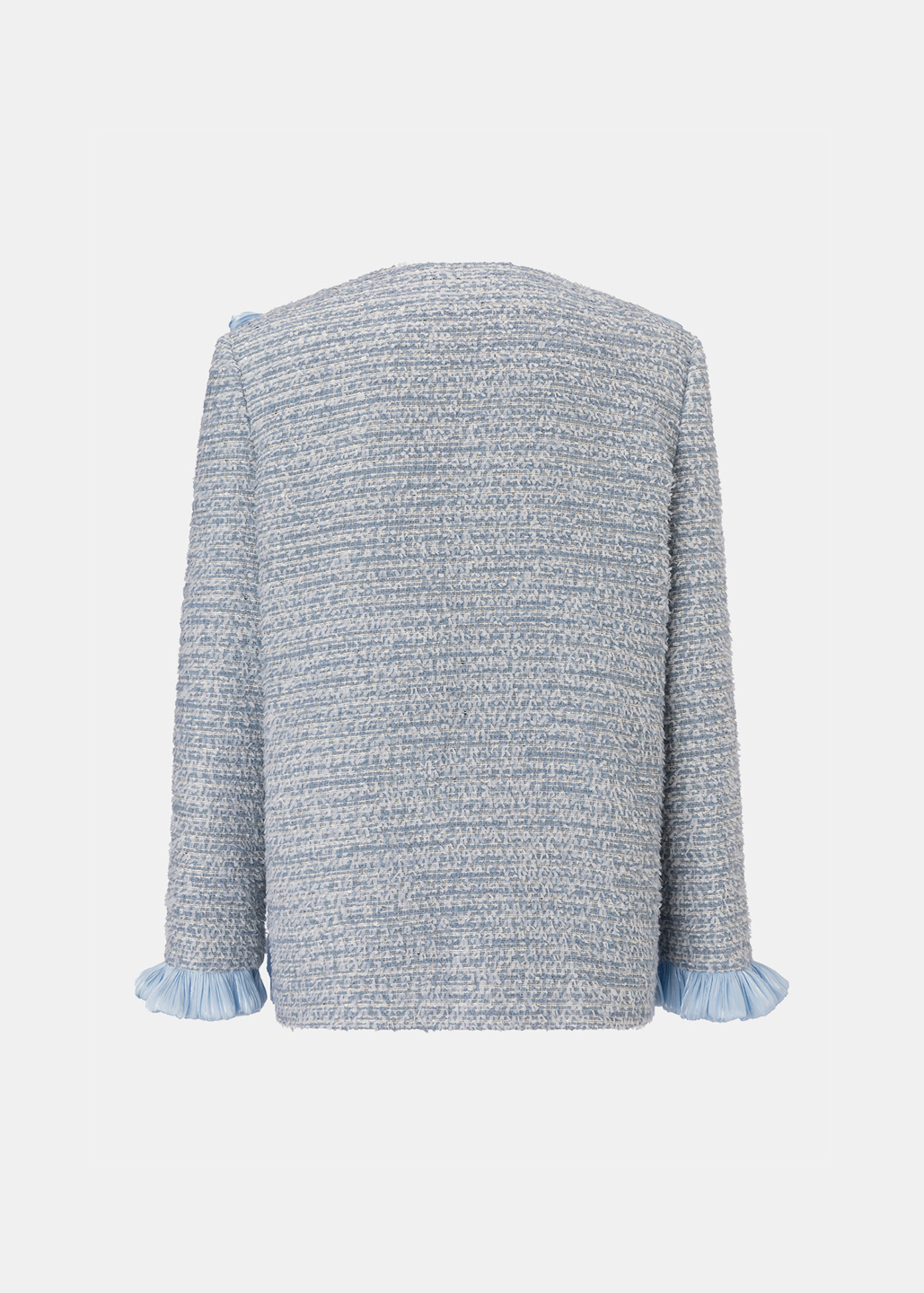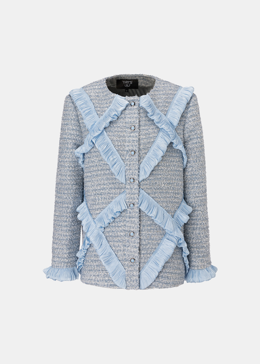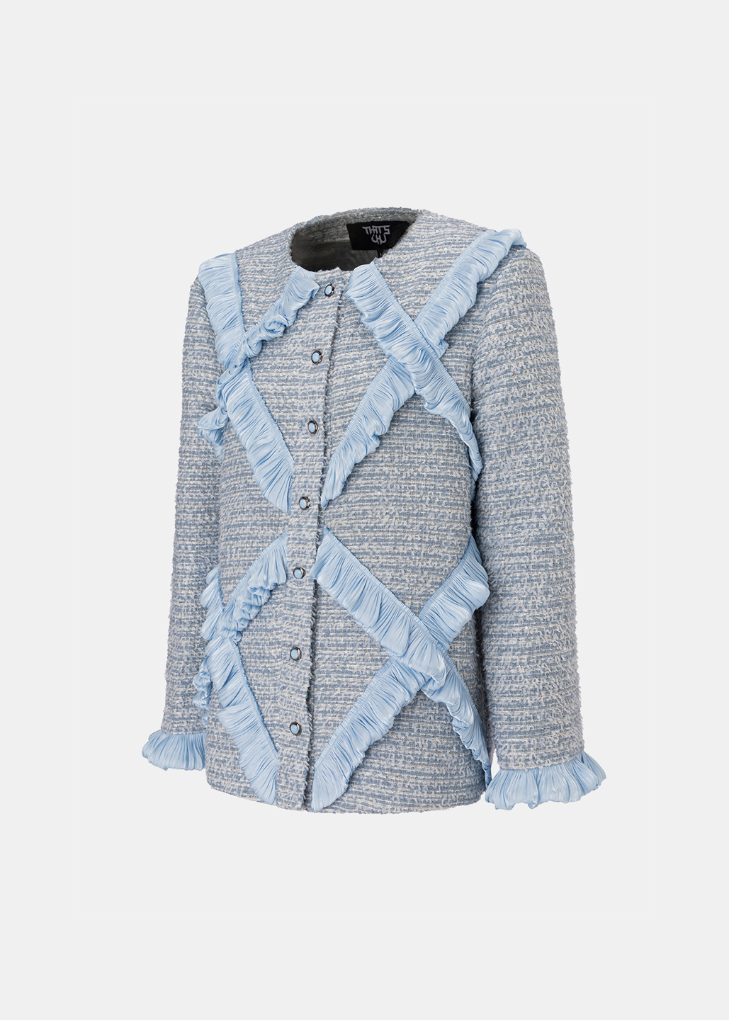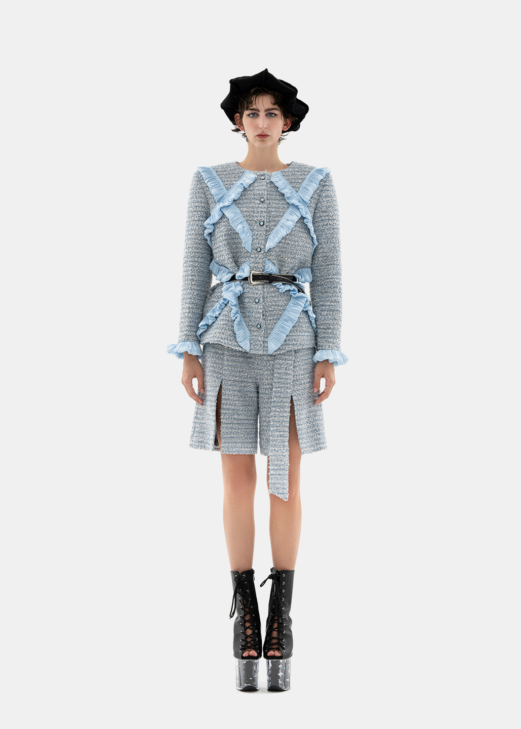 采用高品质粗花呢面料,触感柔软,质地细腻,展现出高端质感。浅蓝色蕾丝以独特的X形蜿蜒排列,为整体增添活泼灵动的气息,宛如海浪轻拍海岸。利落的剪裁、挺括的版型与精致的纽扣,每一处细节都彰显小香风的精致与优雅。