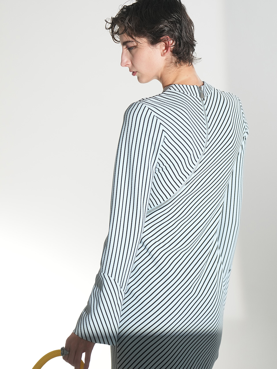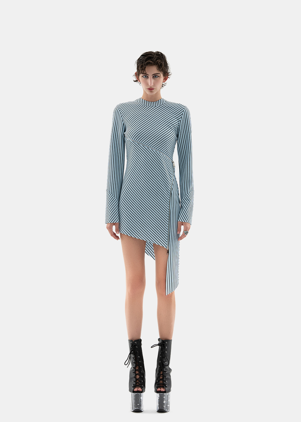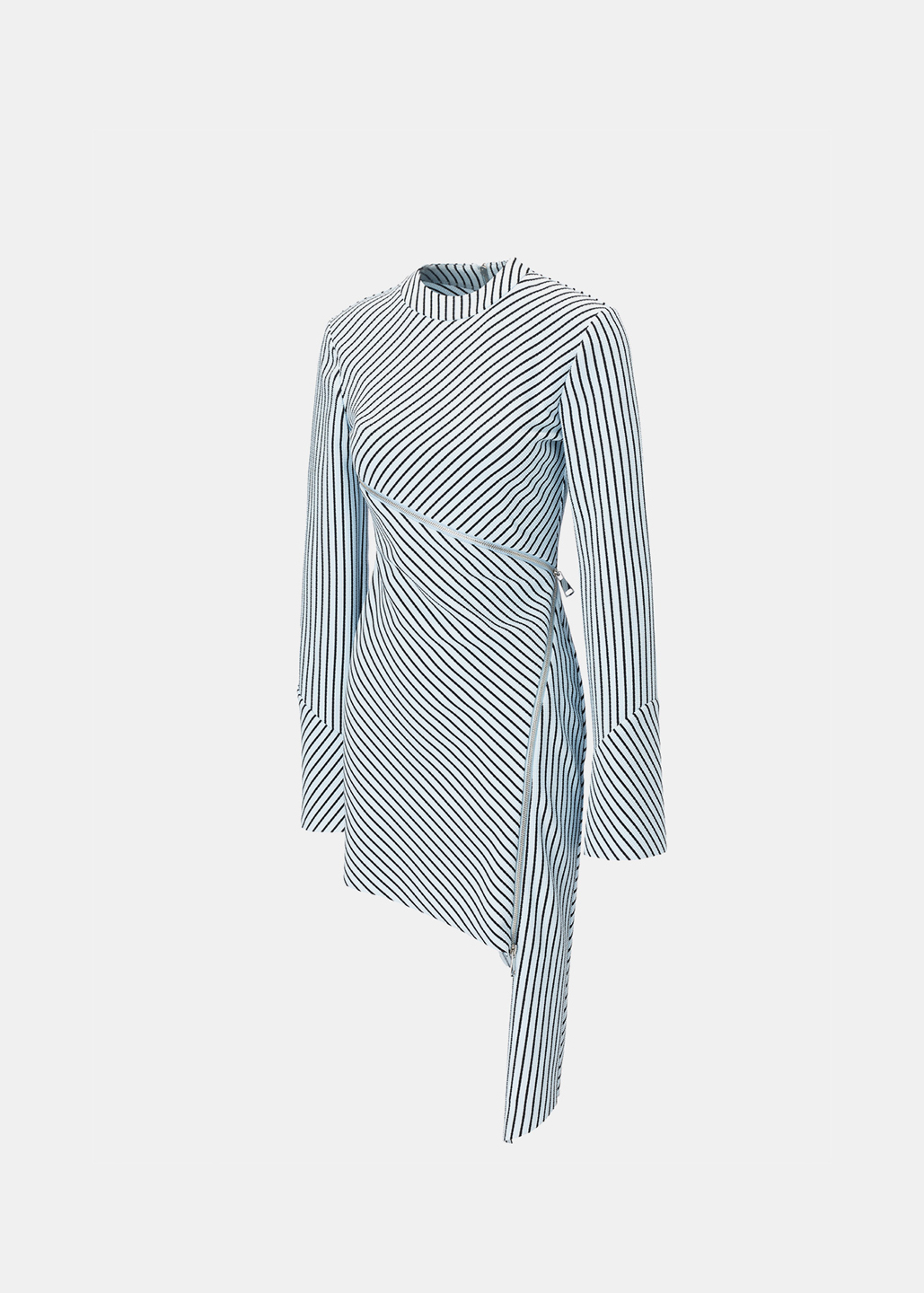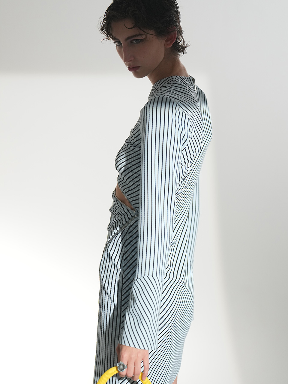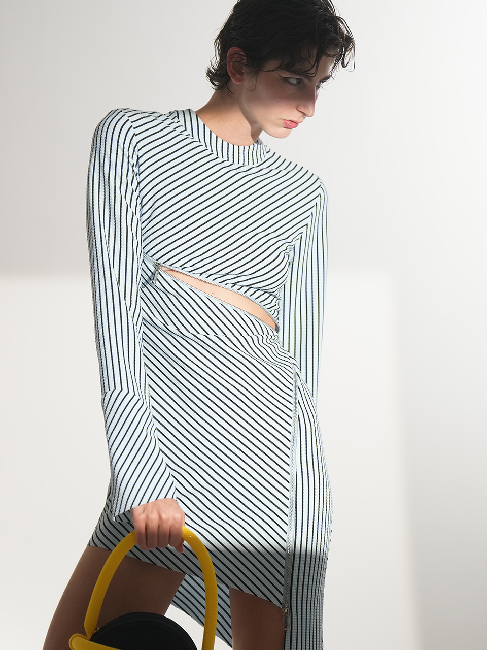 这款连衣裙时尚前卫,创意大胆,胸部下方的拉链成为别致的装饰元素。从一侧延伸至腿部的拉链长达1米,贯穿整件连衣裙,成为视觉焦点。随着拉链将服装分割,面料的质感也随之变化,营造出层次丰富的视觉效果。