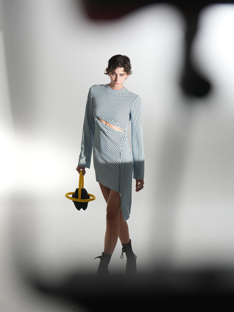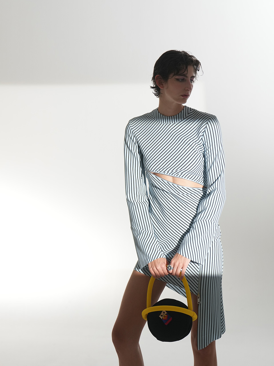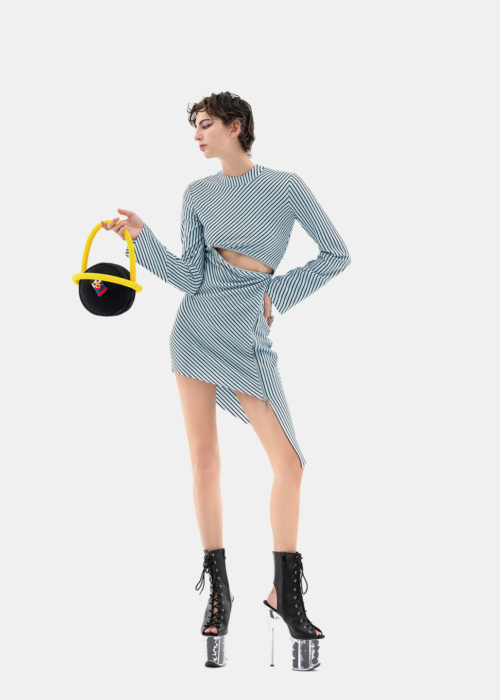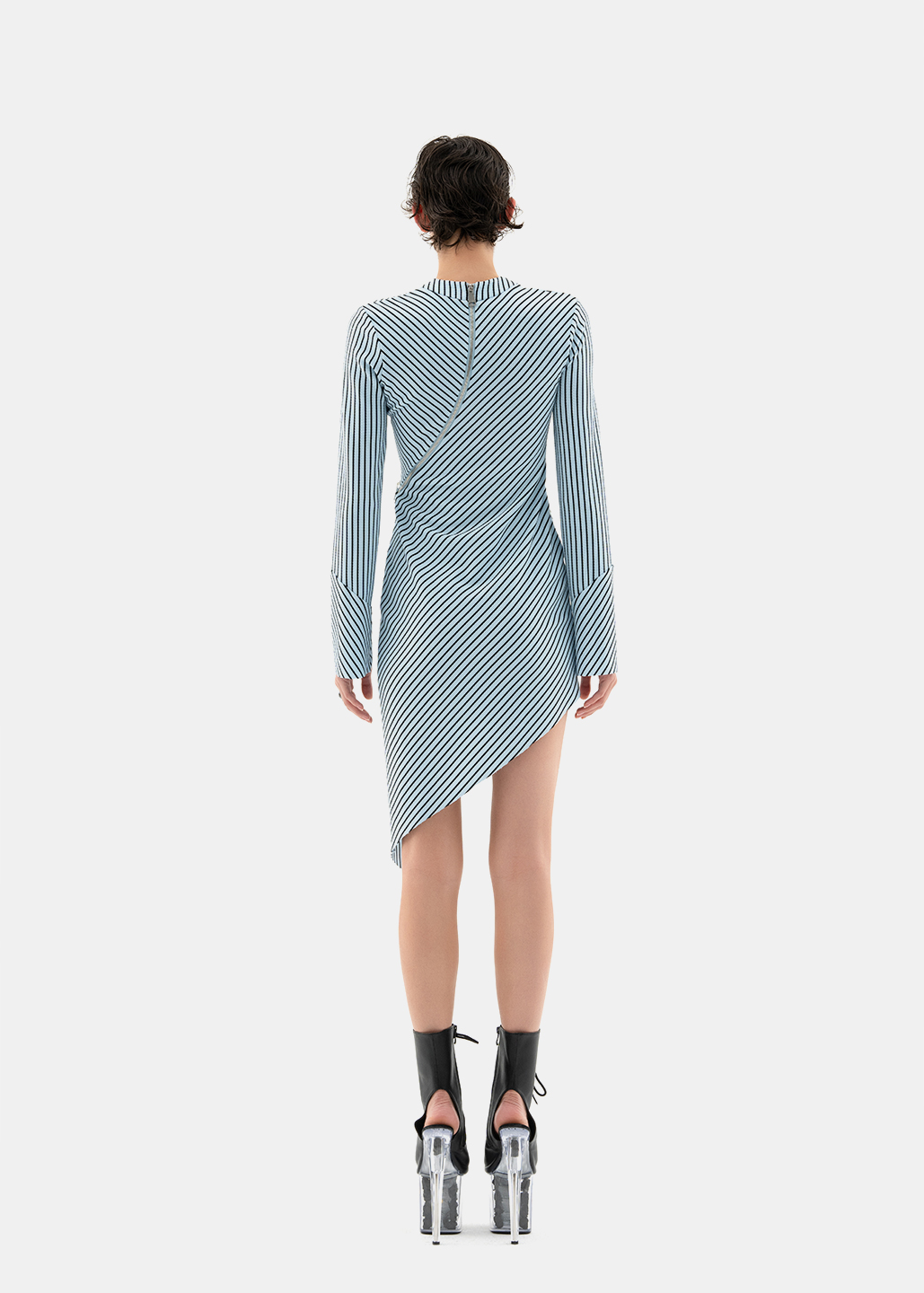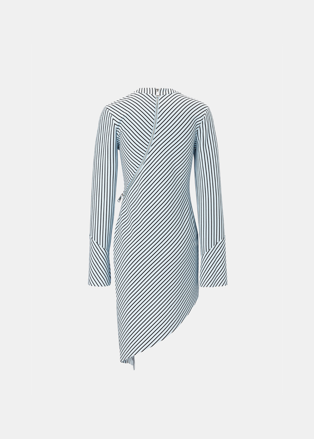这款连衣裙时尚前卫,创意大胆,胸部下方的拉链成为别致的装饰元素。从一侧延伸至腿部的拉链长达1米,贯穿整件连衣裙,成为视觉焦点。随着拉链将服装分割,面料的质感也随之变化,营造出层次丰富的视觉效果。