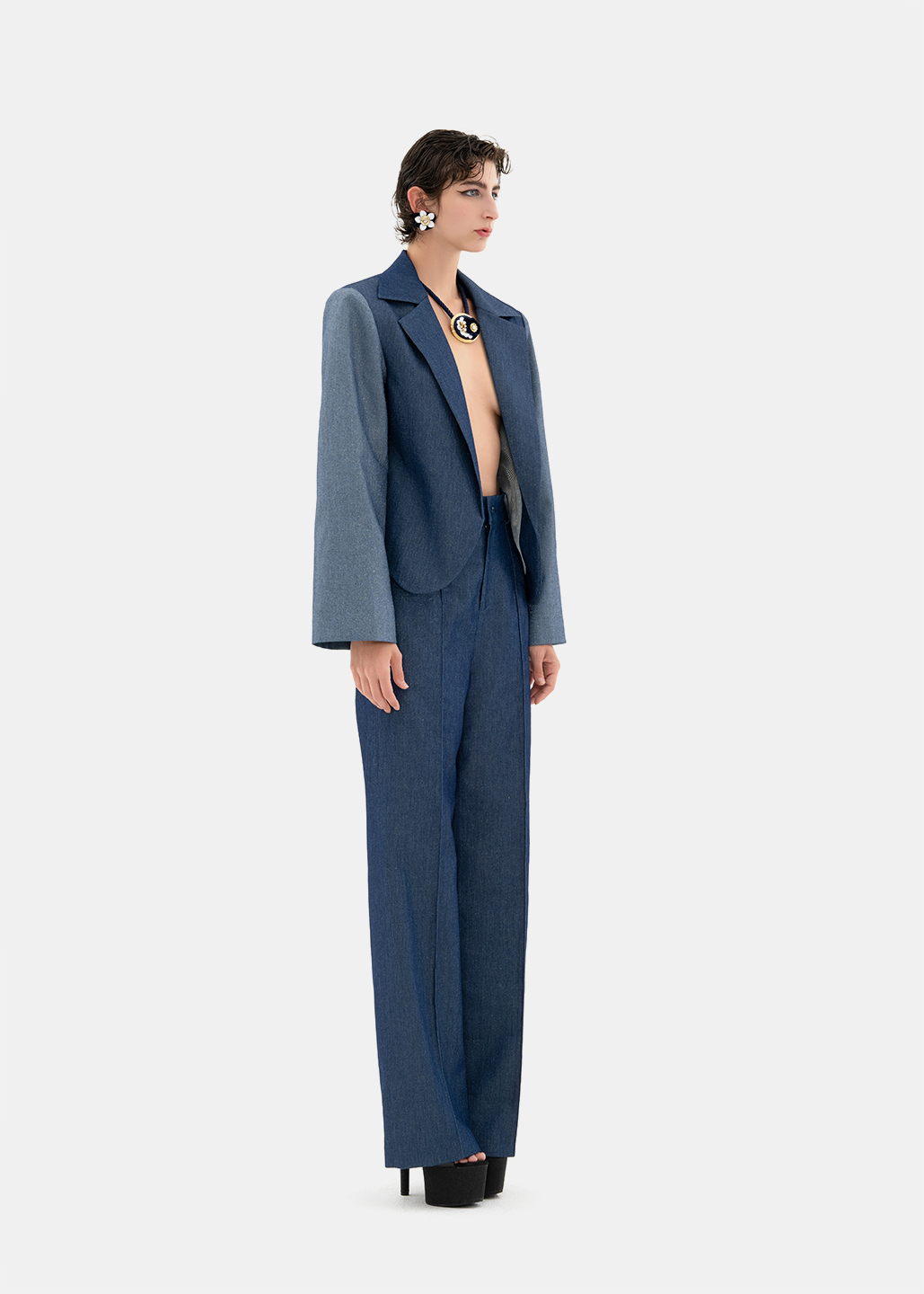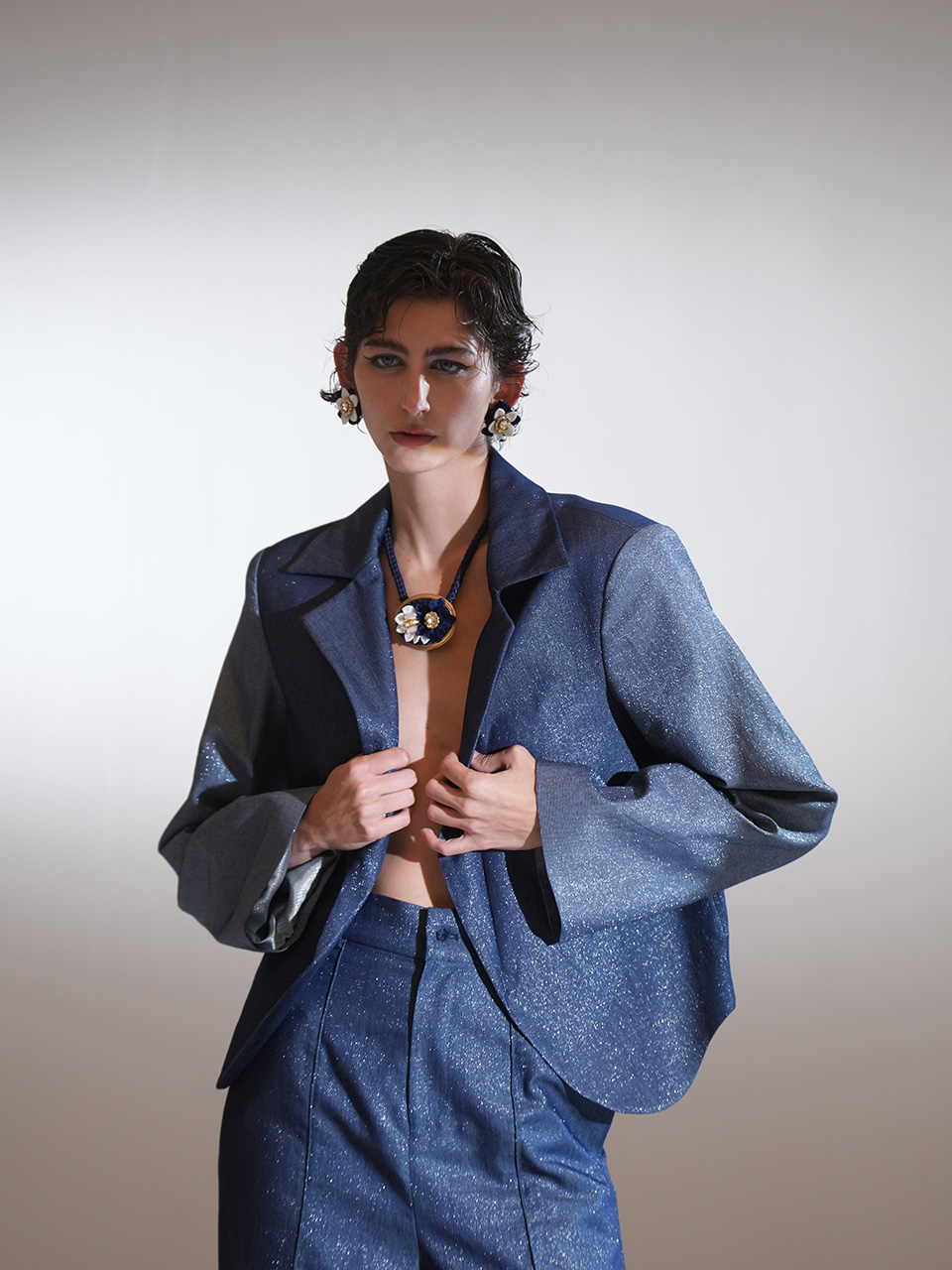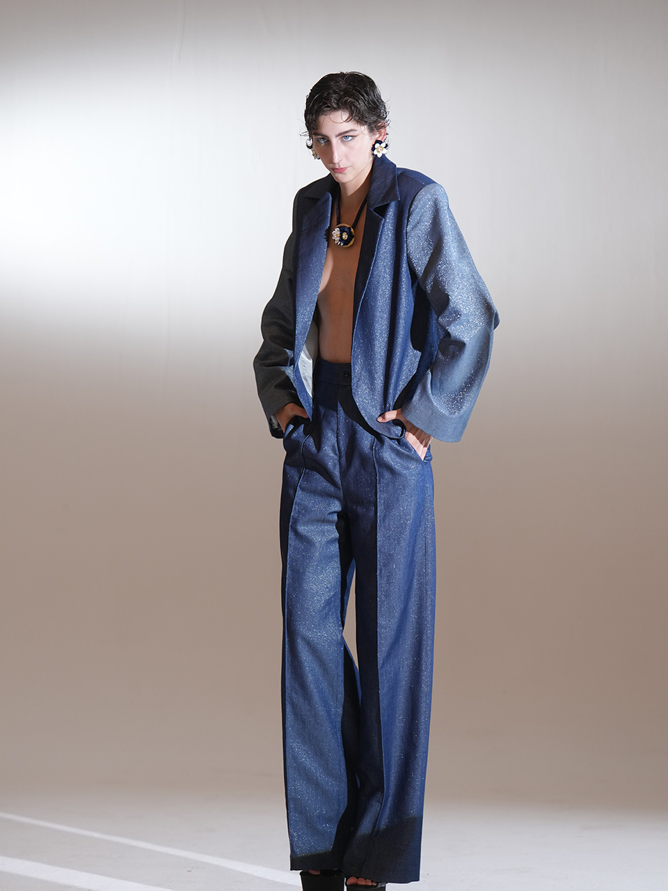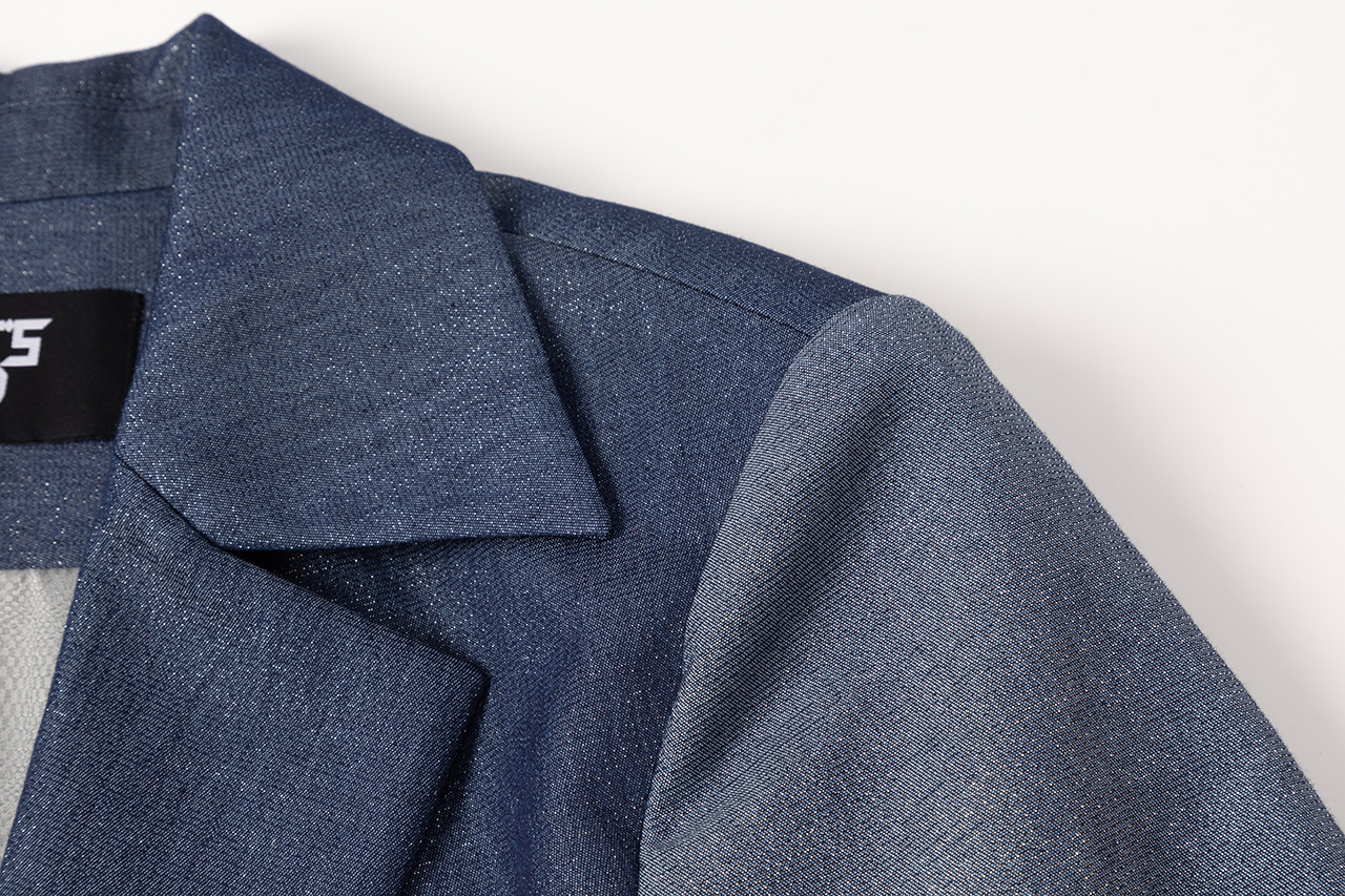 整套服装采用闪亮牛仔面料制成,不仅在日常穿着中独具一格,更以独特风格引人注目。不规则分布的闪亮丝线在不同光线下闪耀跳跃。小西装与裤装搭配,营造出修长的身材比例。