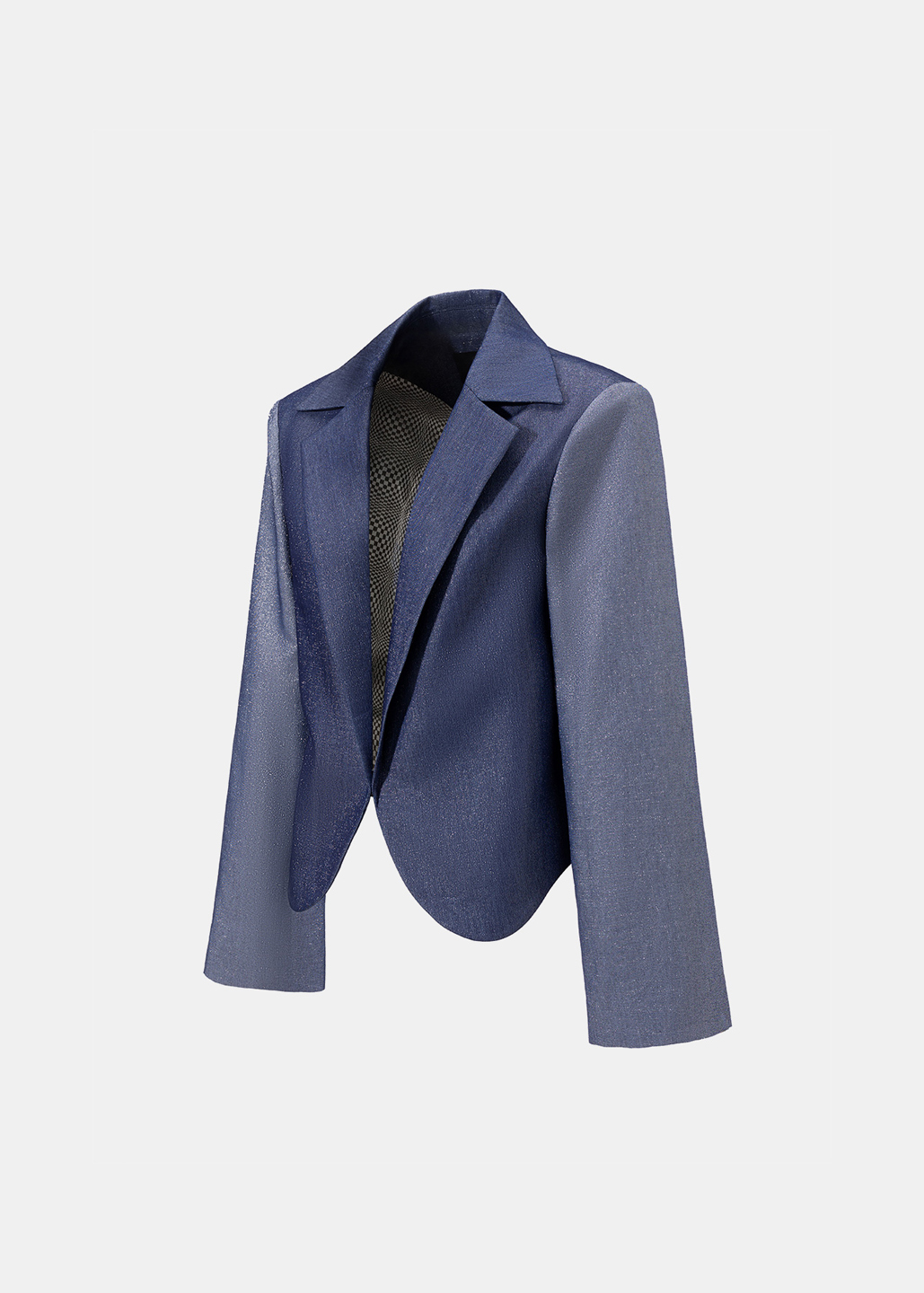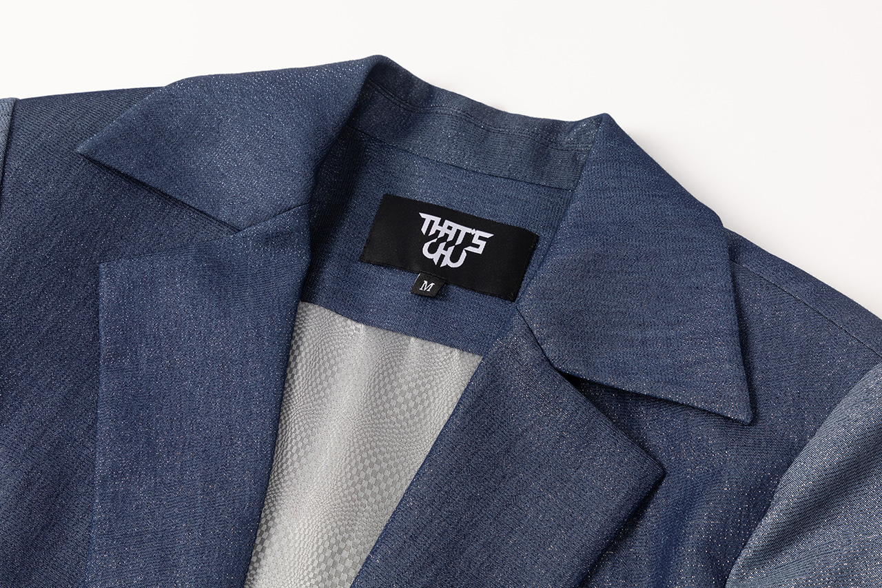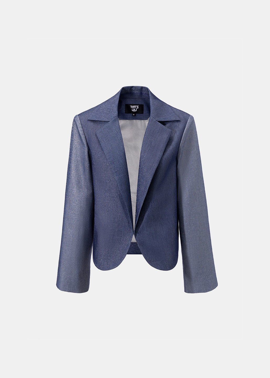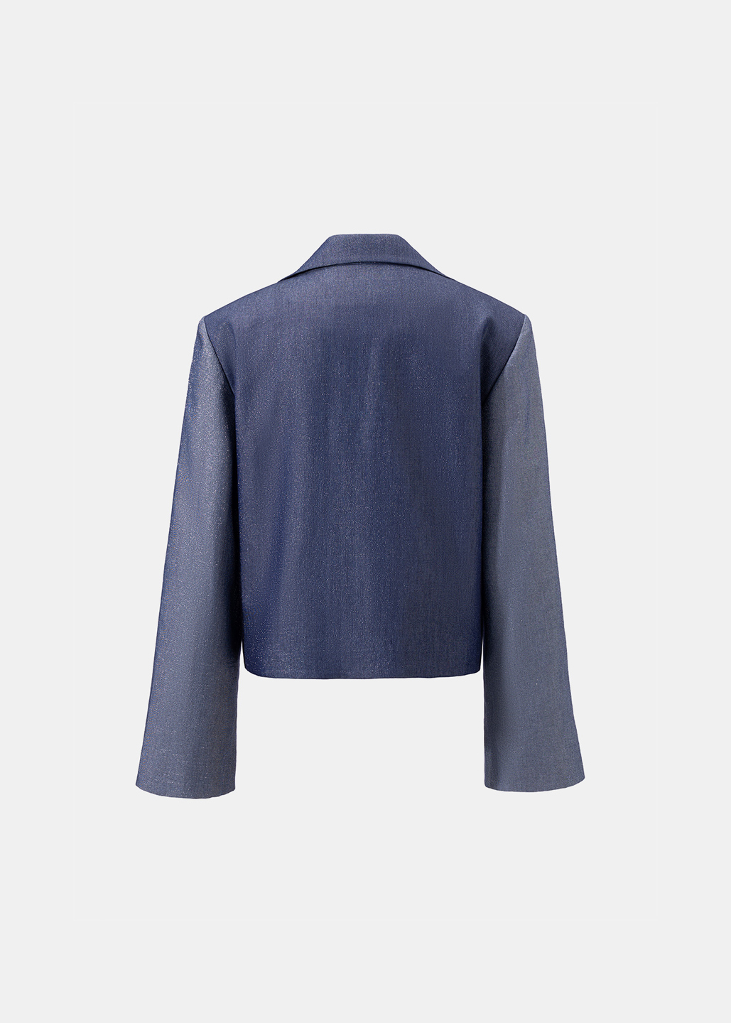 整套服装采用闪亮牛仔面料制成,不仅在日常穿着中独具一格,更以独特风格引人注目。不规则分布的闪亮丝线在不同光线下闪耀跳跃。小西装与裤装搭配,营造出修长的身材比例。