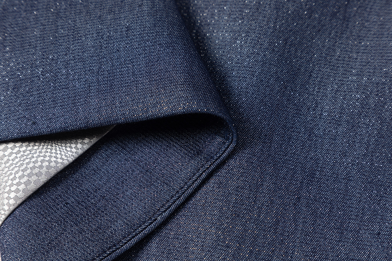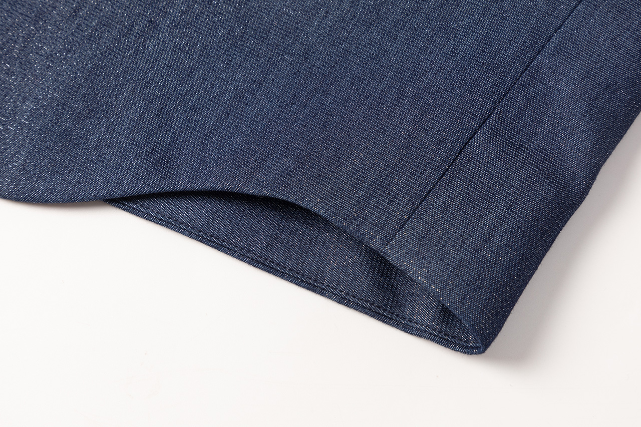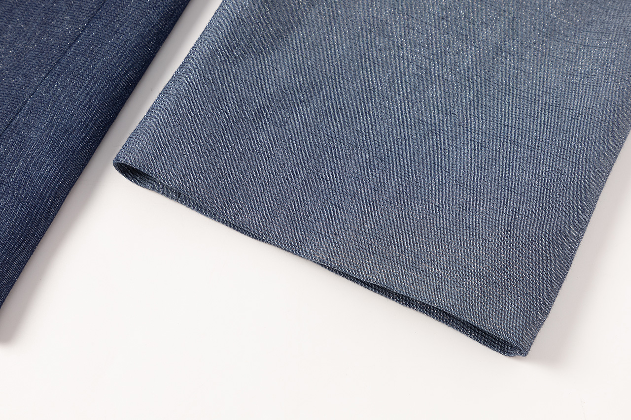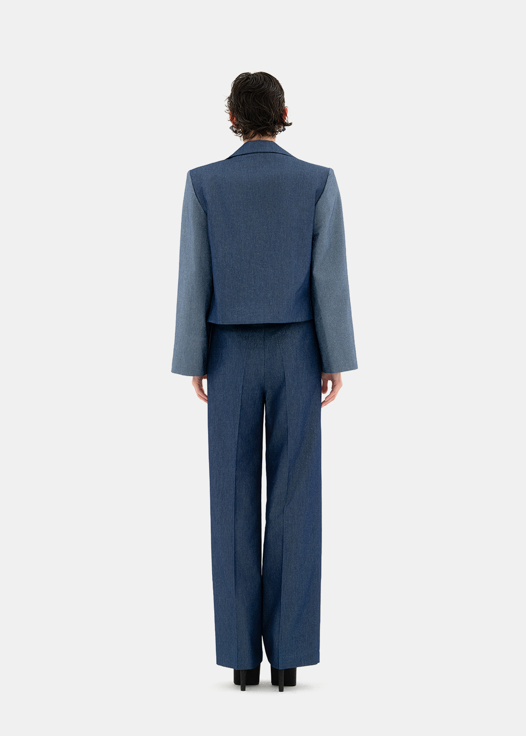 整套服装采用闪亮牛仔面料制成,不仅在日常穿着中独具一格,更以独特风格引人注目。不规则分布的闪亮丝线在不同光线下闪耀跳跃。小西装与裤装搭配,营造出修长的身材比例。