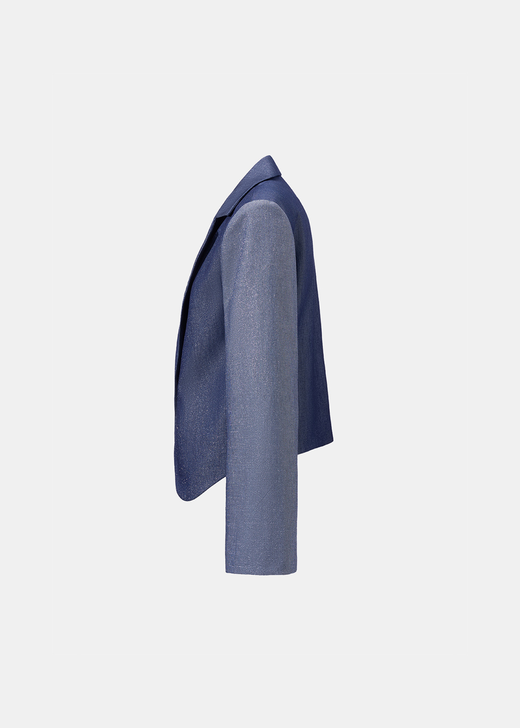 这款小西装采用独特牛仔面料制成,硬挺耐磨,细看其中融入了独特的银线,如跳动的银河,赋予服装奢华独特的视觉效果,打破传统牛仔的单调感。无扣设计简约大方,凸显服装的休闲本质。