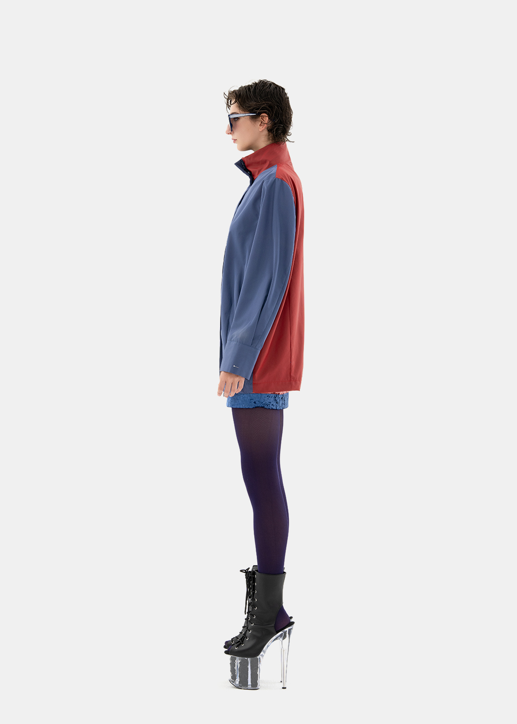 整套服装以创新设计诠释前卫精神,红蓝对比色展现无畏时尚态度。短裙的活力动感与外套的大气相结合,大胆吸睛,前卫感十足。