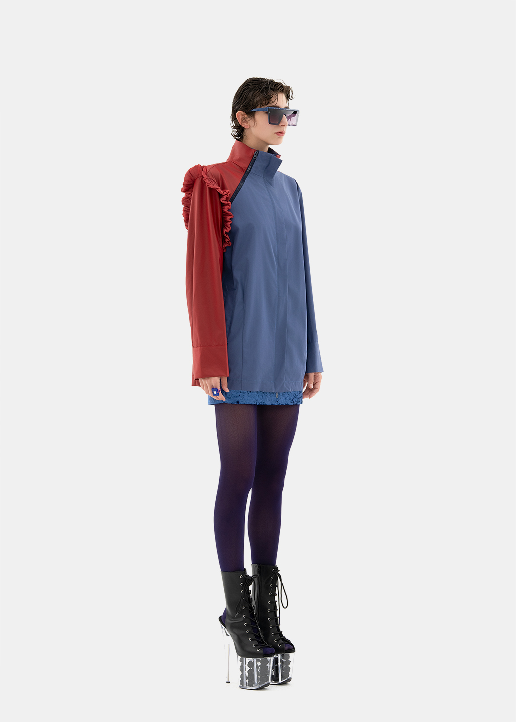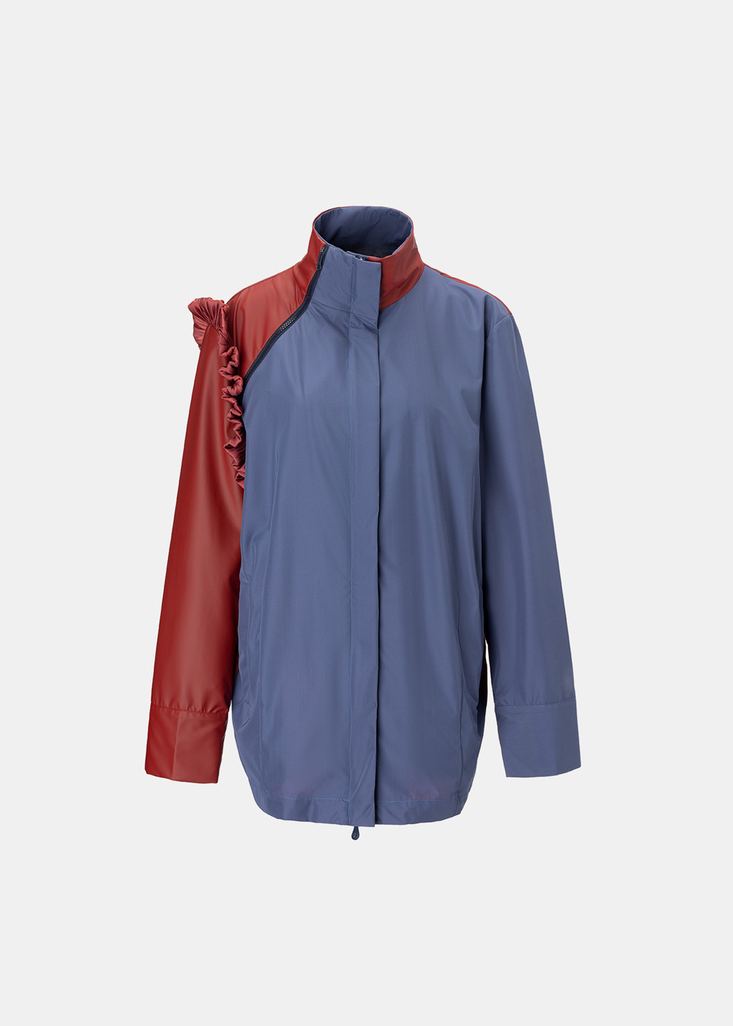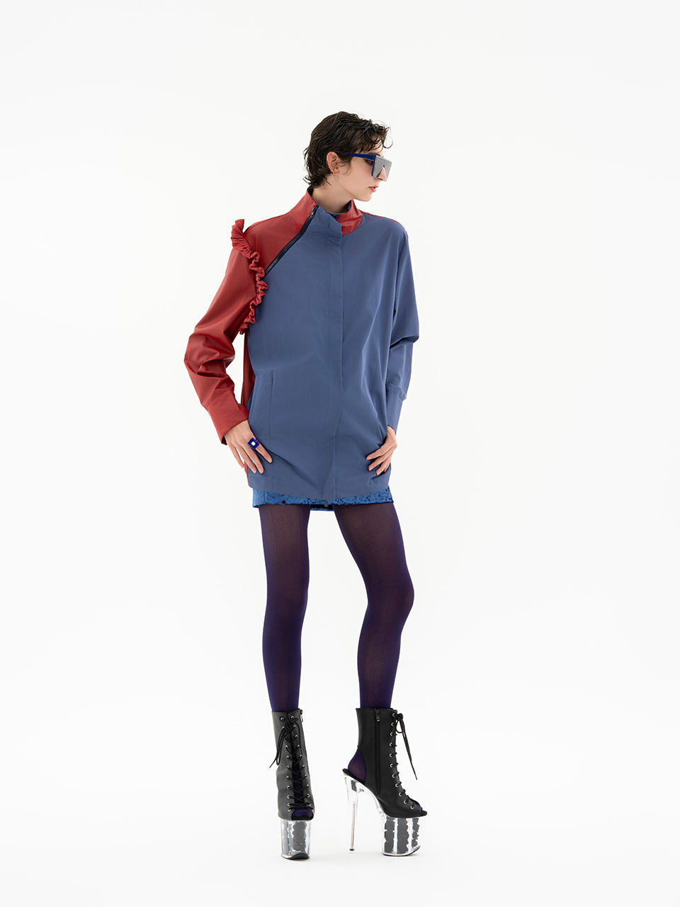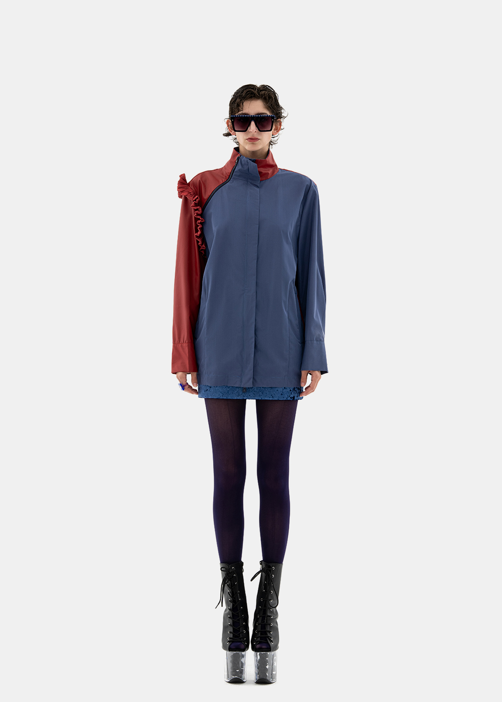 肩缝巧妙运用拉链缝线,轻轻一拉,展开红蓝交织的故事。单侧袖口点缀同花型精致蕾丝,随手臂摆动轻轻摇曳。外套面料结实耐磨,无惧困难,与众不同。