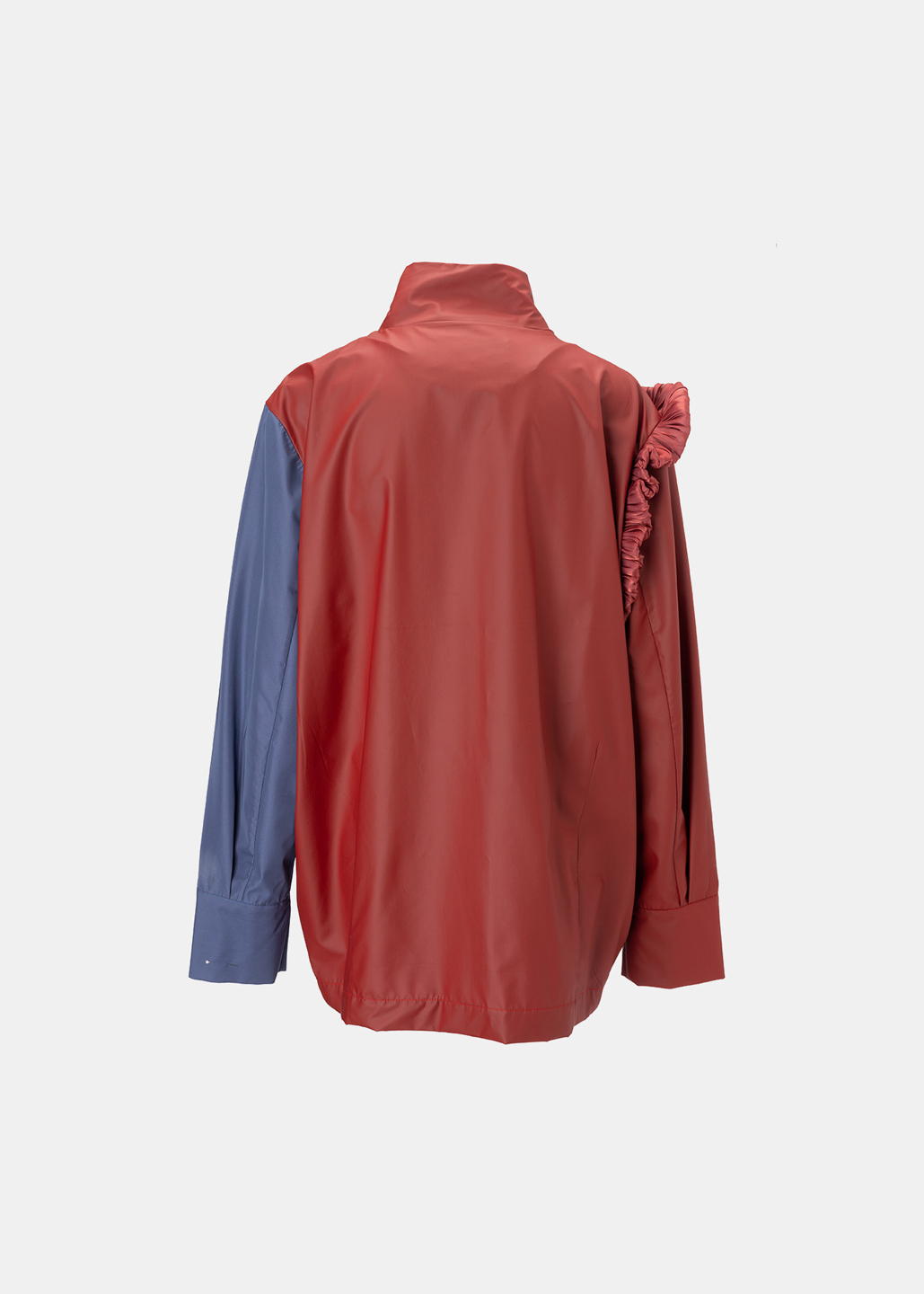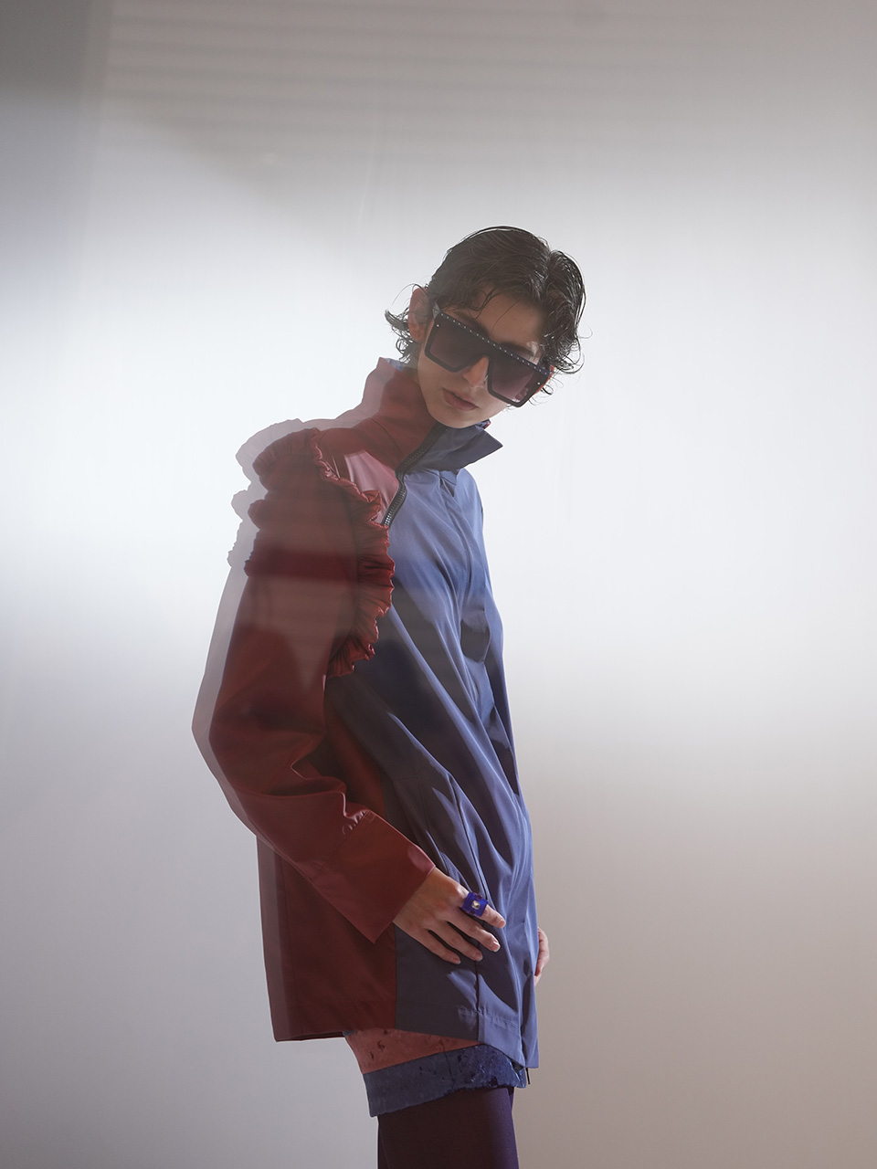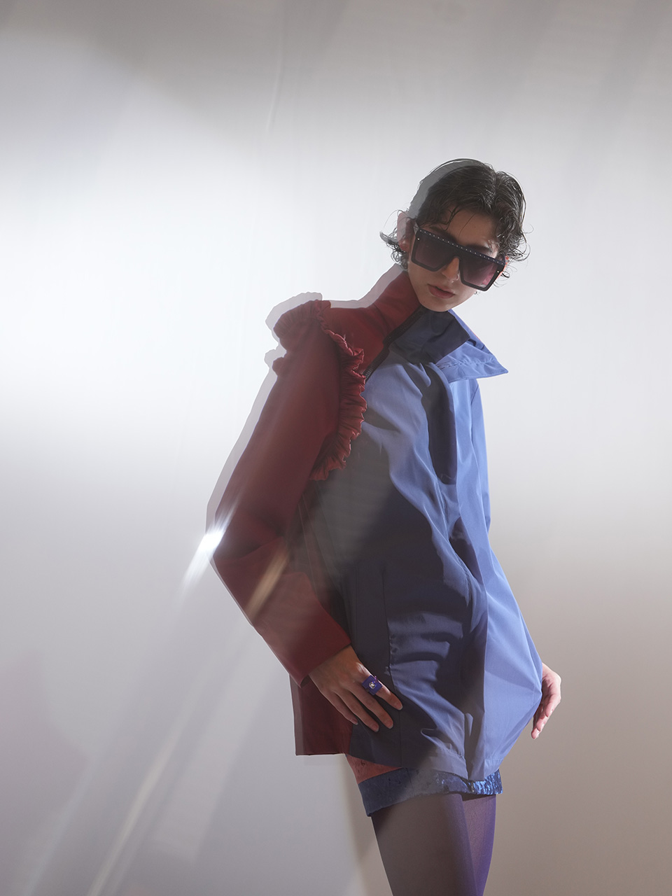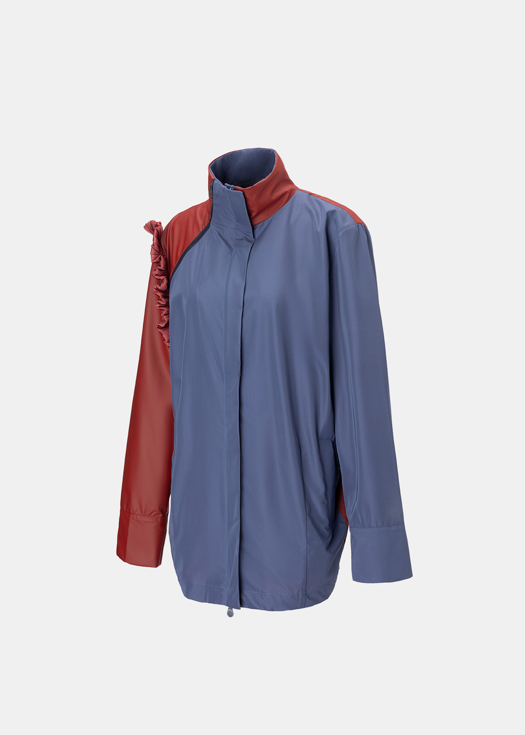 肩缝巧妙运用拉链缝线,轻轻一拉,展开红蓝交织的故事。单侧袖口点缀同花型精致蕾丝,随手臂摆动轻轻摇曳。外套面料结实耐磨,无惧困难,与众不同。