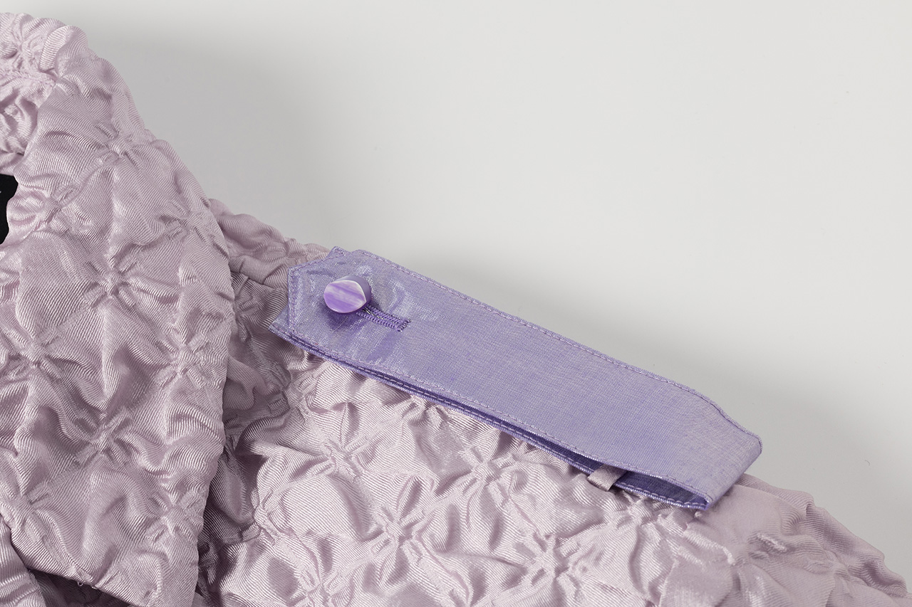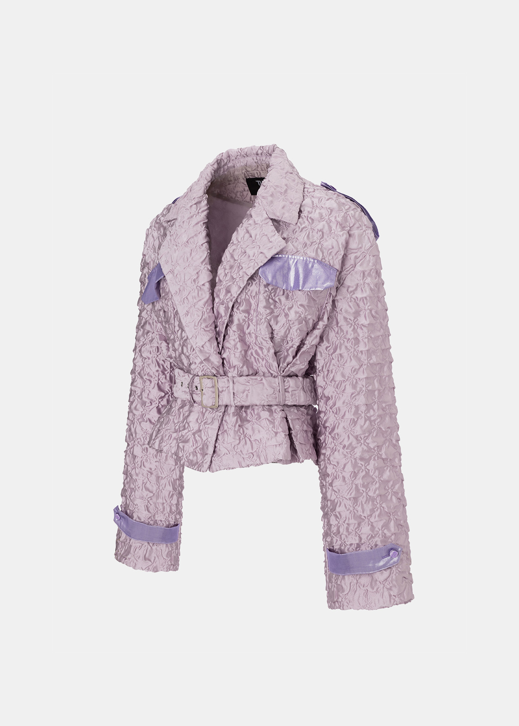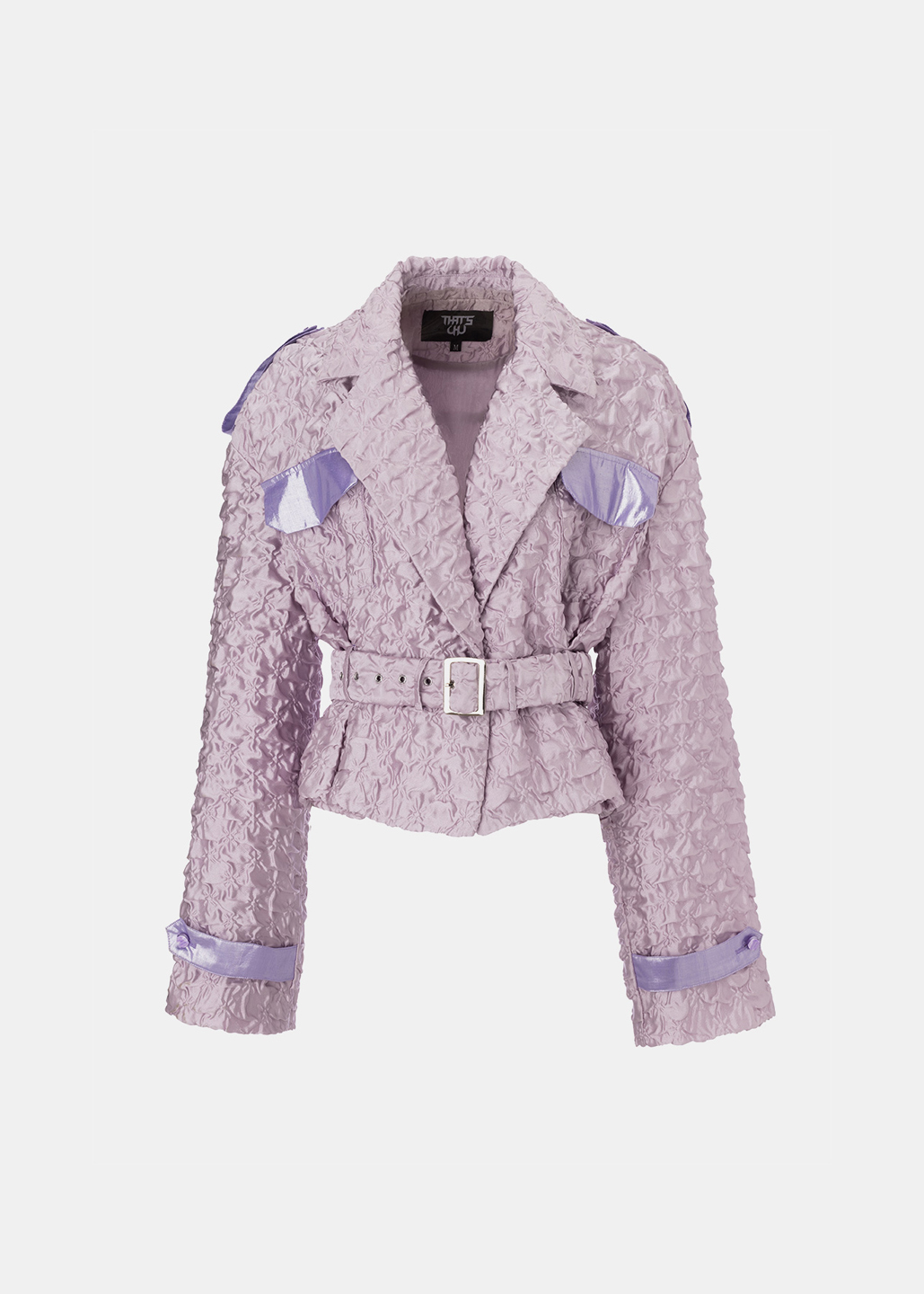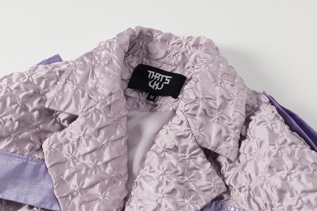 采用浅紫色面料,展现 THAT'S CHU 独特的浪漫气质。腰杆设计,打造褶皱效果,增添层次感与立体感,凸显纤细腰身。同色亮片面料作为扣带,与口袋盖相呼应,展现精致有趣的审美。