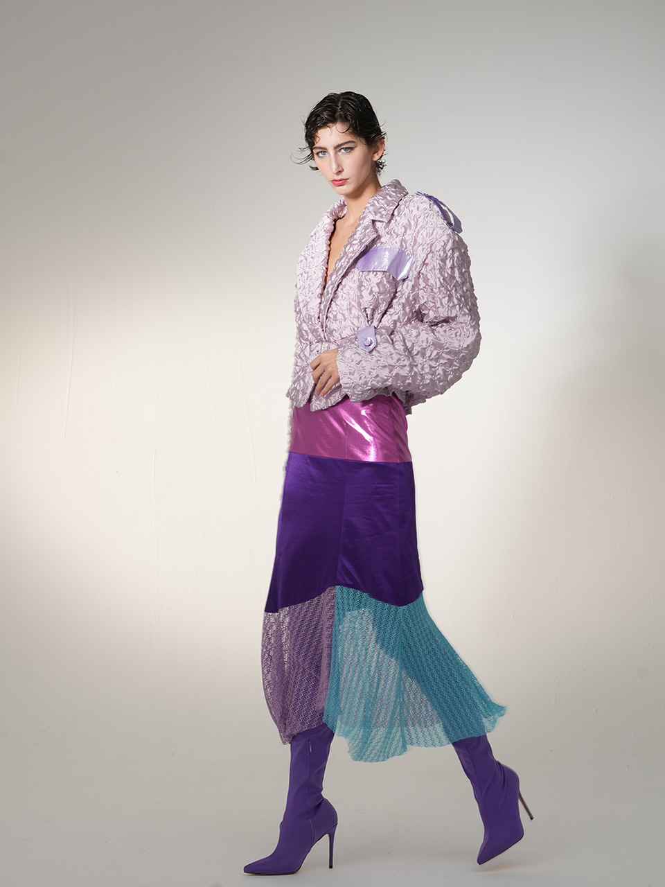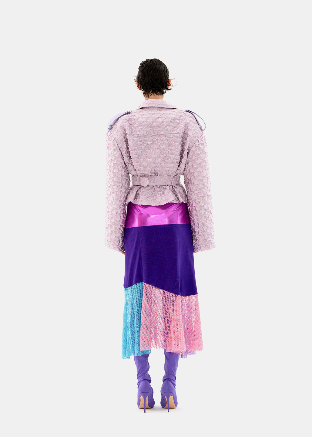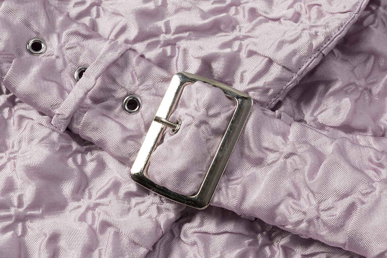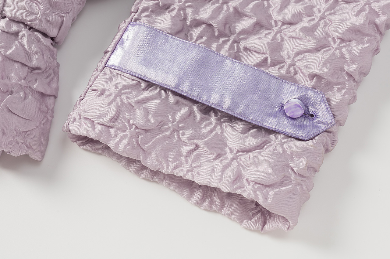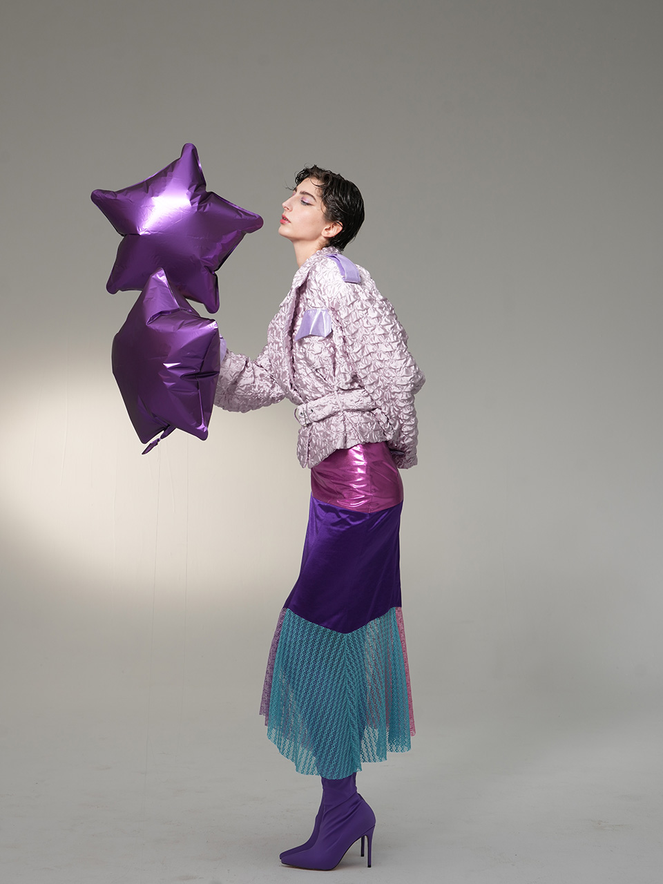 采用浅紫色面料,展现 THAT'S CHU 独特的浪漫气质。腰杆设计,打造褶皱效果,增添层次感与立体感,凸显纤细腰身。同色亮片面料作为扣带,与口袋盖相呼应,展现精致有趣的审美。