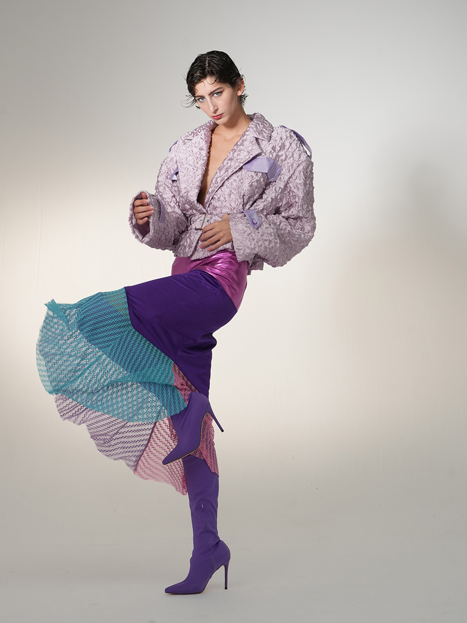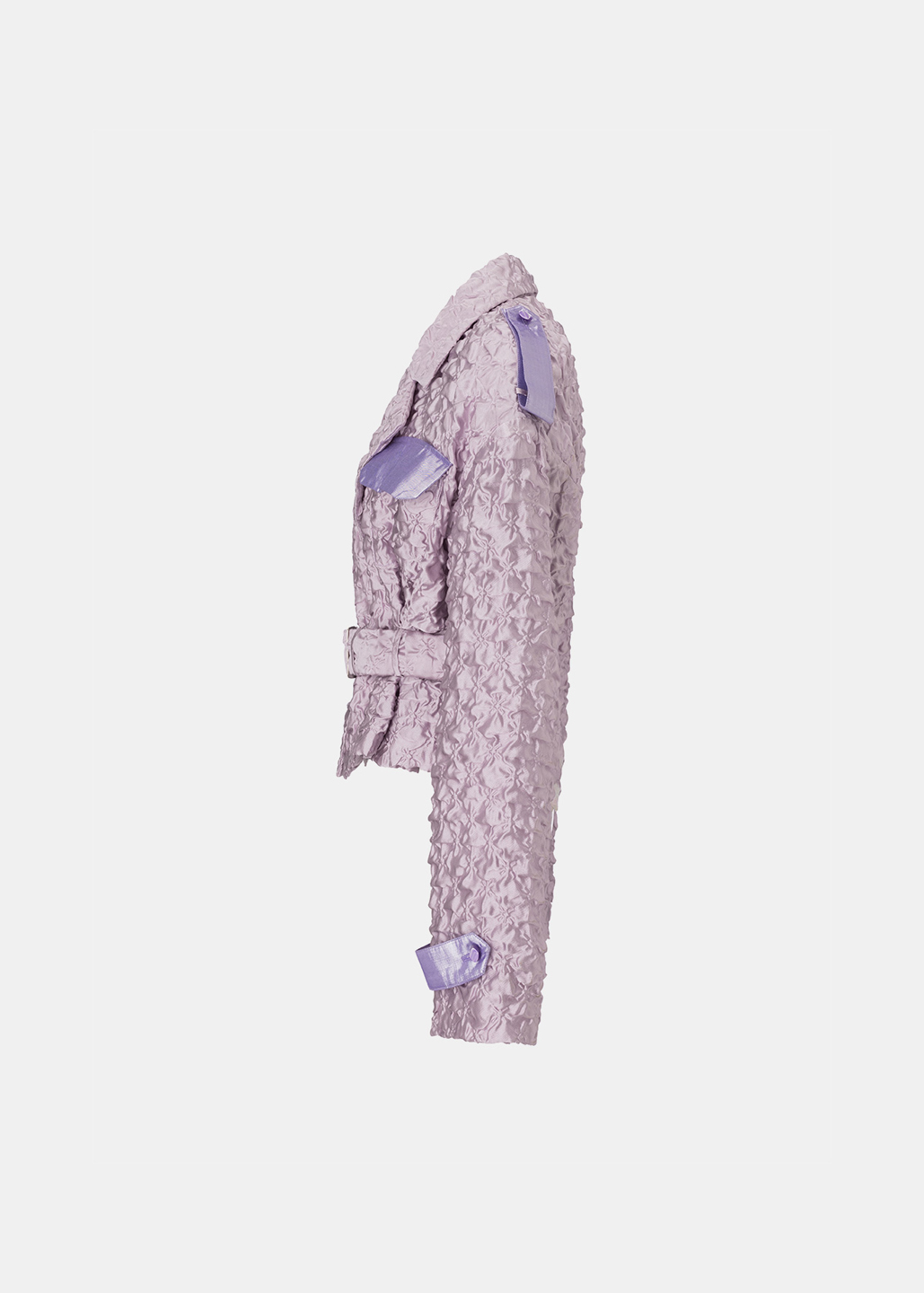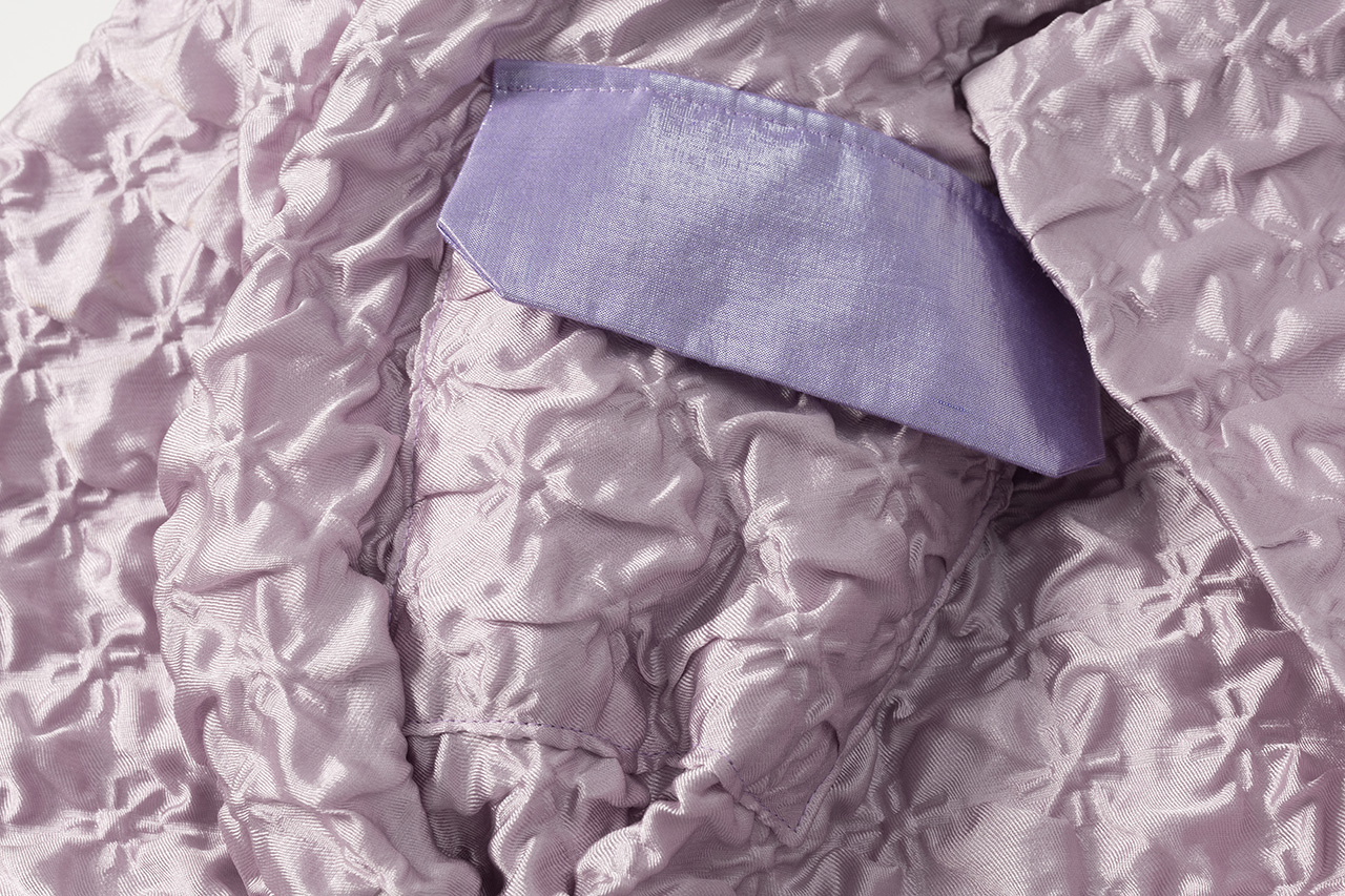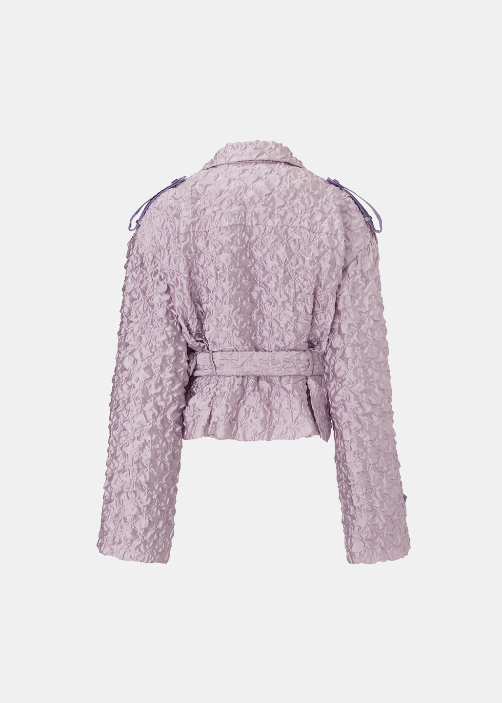 采用浅紫色面料,展现 THAT'S CHU 独特的浪漫气质。腰杆设计,打造褶皱效果,增添层次感与立体感,凸显纤细腰身。同色亮片面料作为扣带,与口袋盖相呼应,展现精致有趣的审美。