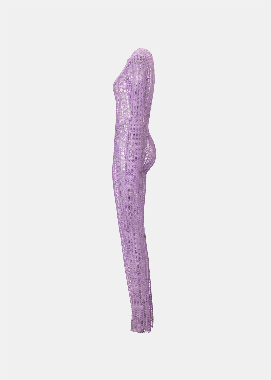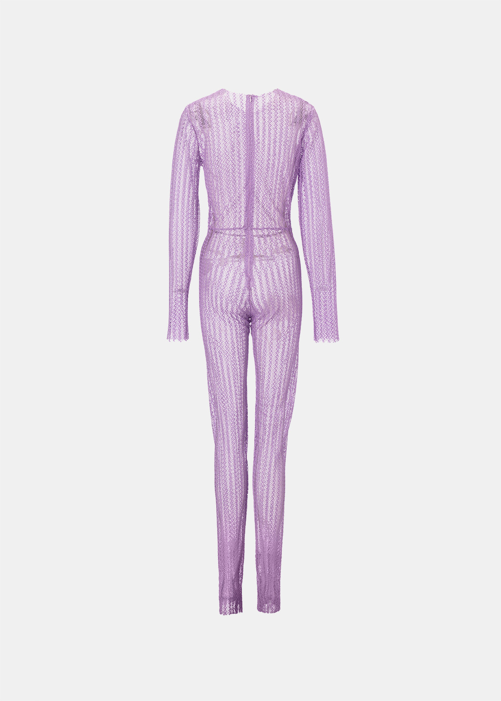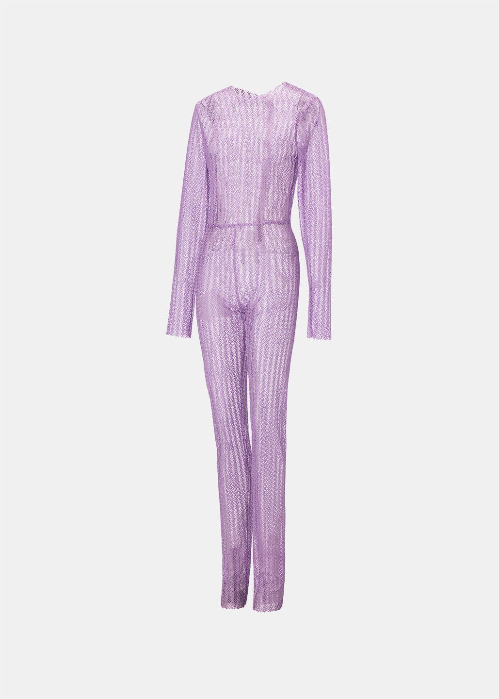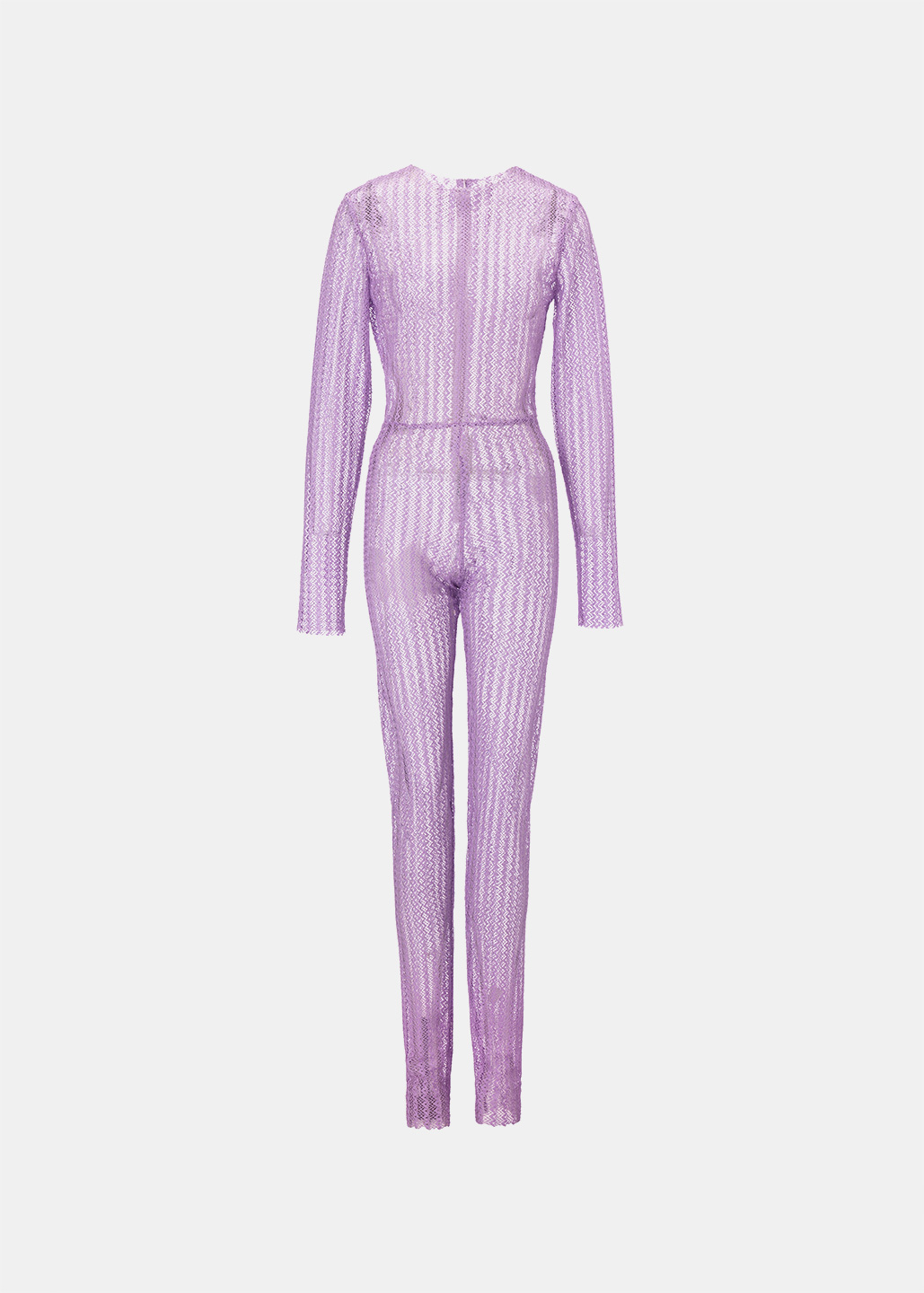 采用紫色透明蕾丝网纱,极具艺术感的同时赋予服装轻盈、性感与青春的灵魂。That's CHU 的连体衣设计贴合人体曲线,展现身材的力量感。