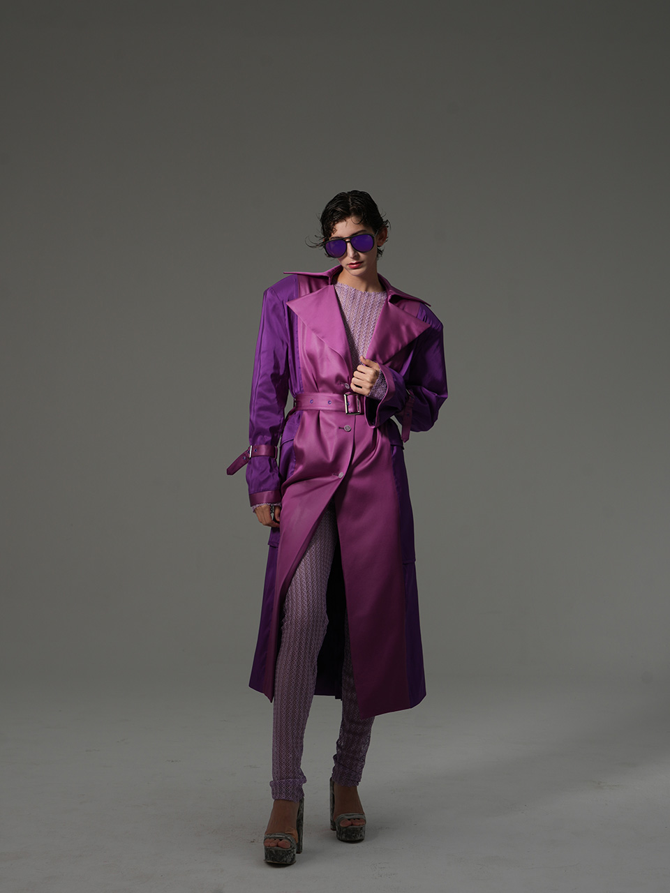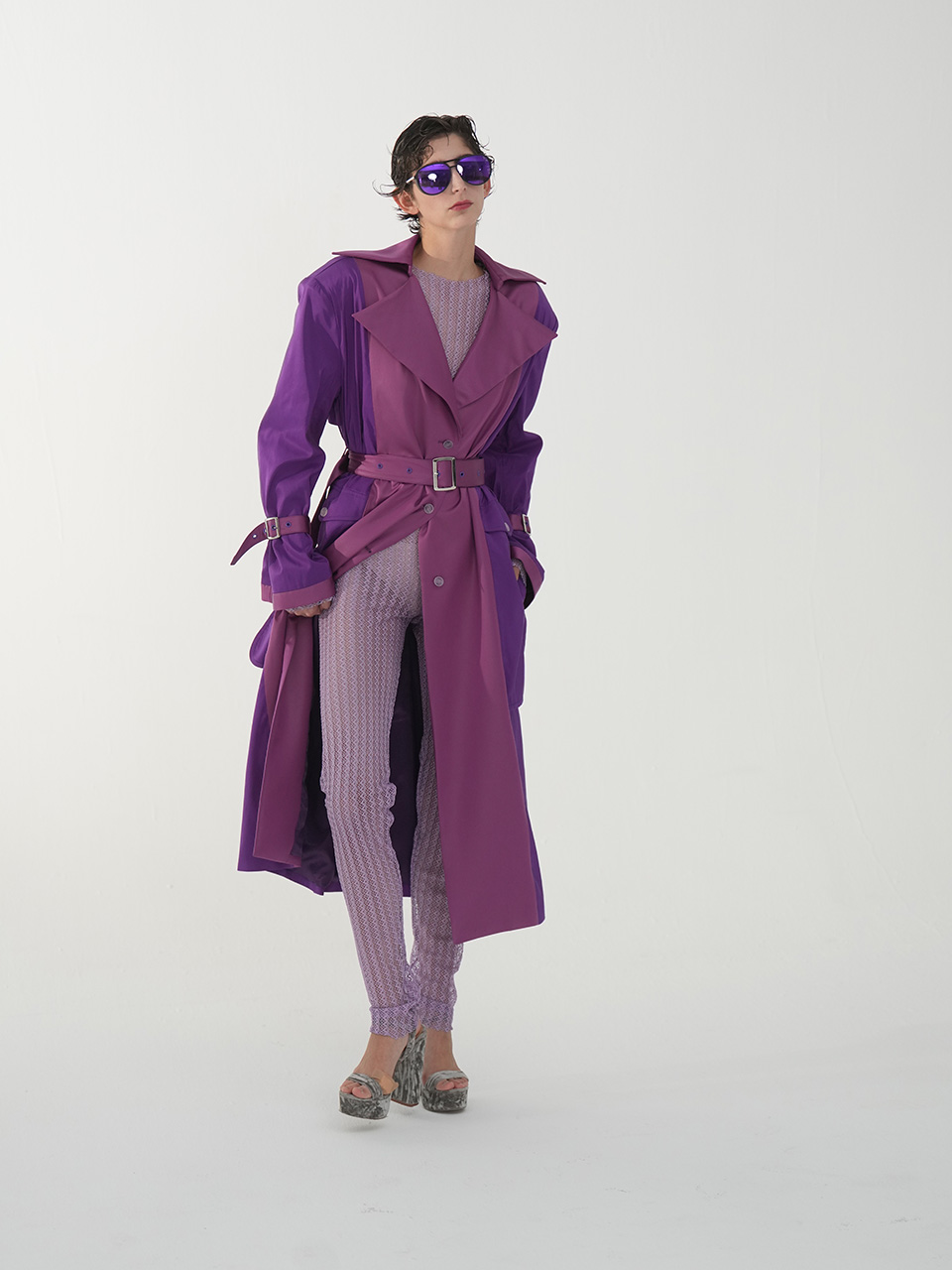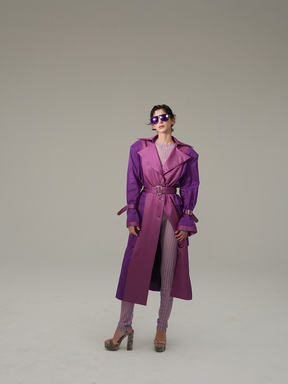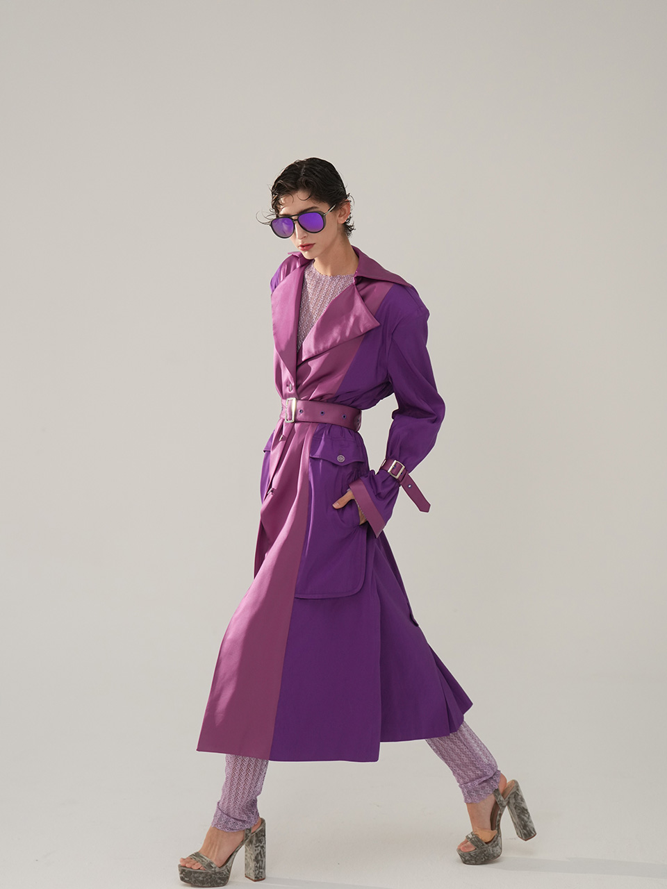 一套紫色蕾丝网纱连体衣贯穿其中,外搭紫色风衣。蕾丝连体衣在脚踝与胸口处巧妙露出,营造出层次分明的视觉效果。