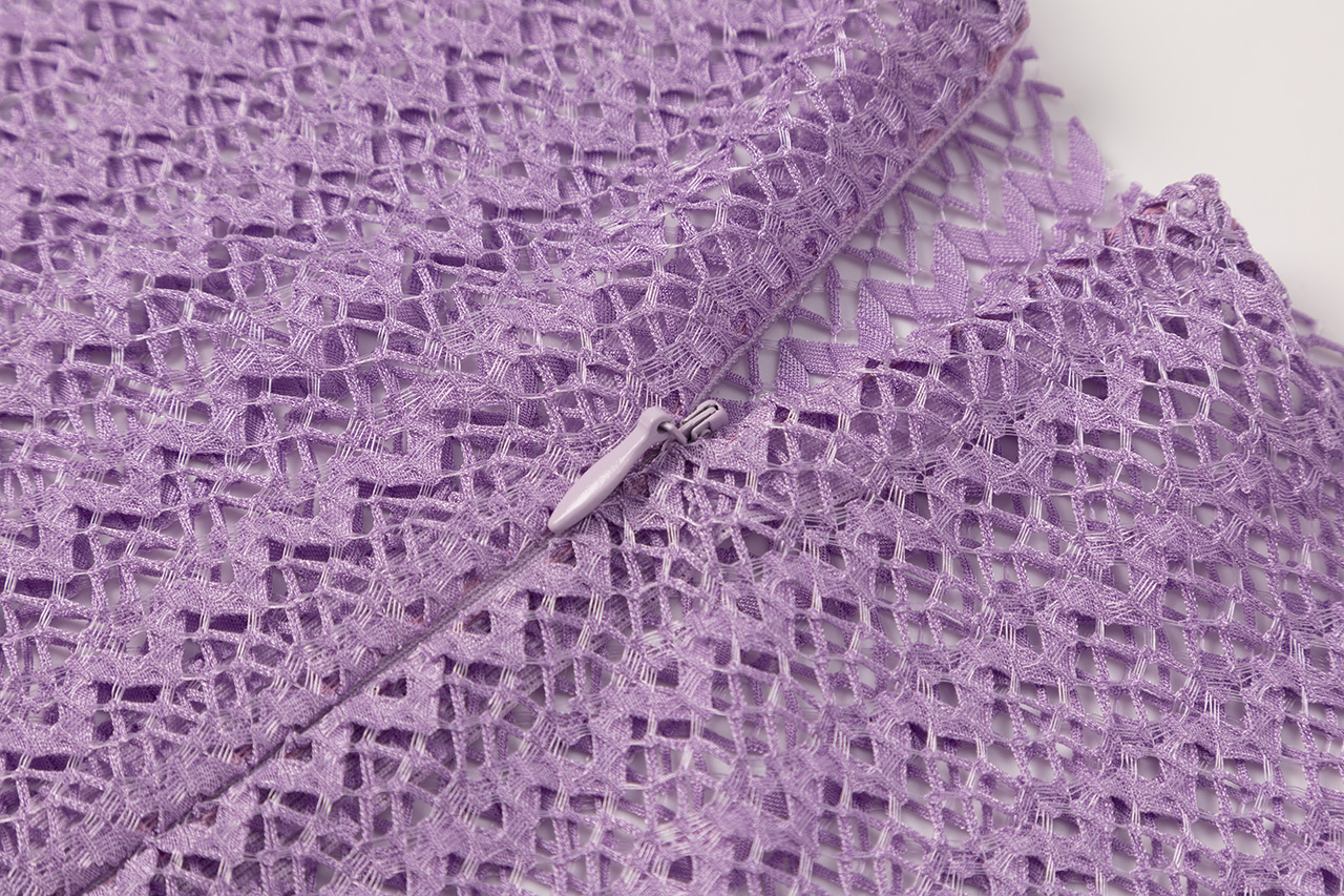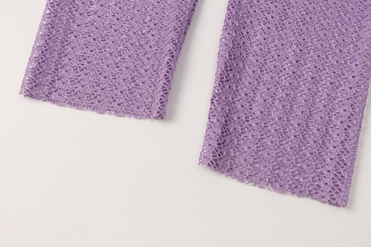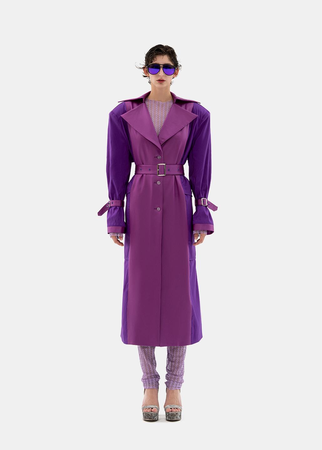 一套紫色蕾丝网纱连体衣贯穿其中,外搭紫色风衣。蕾丝连体衣在脚踝与胸口处巧妙露出,营造出层次分明的视觉效果。
