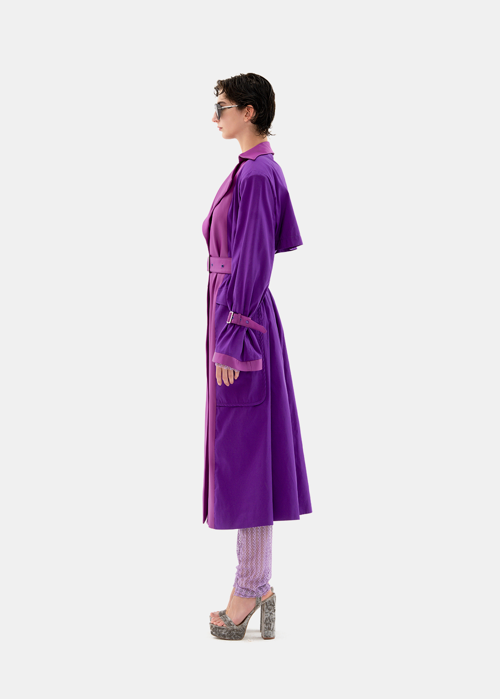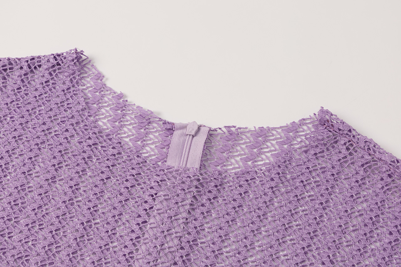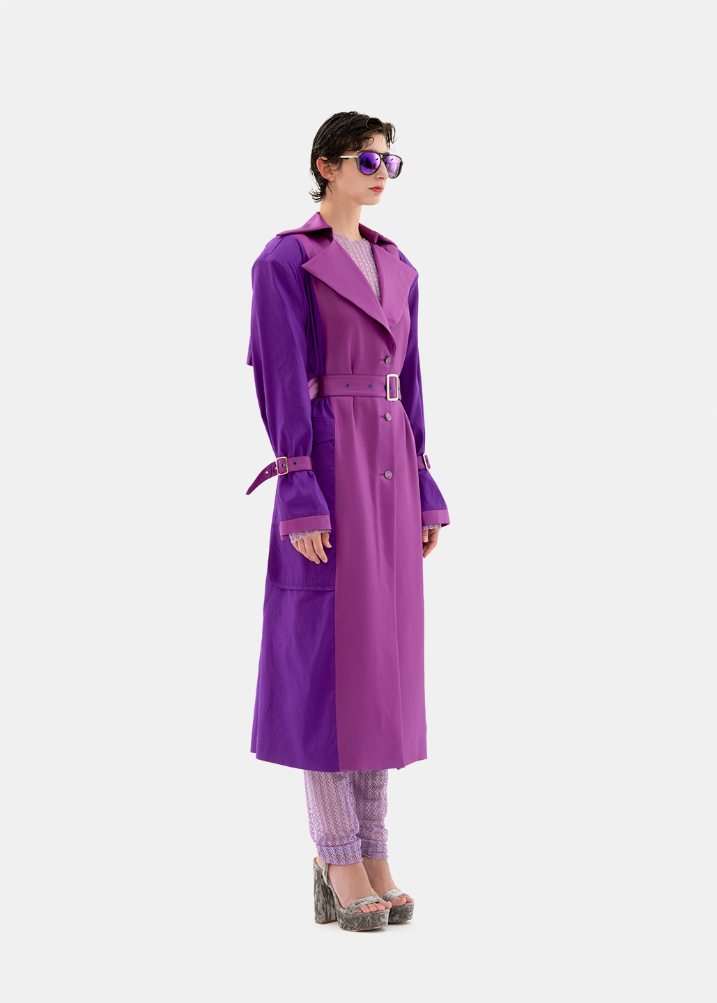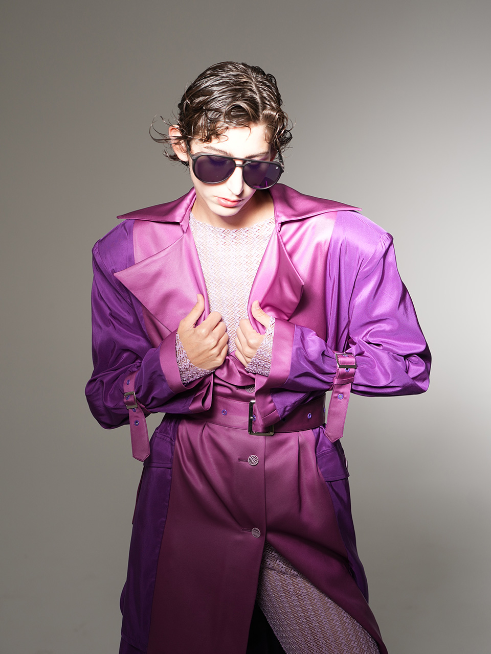一套紫色蕾丝网纱连体衣贯穿其中,外搭紫色风衣。蕾丝连体衣在脚踝与胸口处巧妙露出,营造出层次分明的视觉效果。