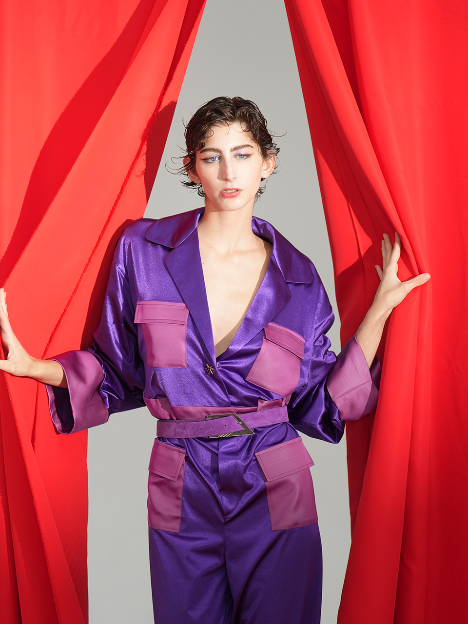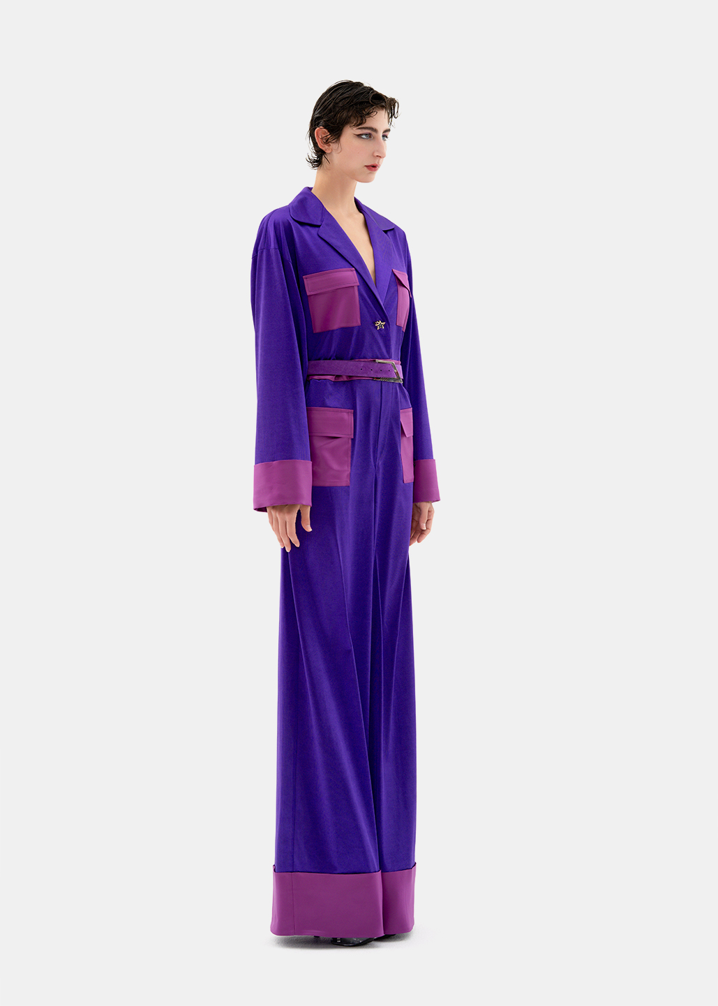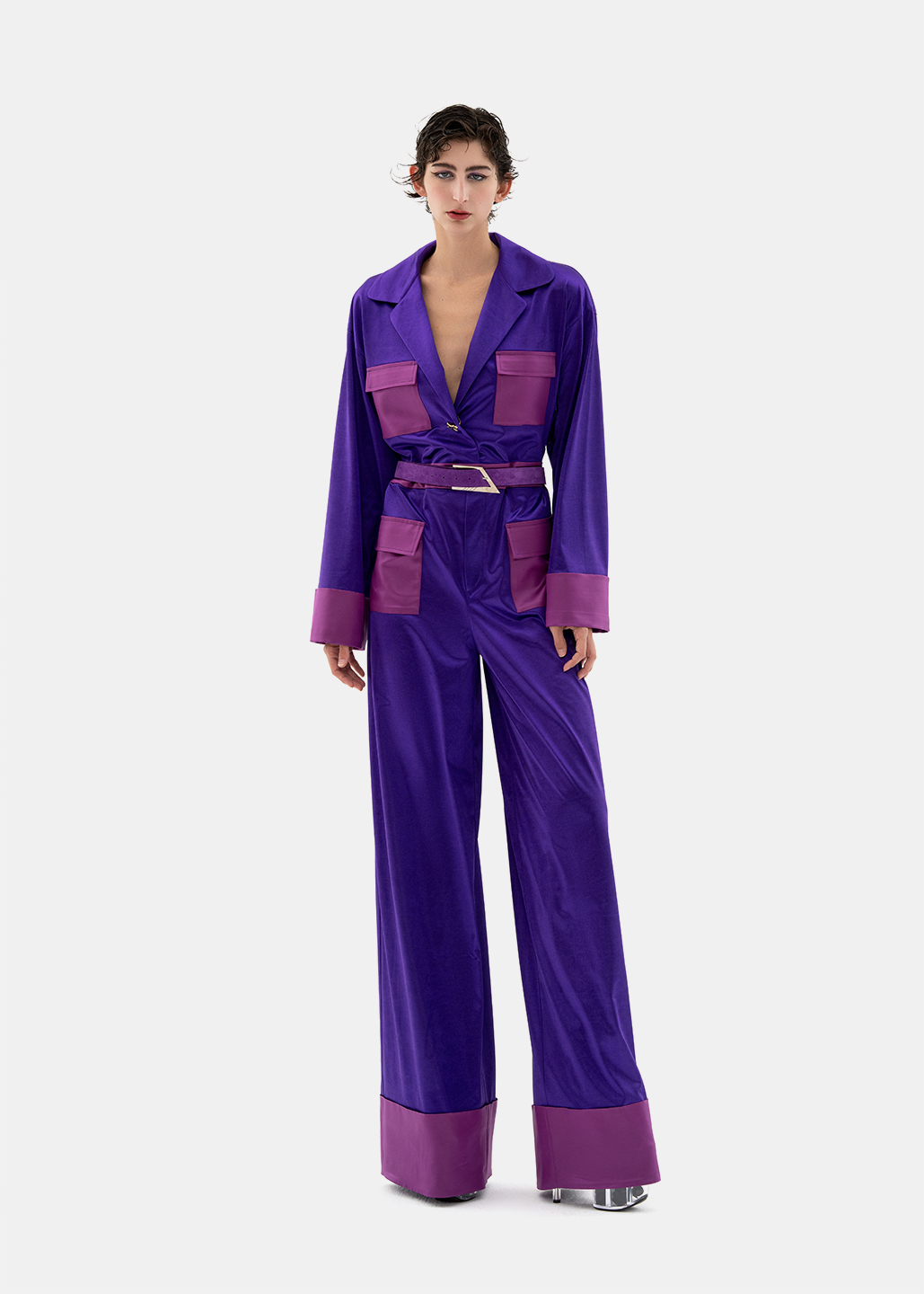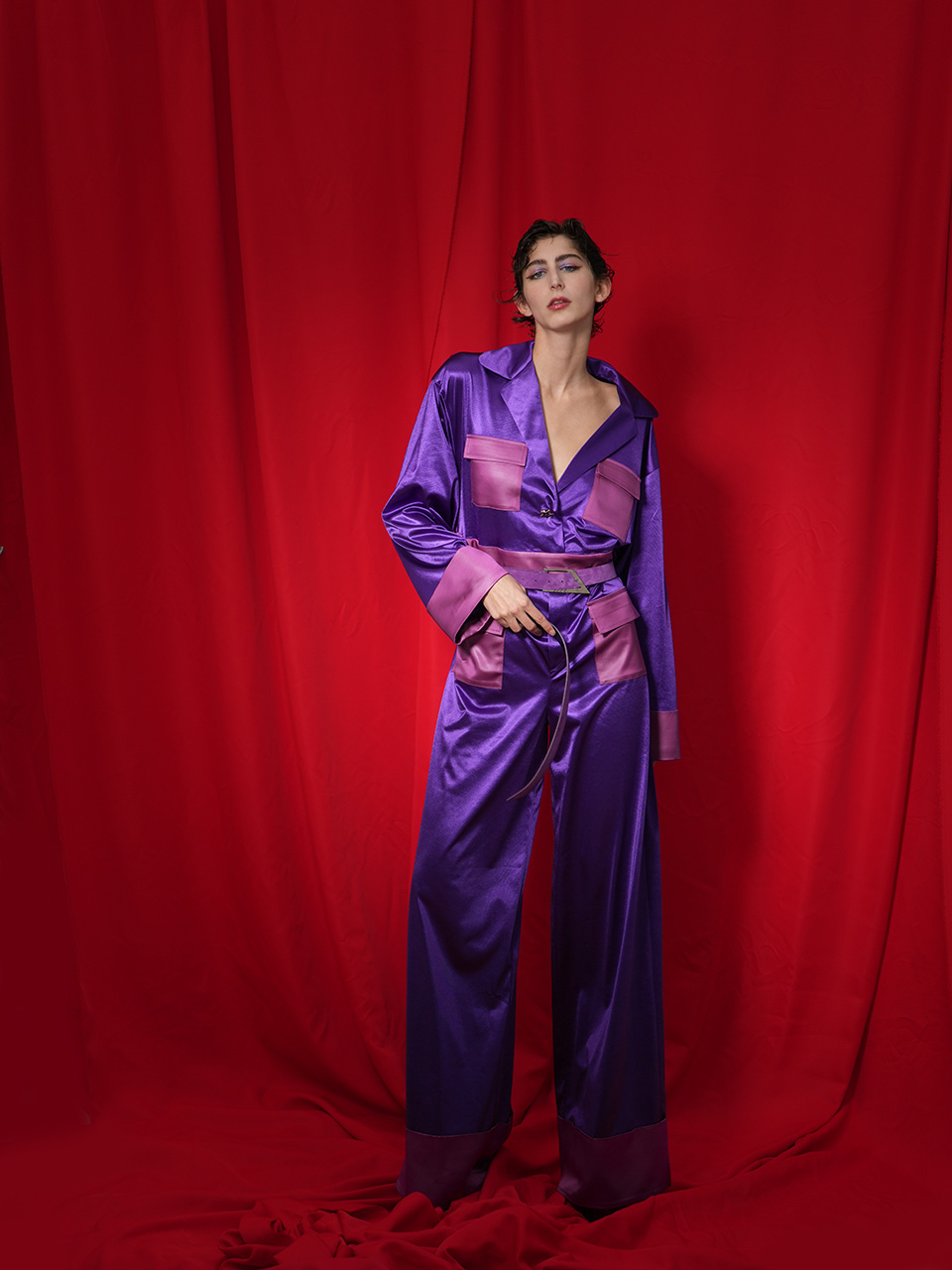 整套服装采用连体衣版型,宽松慵懒。袖口裤脚与口袋采用光滑亮紫色面料,在深紫色中脱颖而出,带来趣味。腰带系带,领口大开,轻松展现年轻精致的时尚精神。