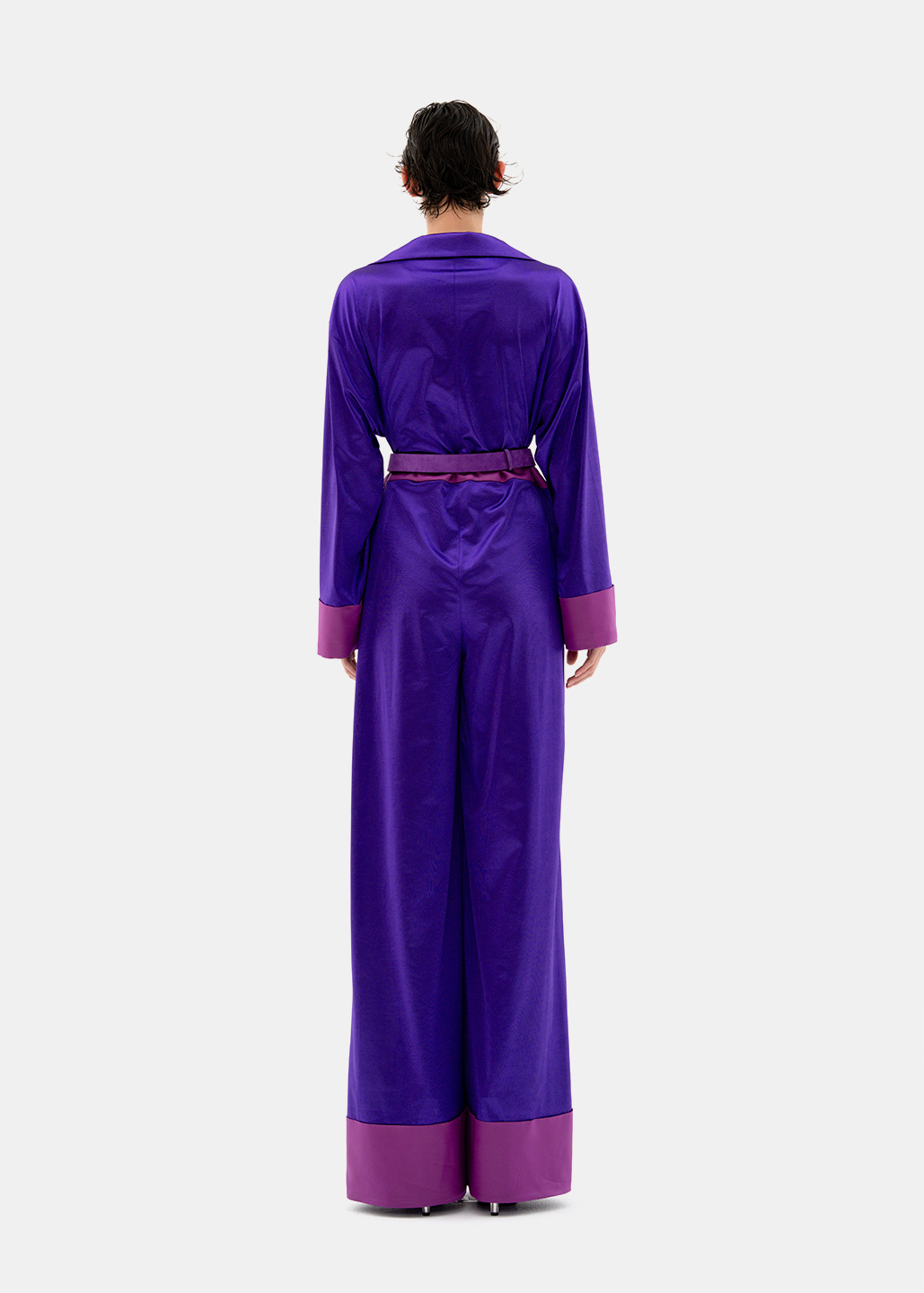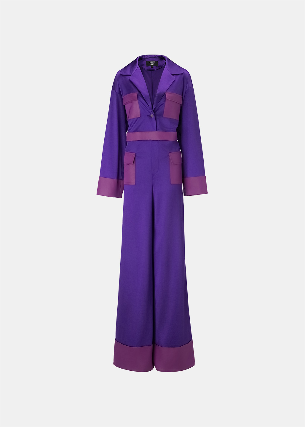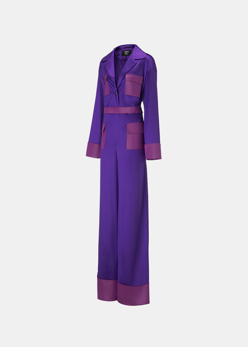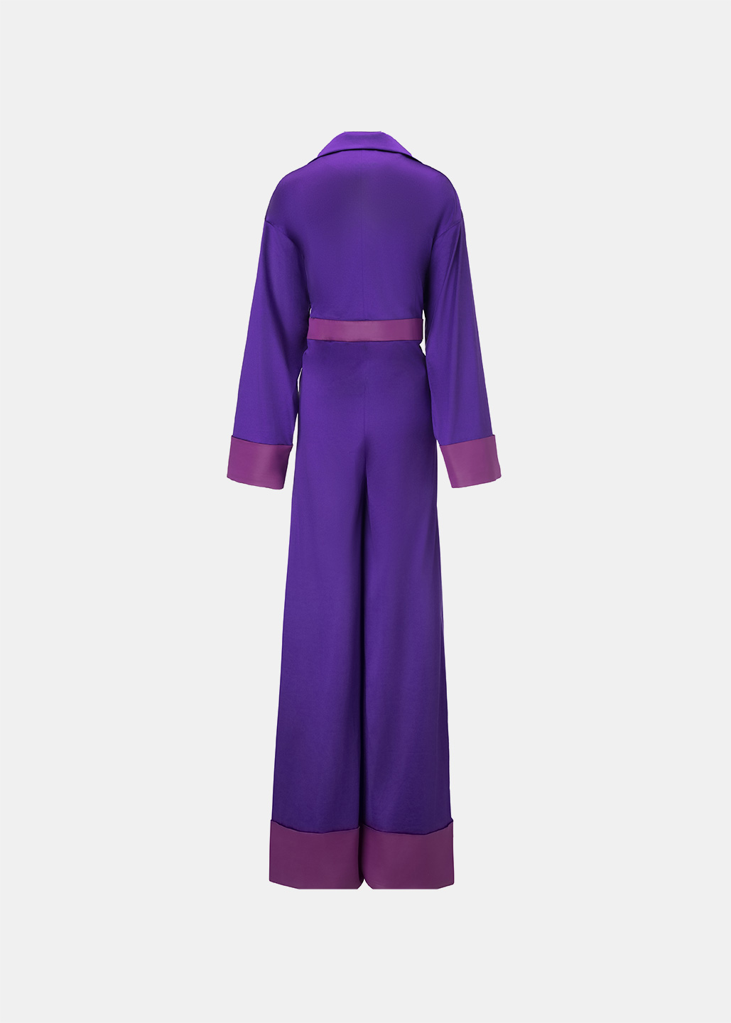 整套服装采用连体衣版型,宽松慵懒。袖口裤脚与口袋采用光滑亮紫色面料,在深紫色中脱颖而出,带来趣味。腰带系带,领口大开,轻松展现年轻精致的时尚精神。