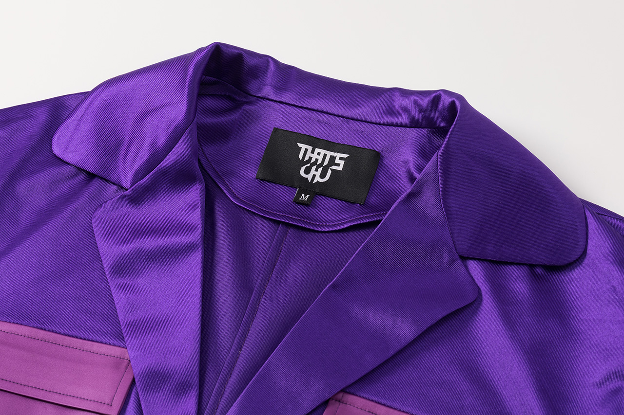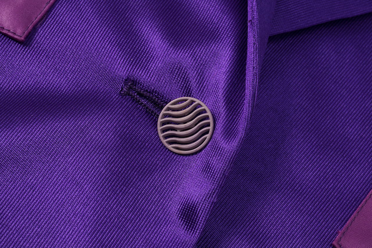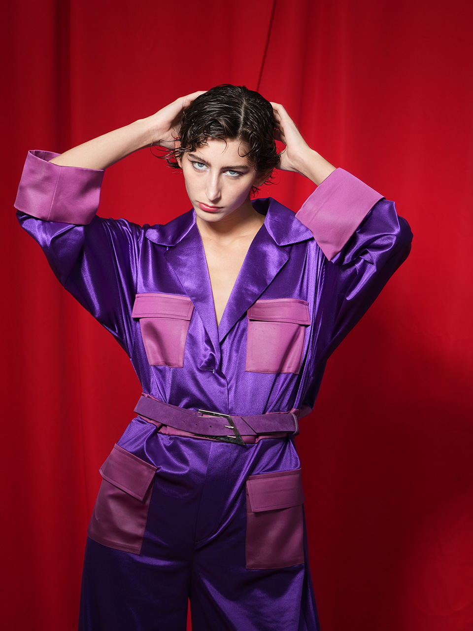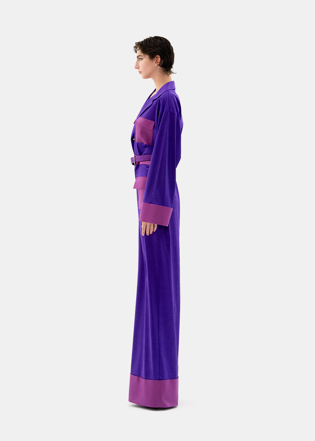 整套服装采用连体衣版型,宽松慵懒。袖口裤脚与口袋采用光滑亮紫色面料,在深紫色中脱颖而出,带来趣味。腰带系带,领口大开,轻松展现年轻精致的时尚精神。