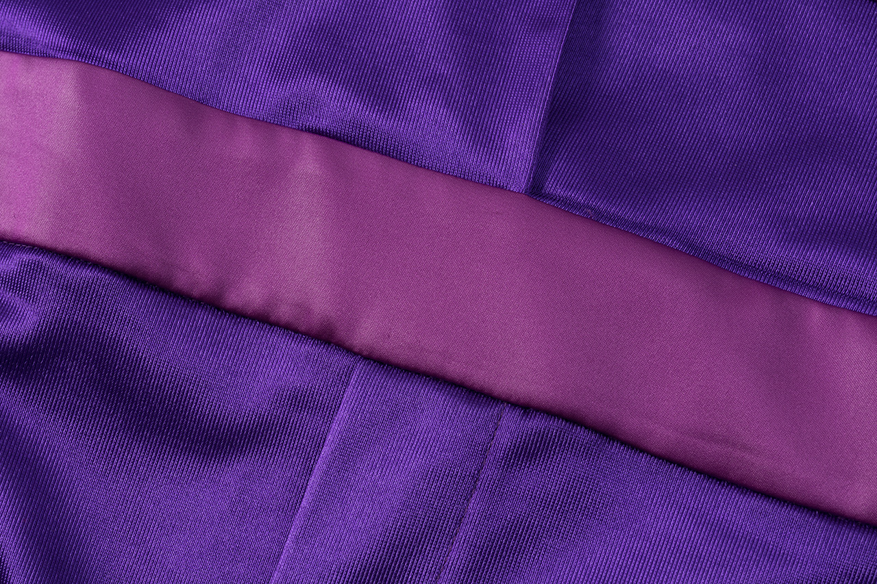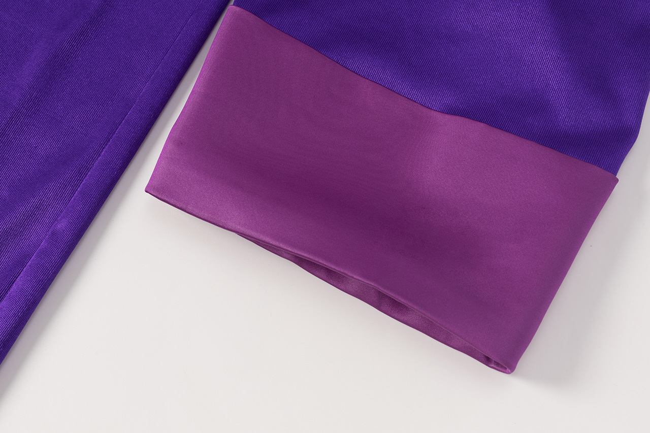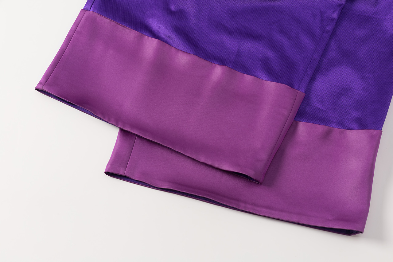 采用不同紫色交织,碰撞出奇妙的视觉火花,宛如一幅绚丽的紫色画卷,每一处都充满艺术感。长袖与裤装的特殊剪裁年轻且充满趣味,袖口与裤脚处的面料拉长手臂与腿部比例。