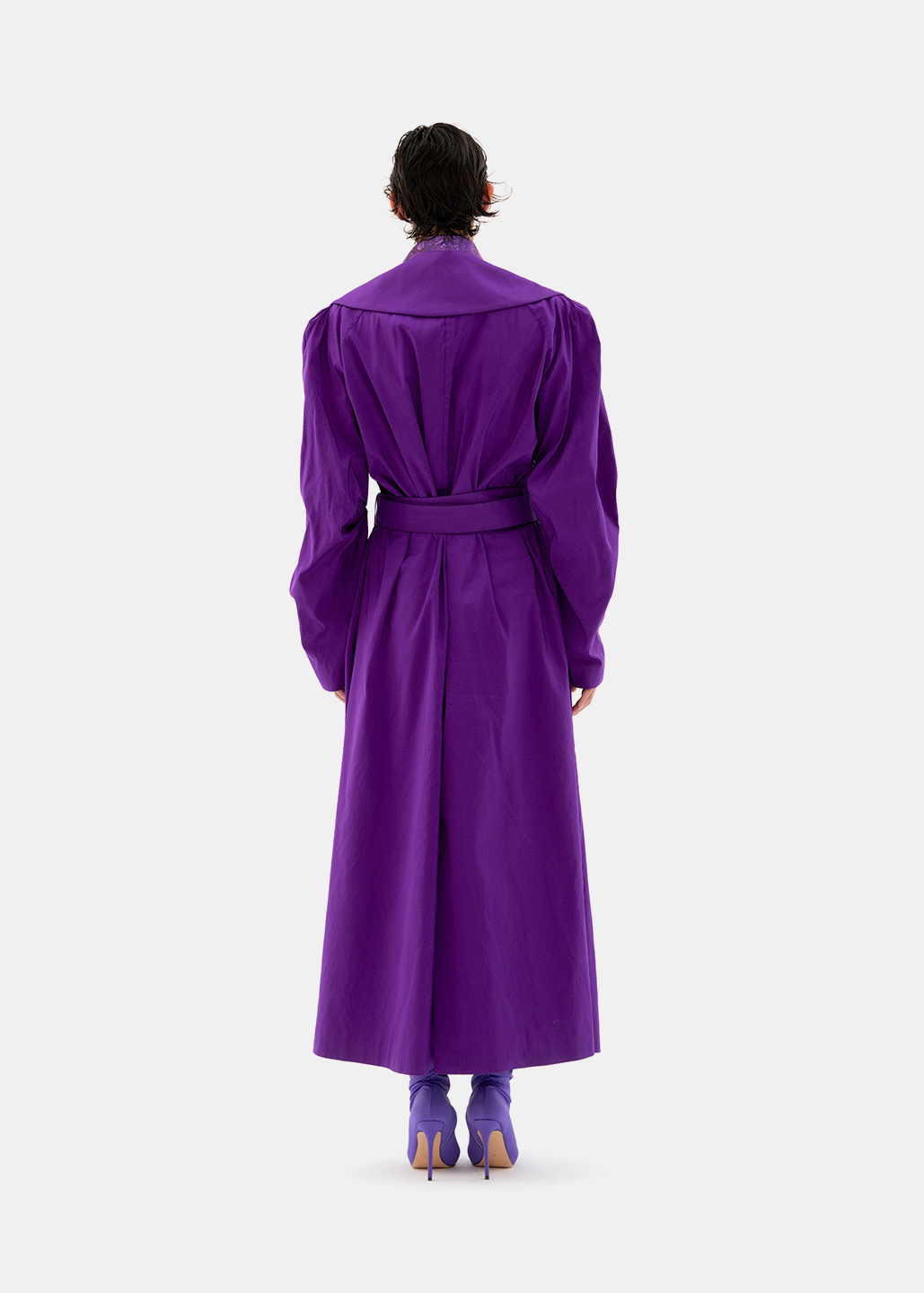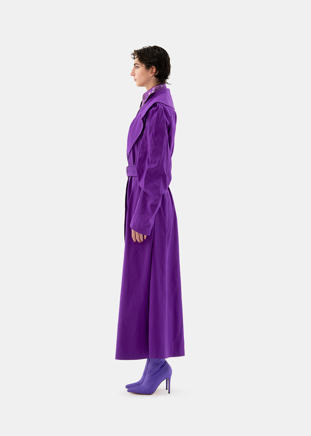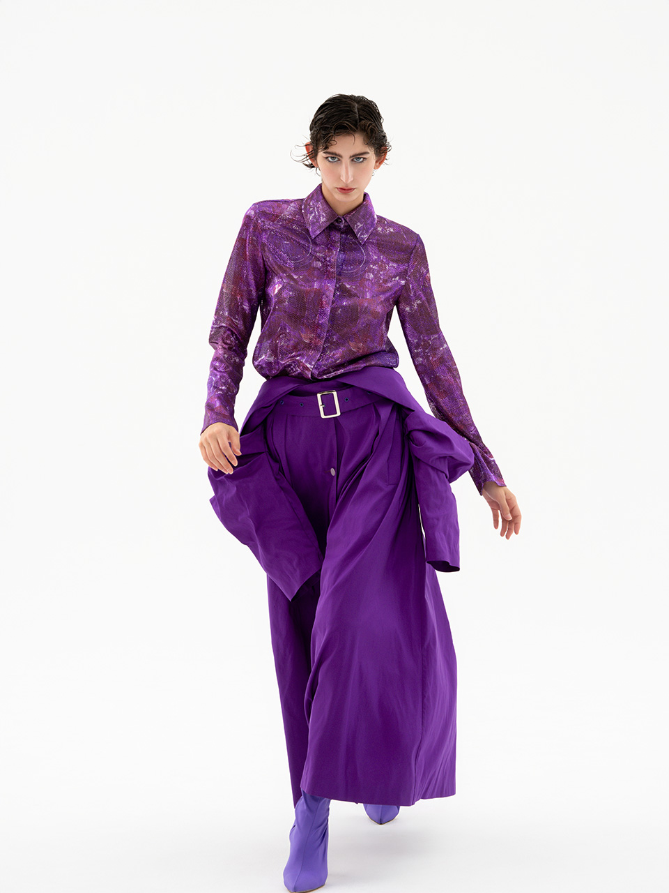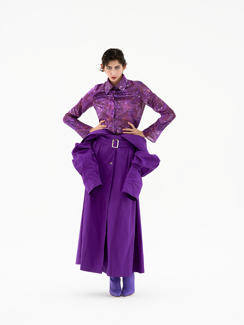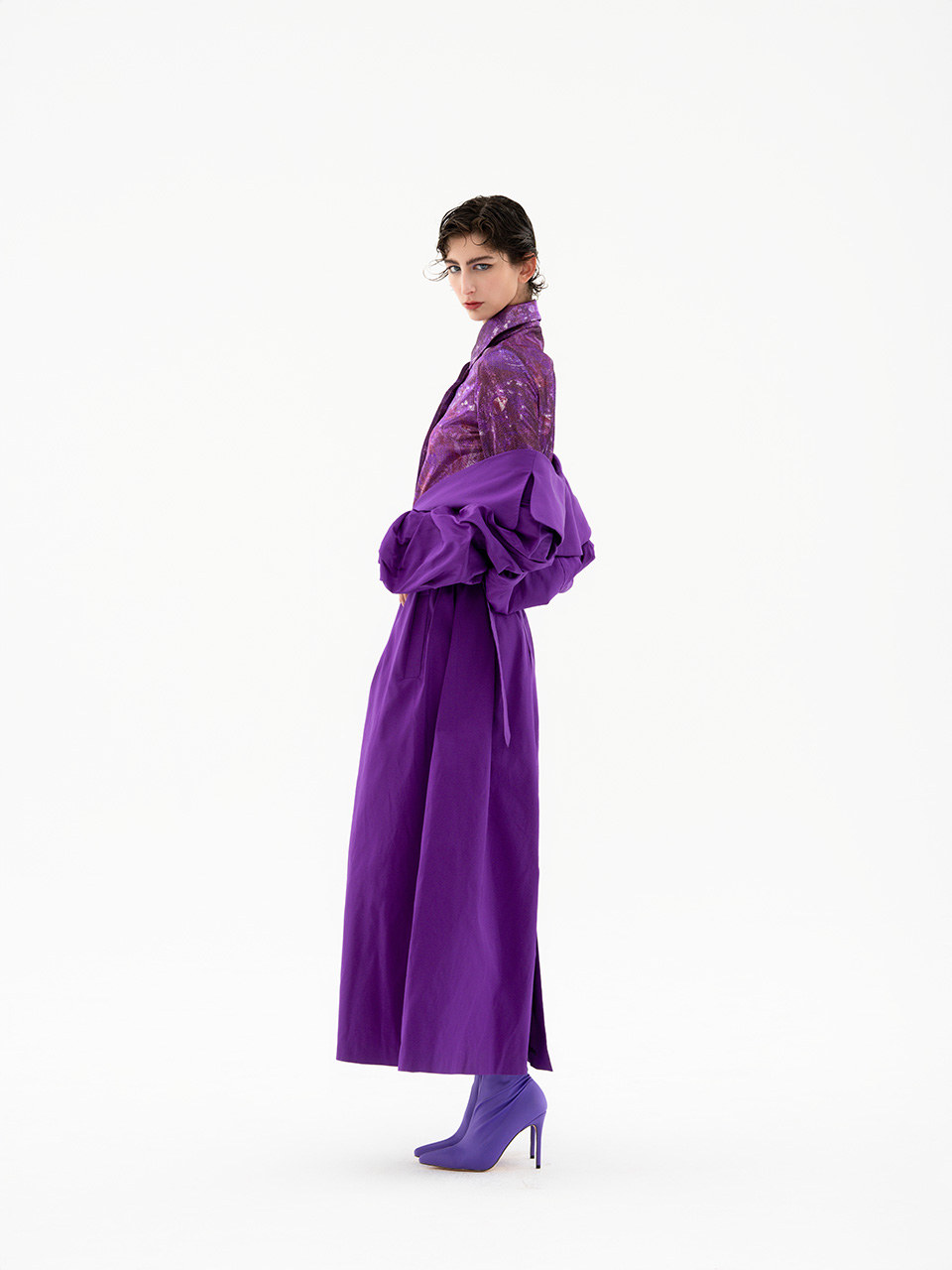 整套服装通过软硬、深浅面料的对比,展现紫色的迷人魅力。风衣的大翻领翻出衬衫的小领,使套装更加精致有层次。深紫色风衣内藏紫色星河,梦幻独特且浪漫。