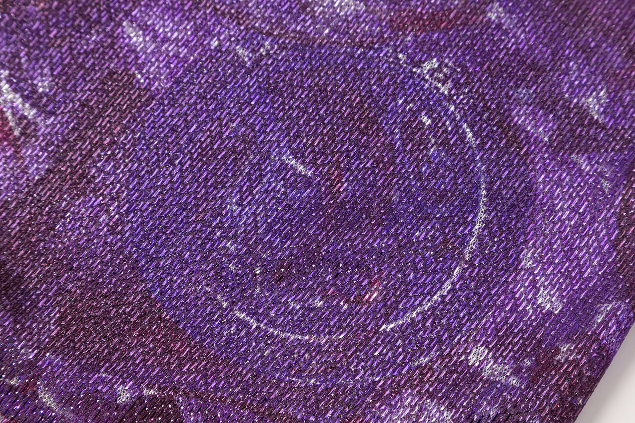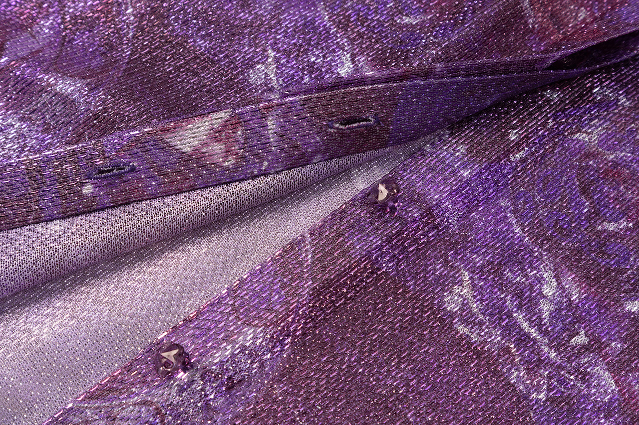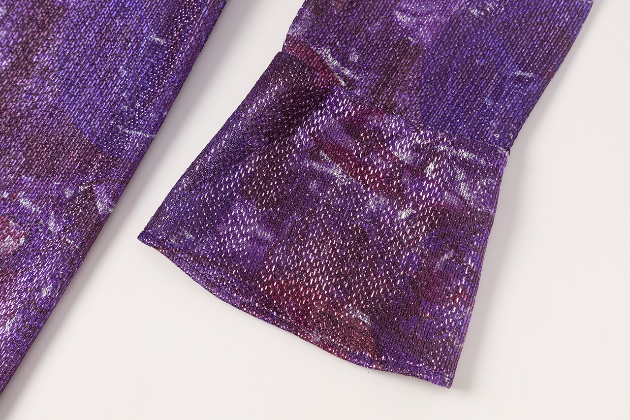 采用美丽的紫色光感面料,仿佛浩瀚宇宙披在身上,如宇宙深处的神秘星云,在光线下散发出迷人的紫色光芒。每一次转身,星光点点,宛如梵高笔下的梦幻《星空》。浓烈的笔触与斑斓的色彩交织。