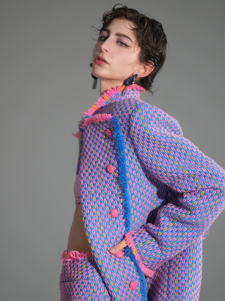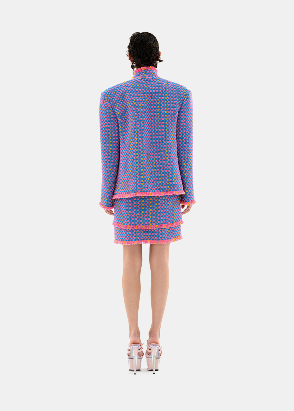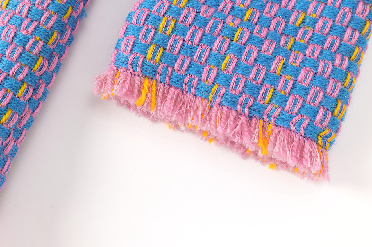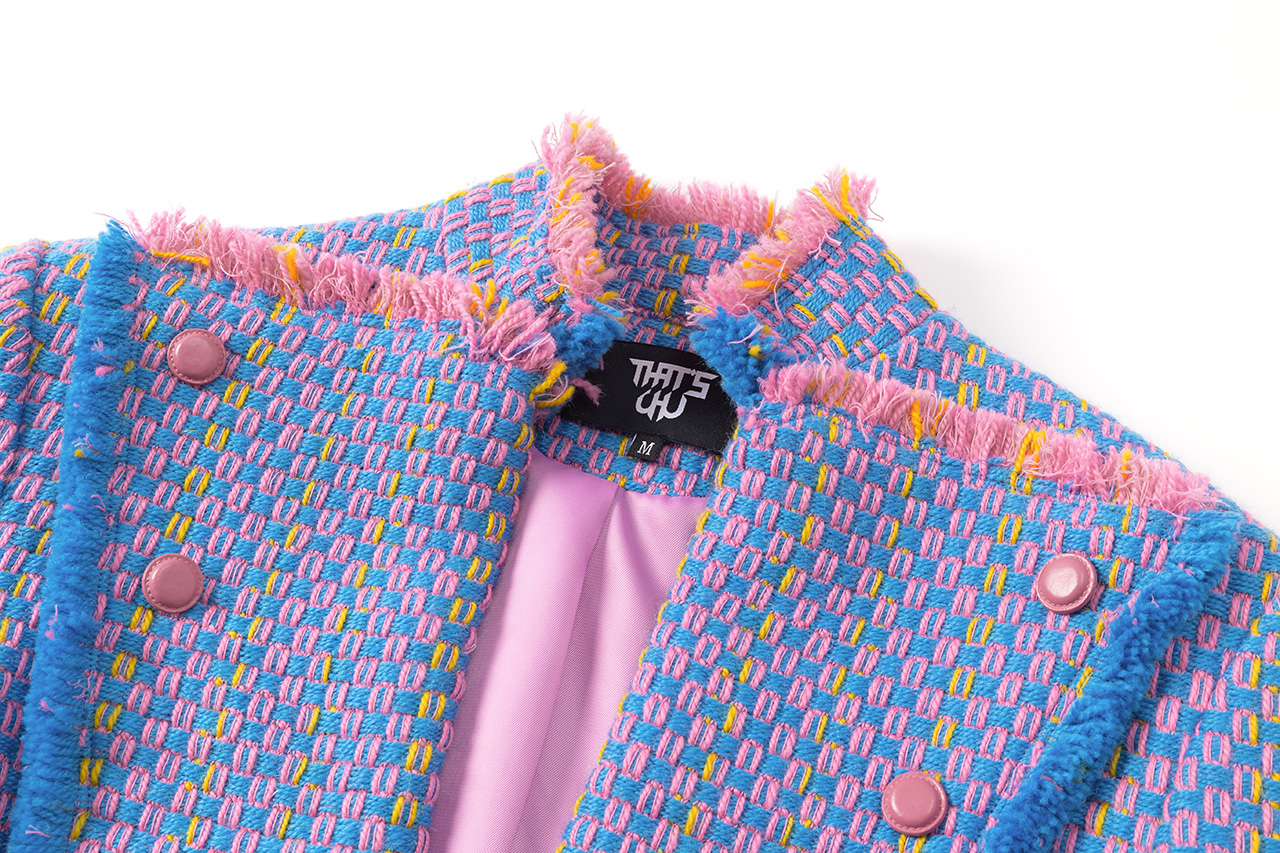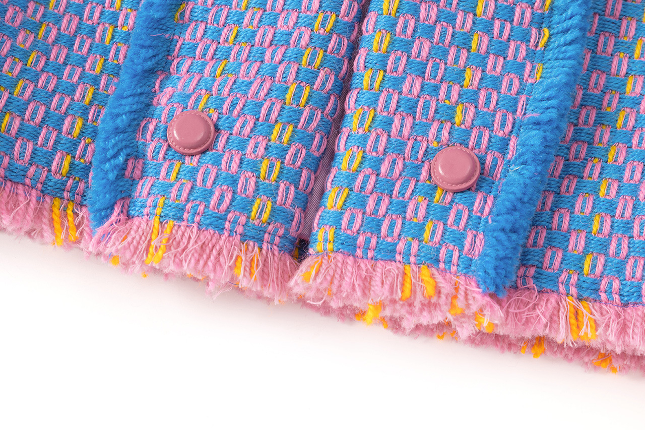 整套服装采用三色粗花呢独特面料制成,醒目且充满青春活力。刷毛工艺分布于夹克的领口、袖口与手腕以及裙装的裙摆,工艺一致,带来秩序感,与面料的绚丽碰撞,乱中有序。