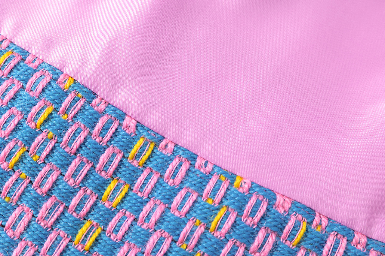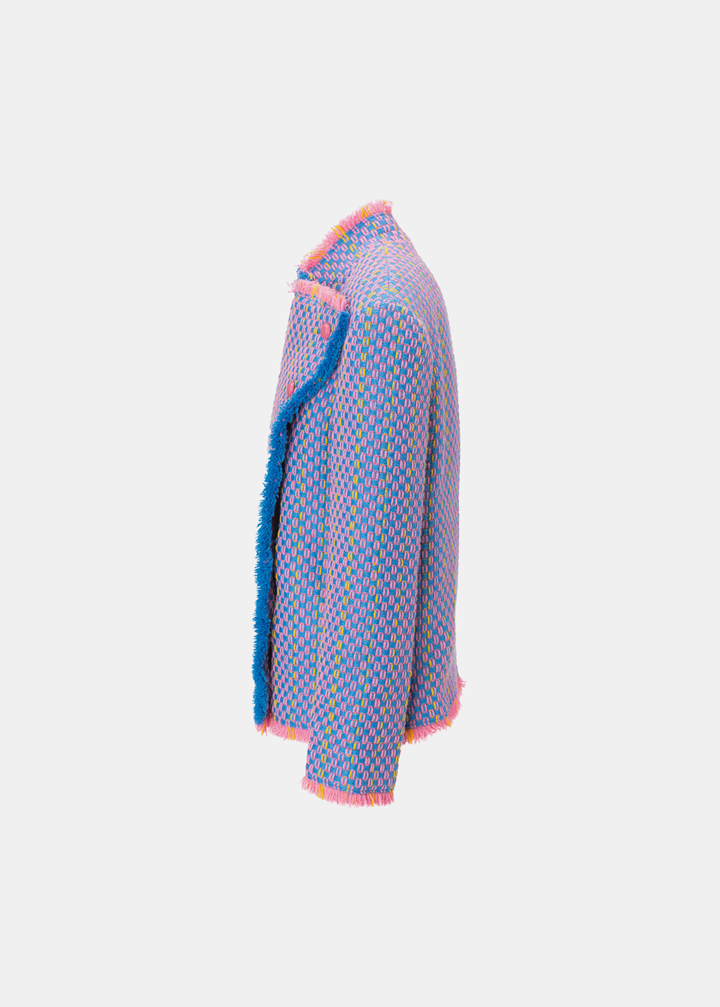 采用蓝、紫、粉混色面料制成的夹克,面料华丽且独具特色。经过刷毛工艺处理,碰撞出奇妙的视觉火花。90度翻领设计搭配粉色纽扣,充满艺术与时尚张力。