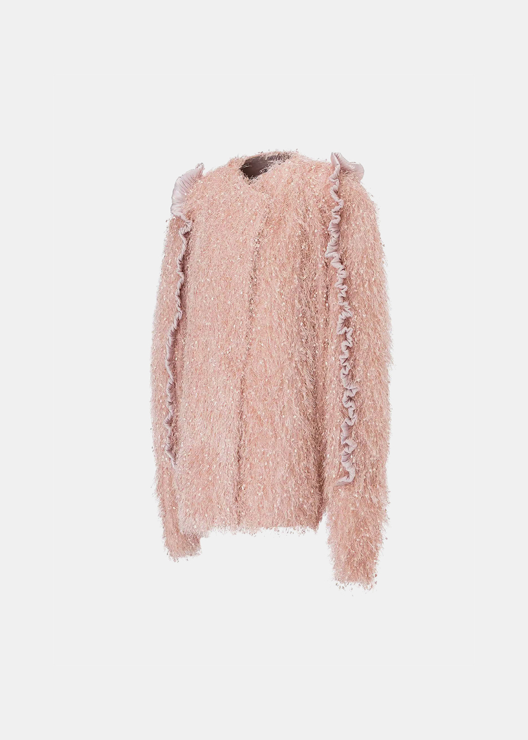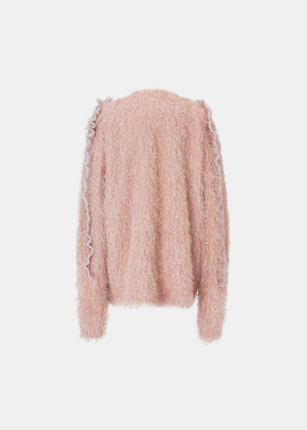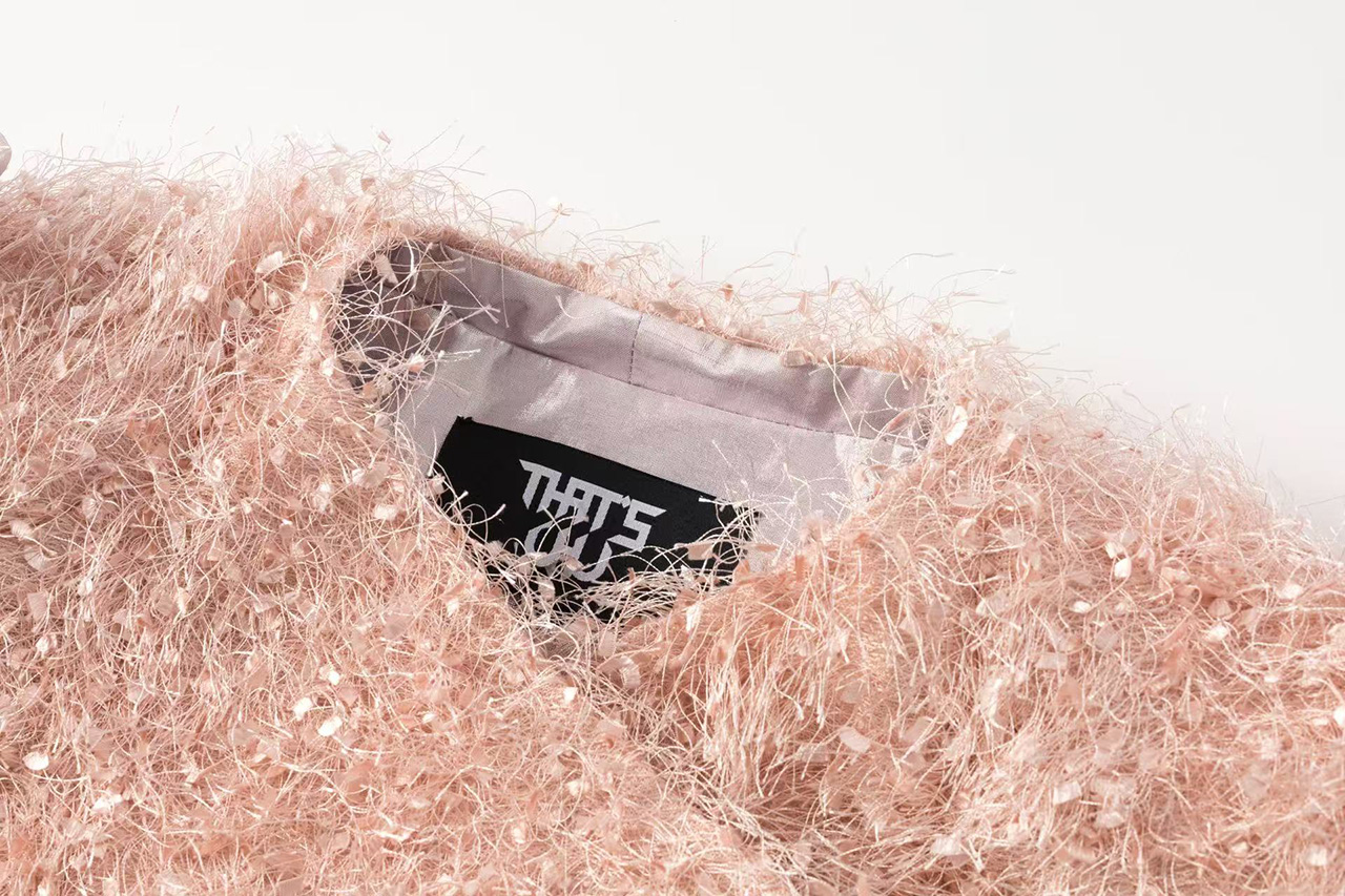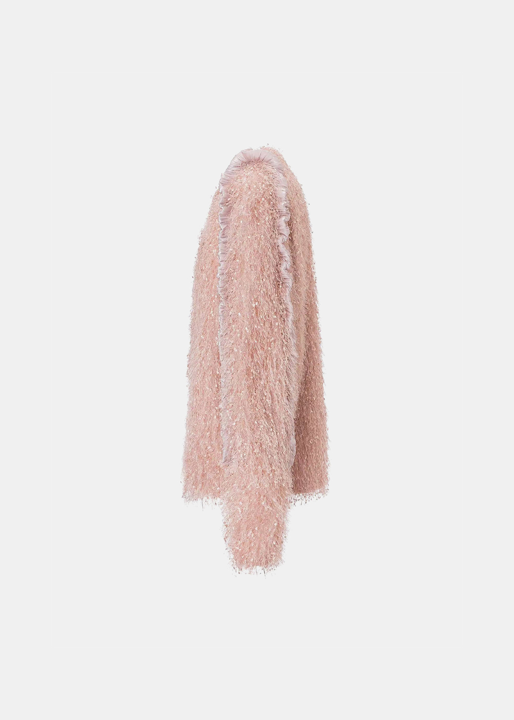 选用细腻的粉色毛绒面料,袖侧一圈镶嵌同色系荷叶边,营造温暖甜美氛围。翻领处露出银粉色里布,在光线下闪烁梦幻光泽,为外套增添独特层次感与奢华气质,整体设计浪漫与精致。