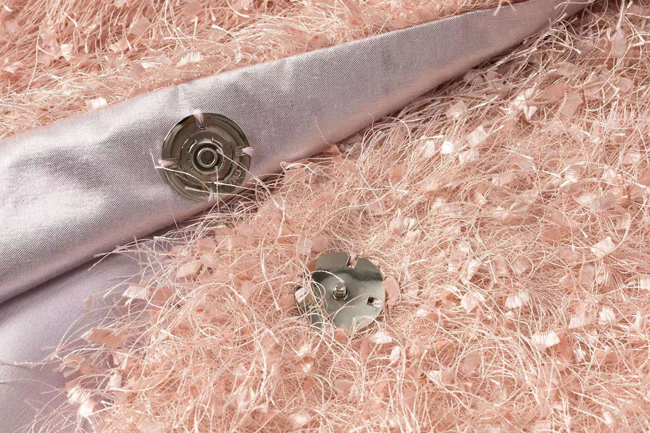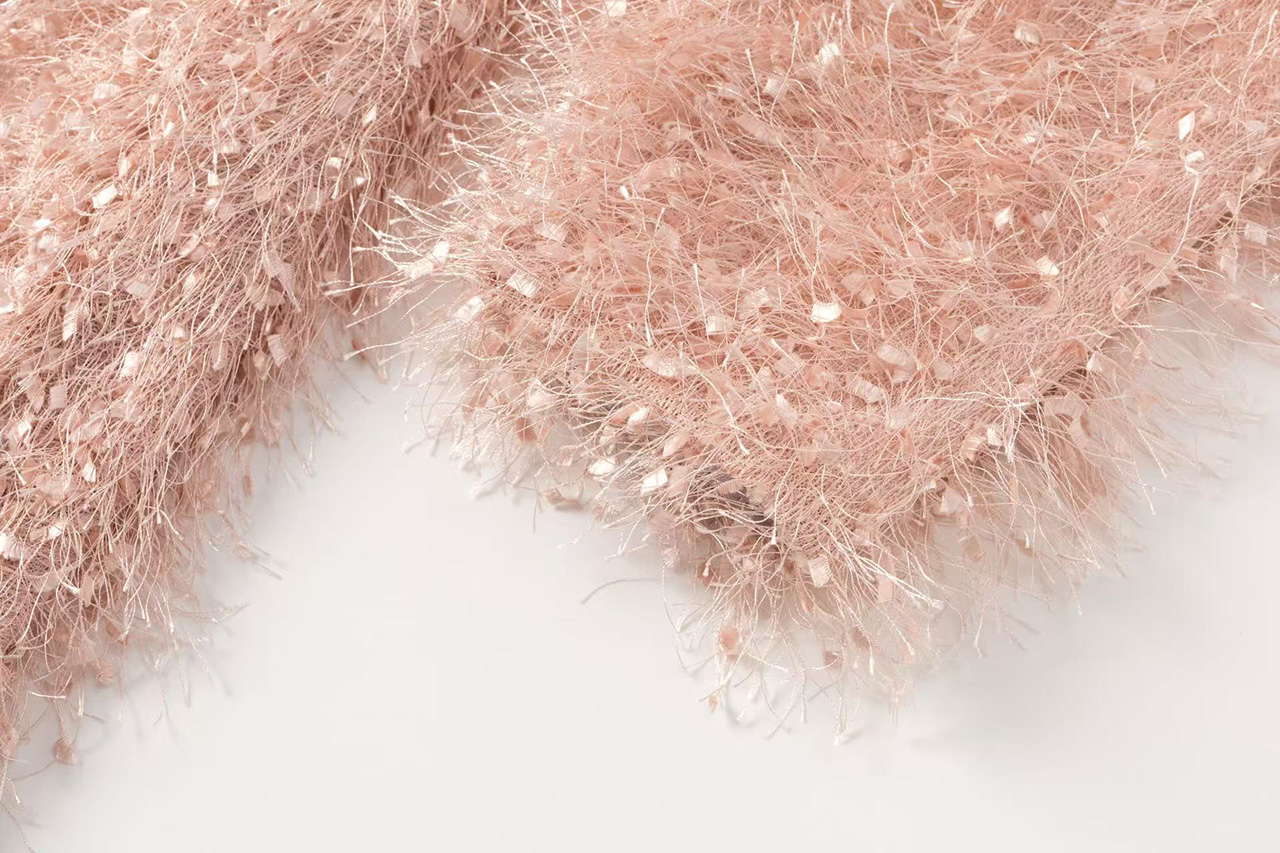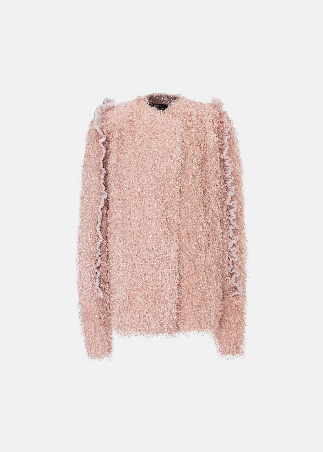 选用细腻的粉色毛绒面料,袖侧一圈镶嵌同色系荷叶边,营造温暖甜美氛围。翻领处露出银粉色里布,在光线下闪烁梦幻光泽,为外套增添独特层次感与奢华气质,整体设计浪漫与精致。