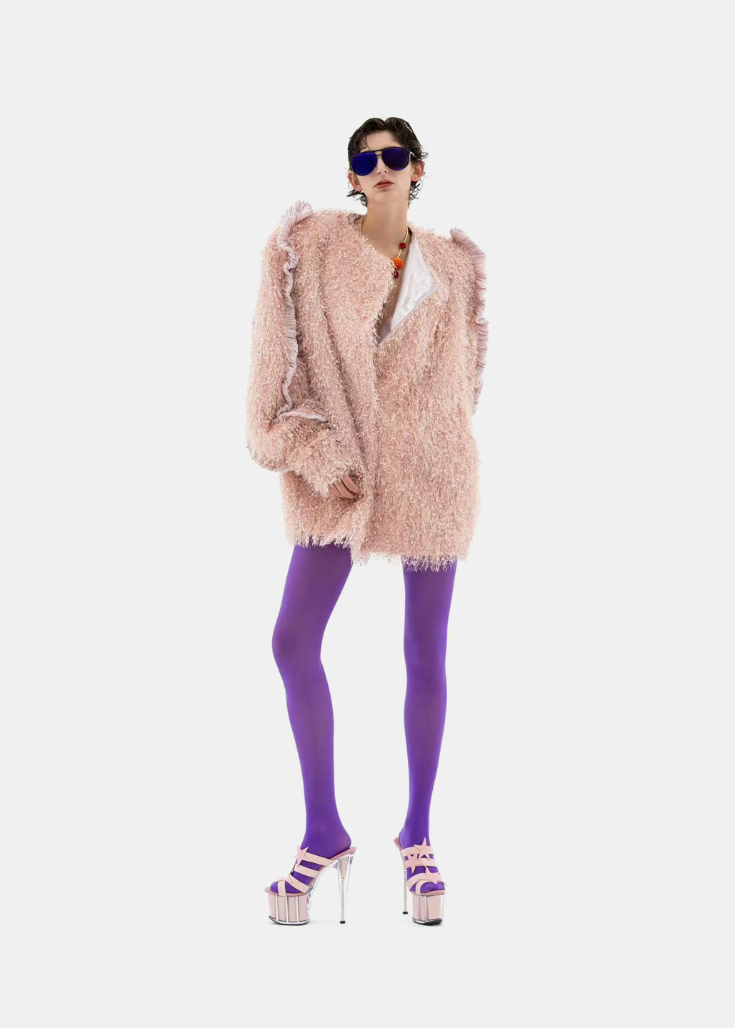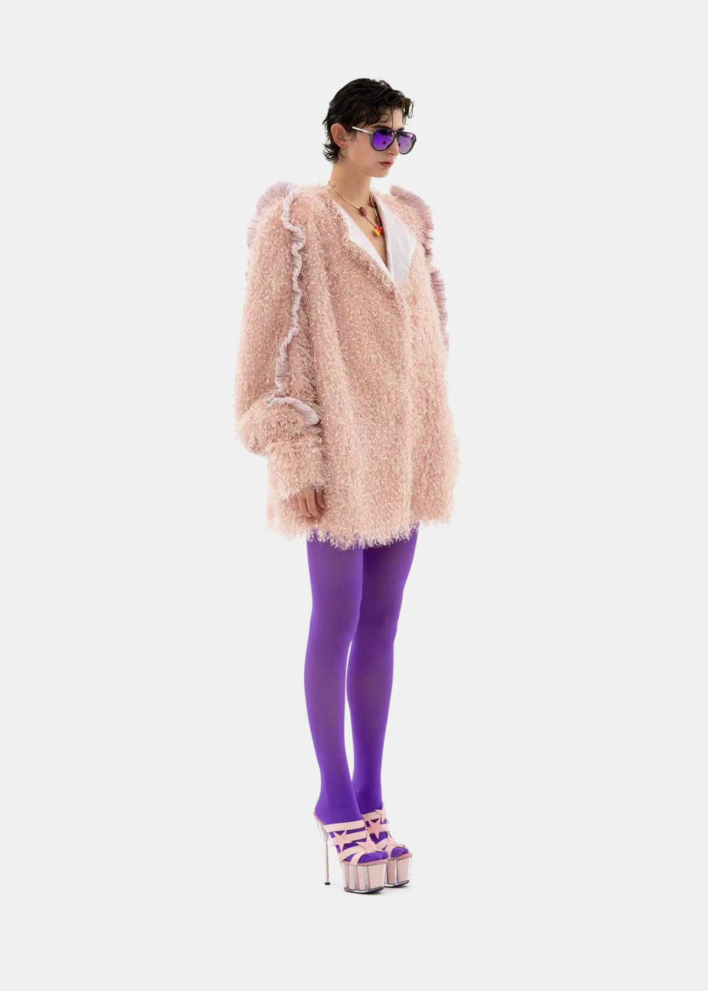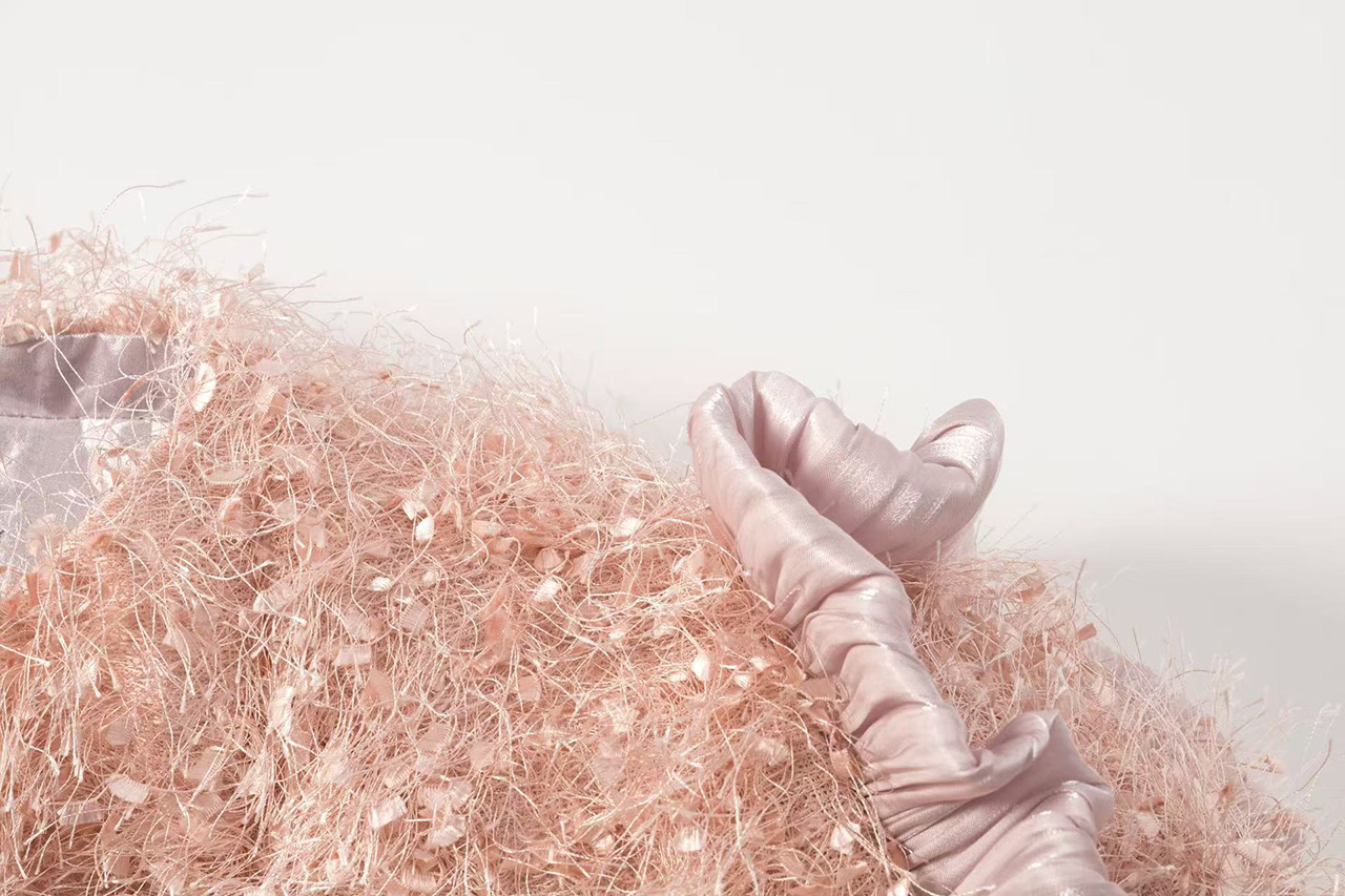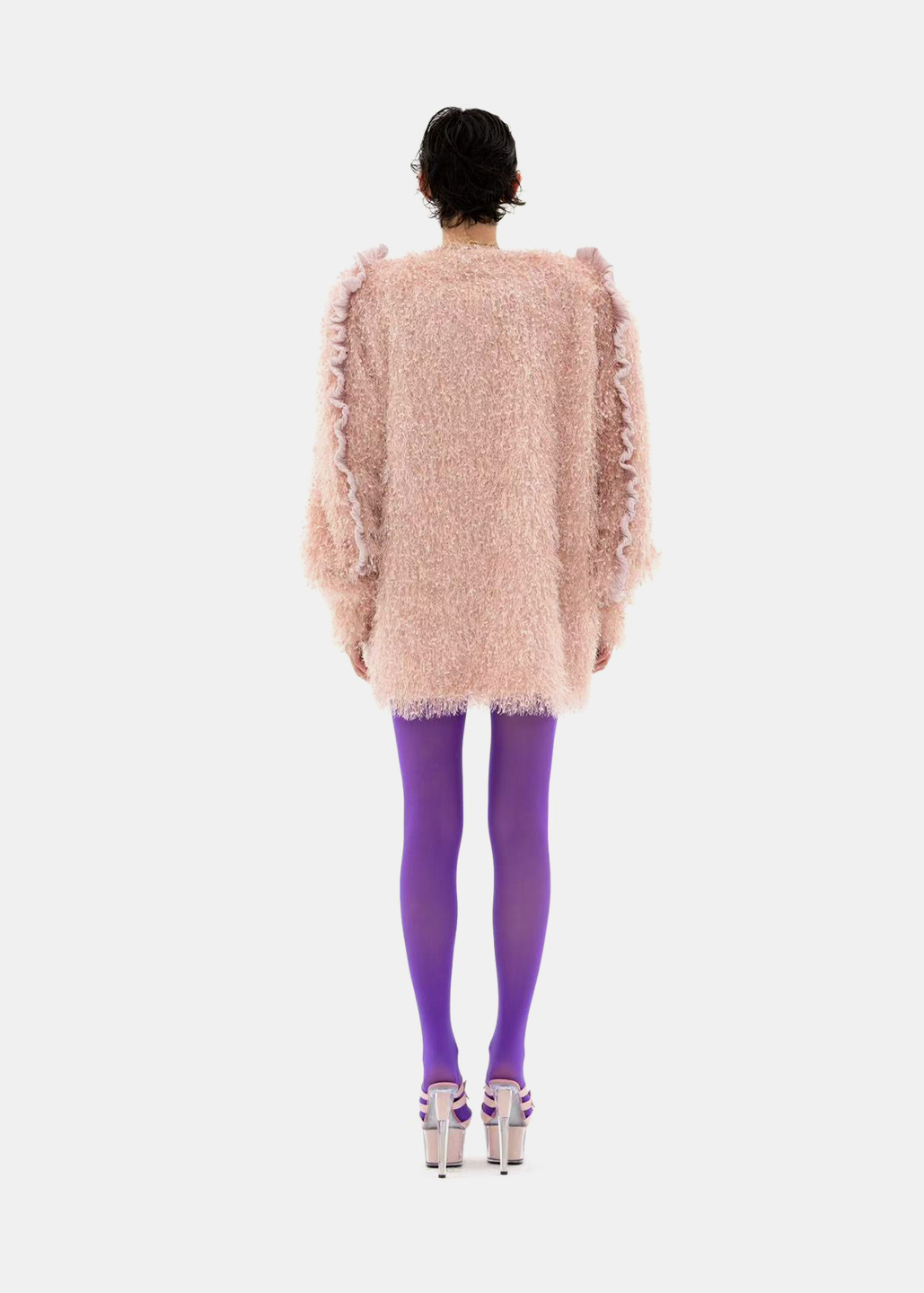 选用细腻的粉色毛绒面料,袖侧一圈镶嵌同色系荷叶边,营造温暖甜美氛围。翻领处露出银粉色里布,在光线下闪烁梦幻光泽,为外套增添独特层次感与奢华气质,整体设计浪漫与精致。