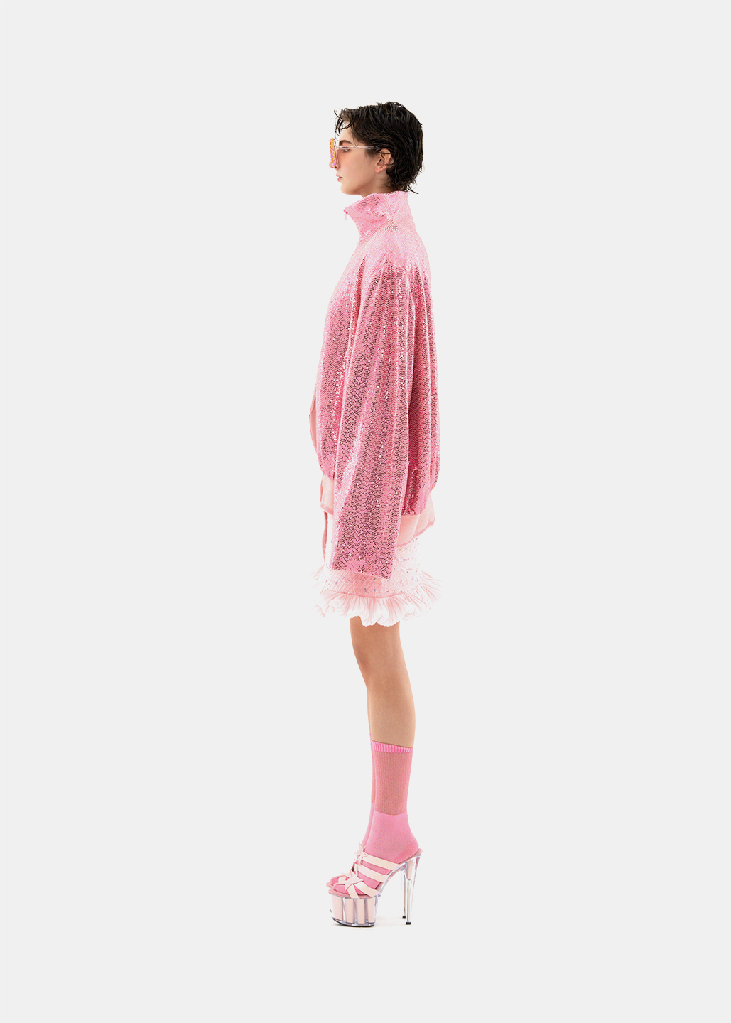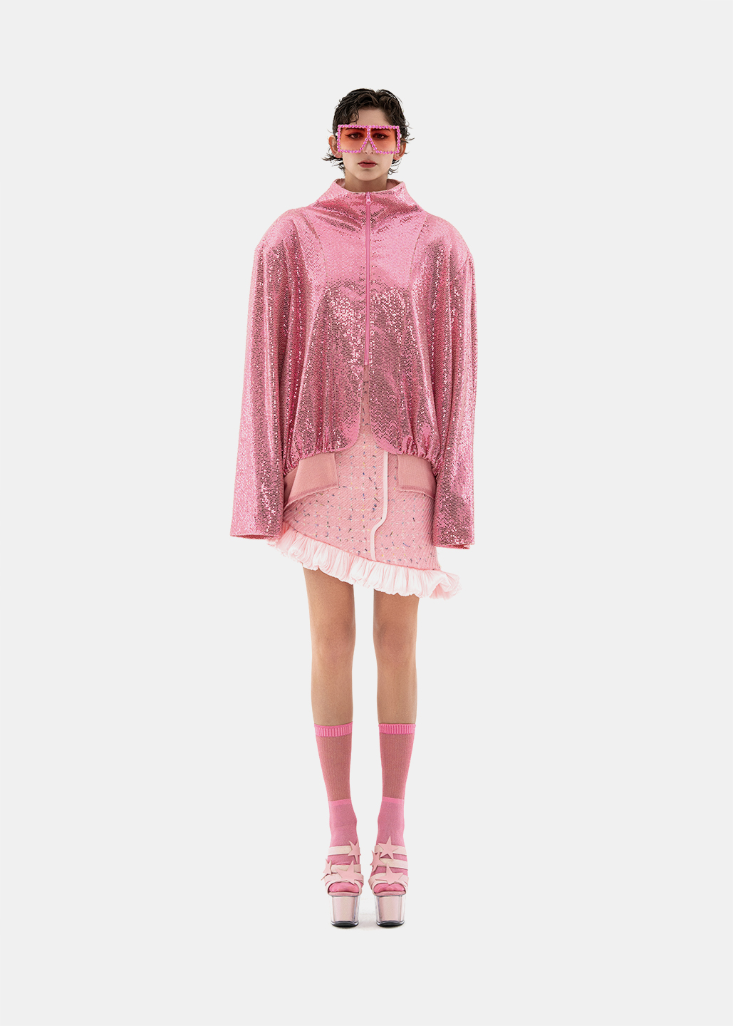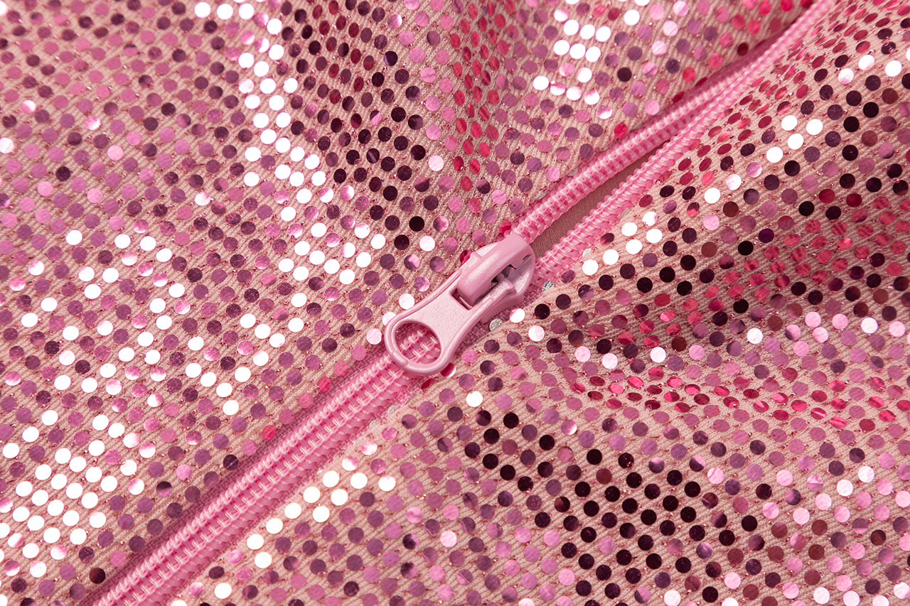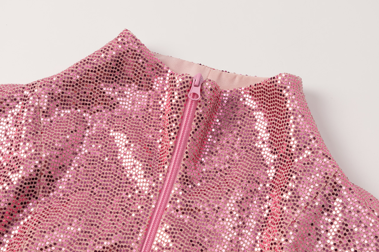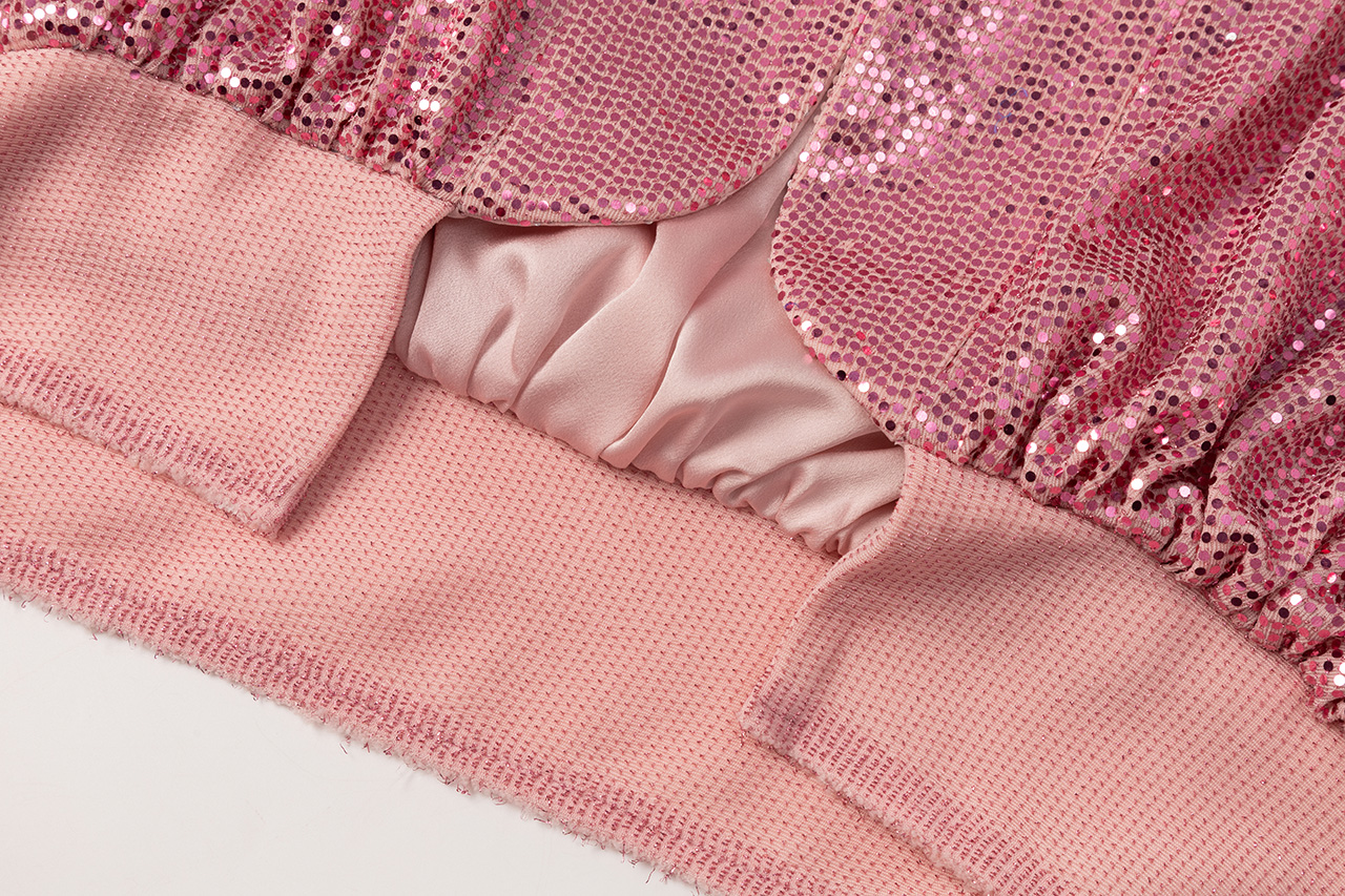 采用浪漫粉色,充满青春与温柔气息,丰富的亮片在每一个轻微动作中都能折射出迷人光芒。落肩设计为整体增添随性慵懒感,自然大气。中部划分依据人体工学原理精心打造,增加层次感与立体感。