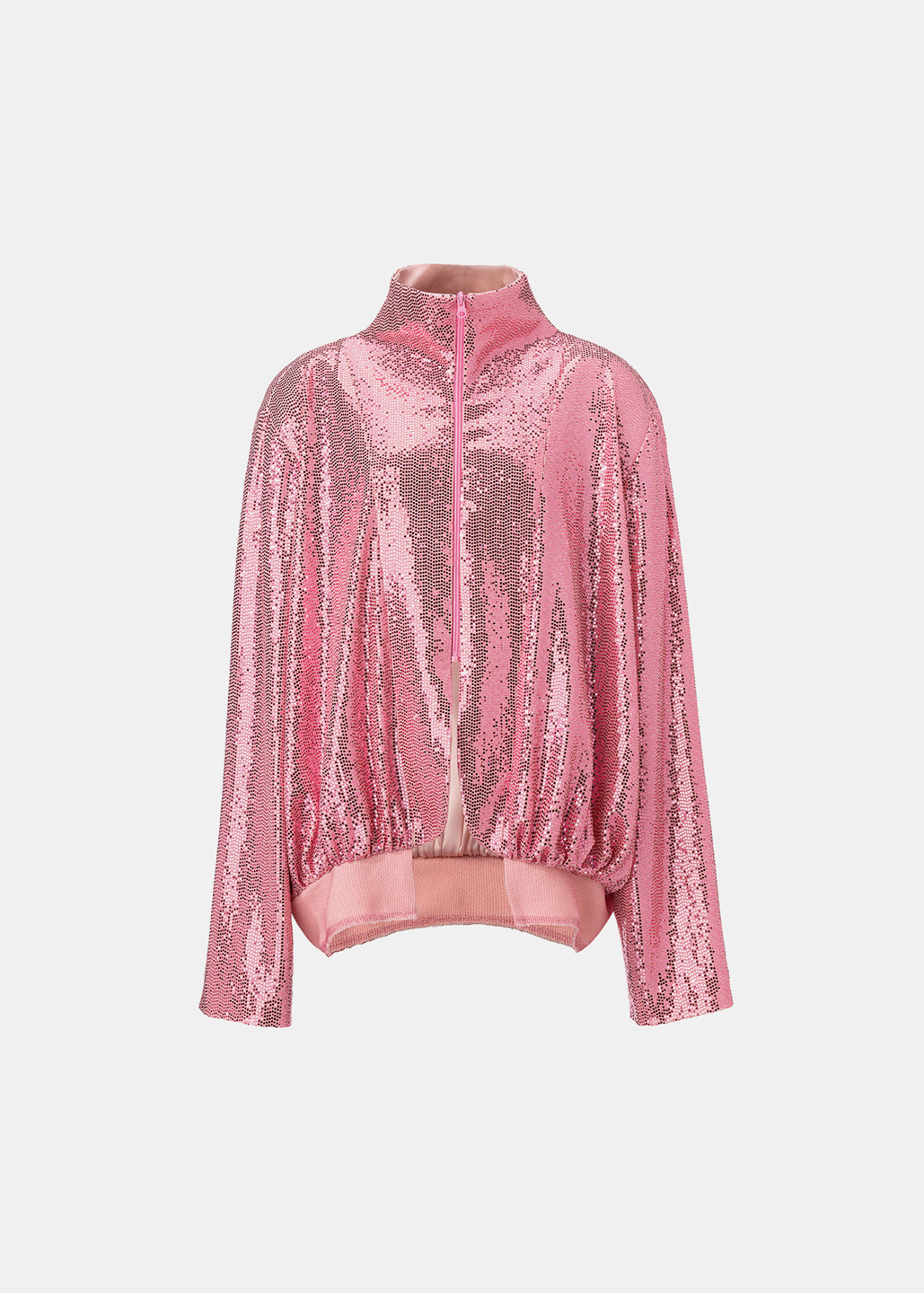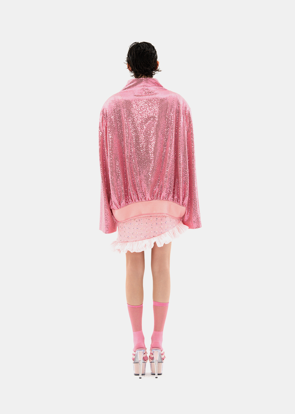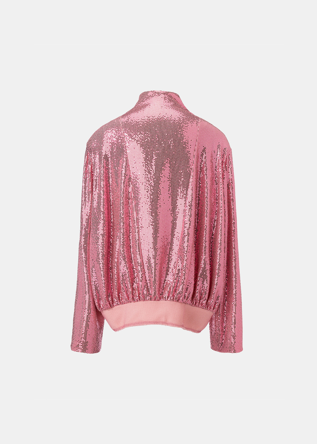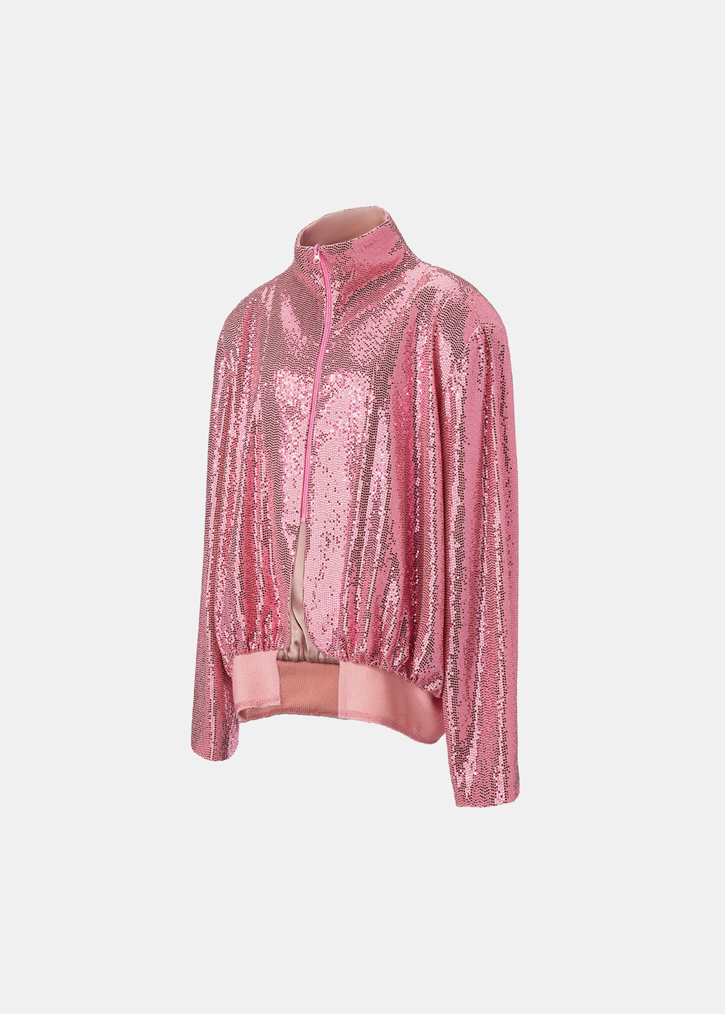 采用浪漫粉色,充满青春与温柔气息,丰富的亮片在每一个轻微动作中都能折射出迷人光芒。落肩设计为整体增添随性慵懒感,自然大气。中部划分依据人体工学原理精心打造,增加层次感与立体感。