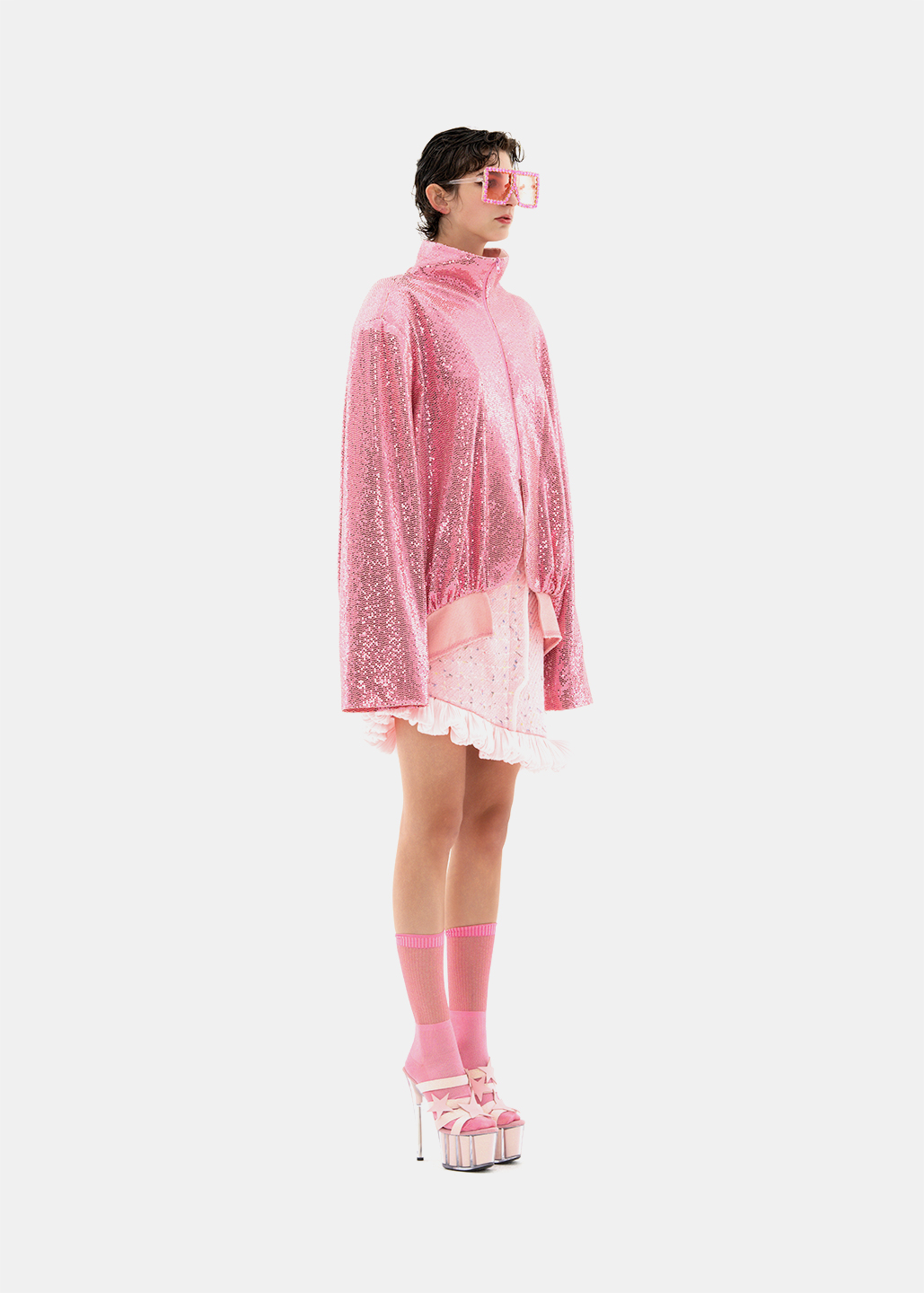 在经典风格基础上融入创新理念,可见前门襟成为亮点,粉色边条使其大胆且叛逆。下摆的粉色蕾丝拉回年轻甜美的少女姿态。