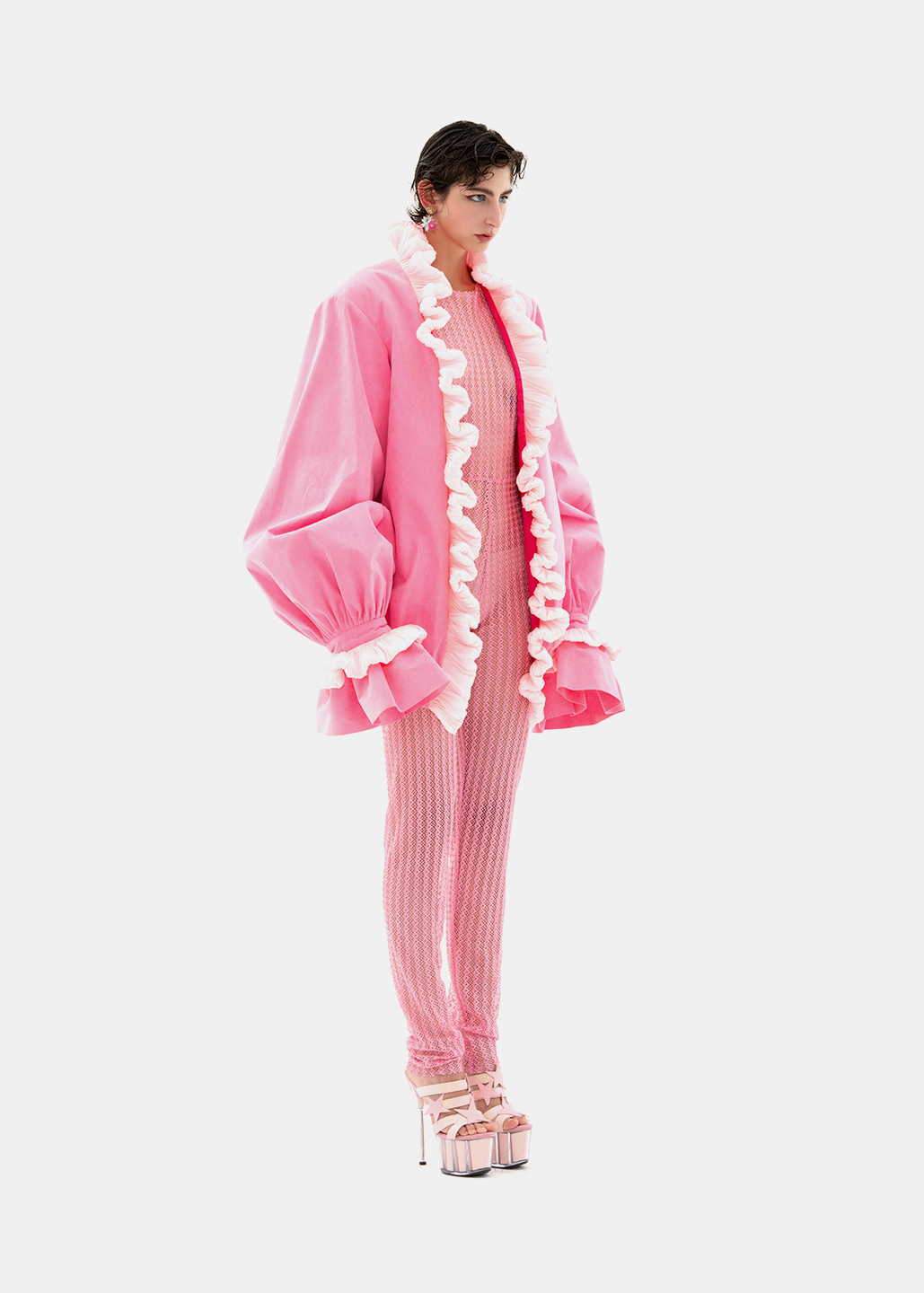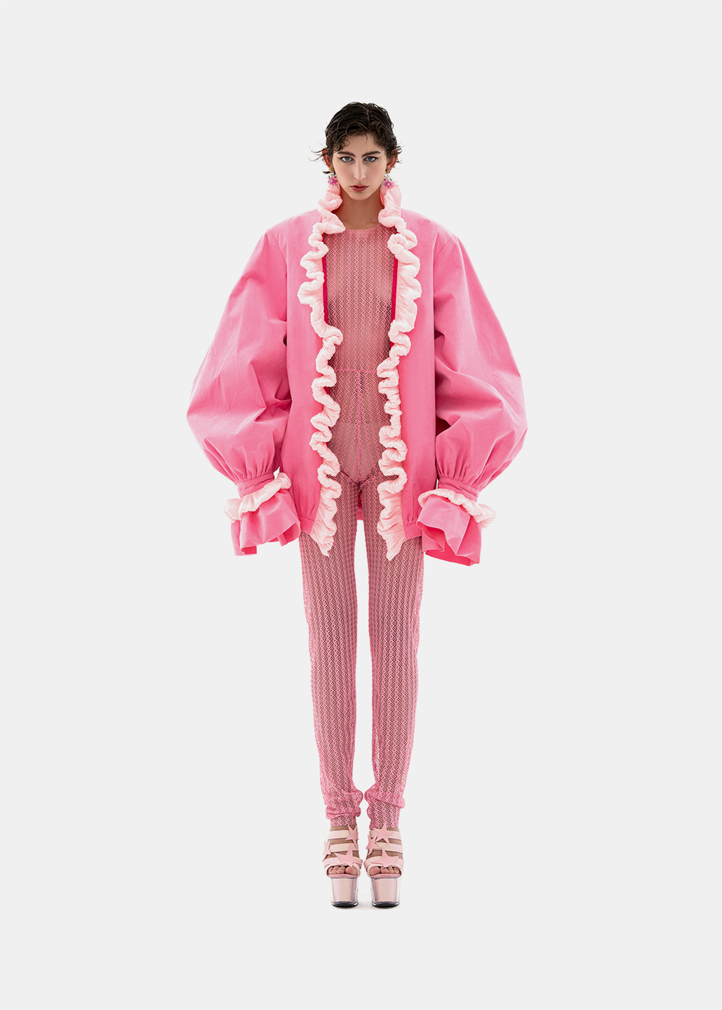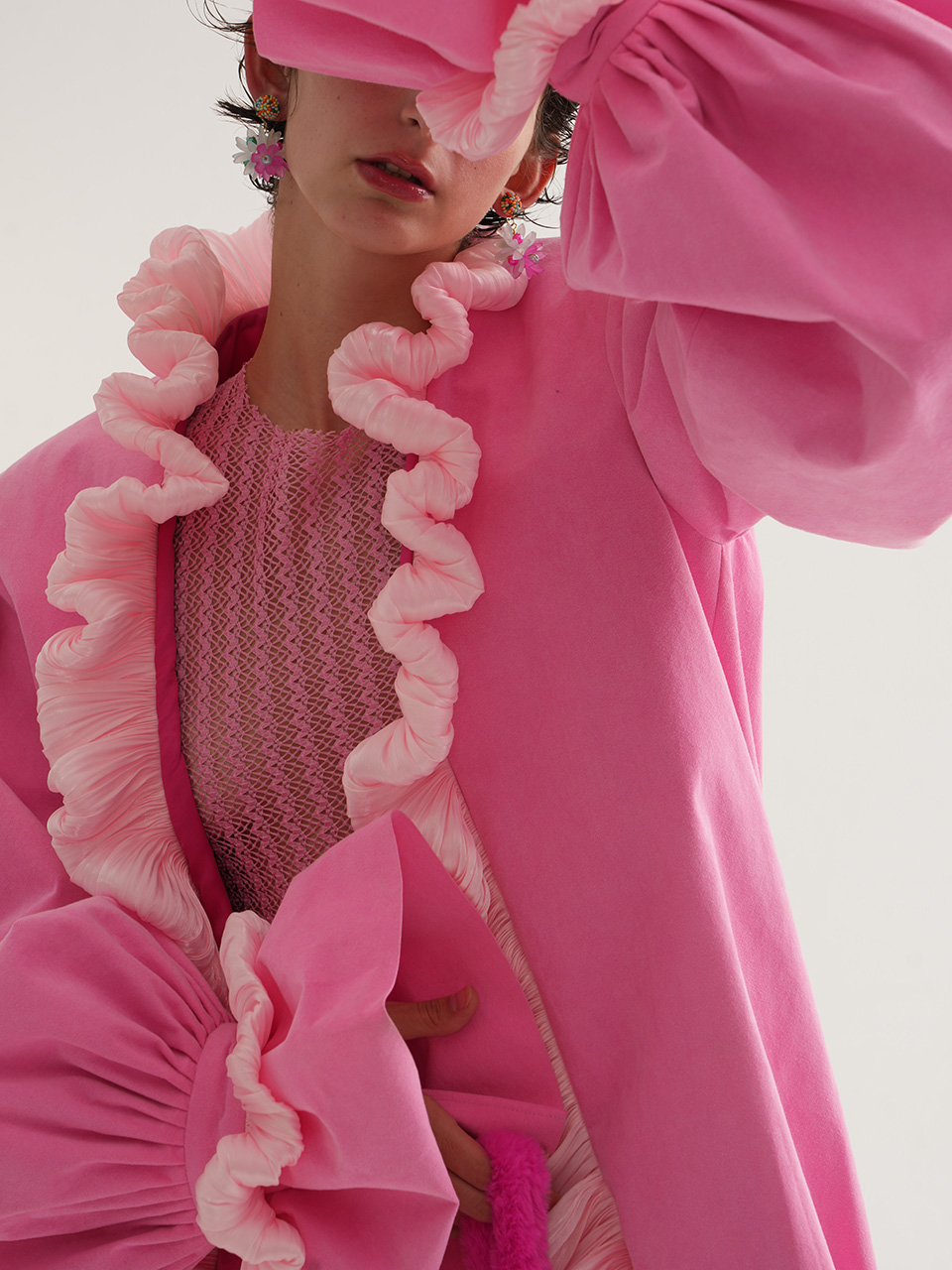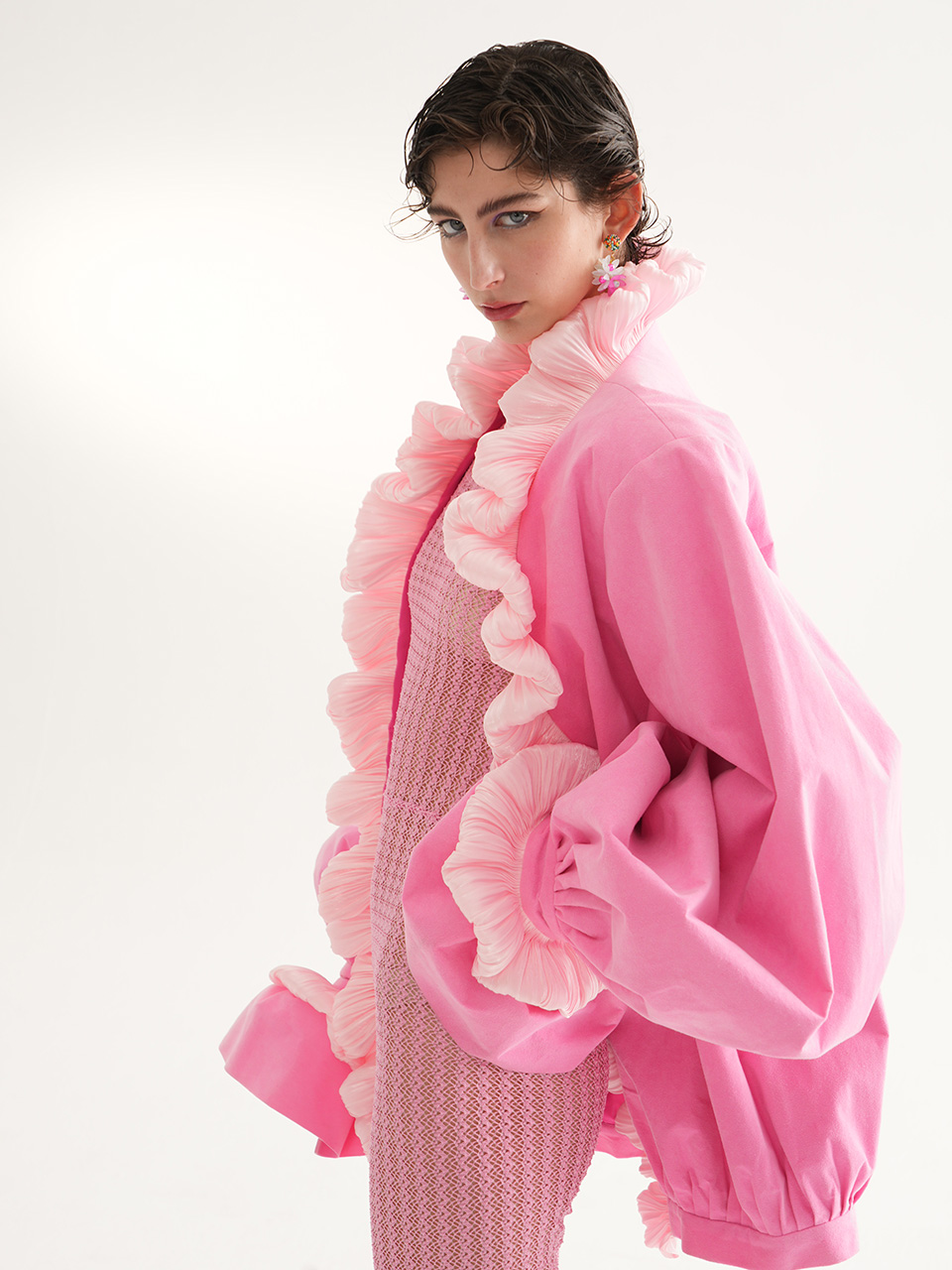 整套服装是充满春意的视觉盛宴。修身连体衣展现身材,人体肌肤若隐若现。搭配宽松、仪式感的大衣,年轻、态度、时尚。