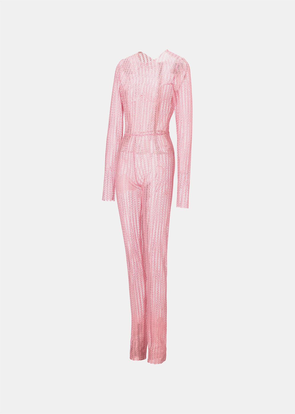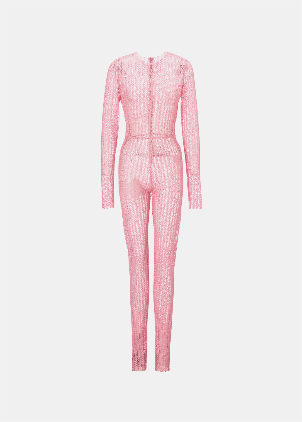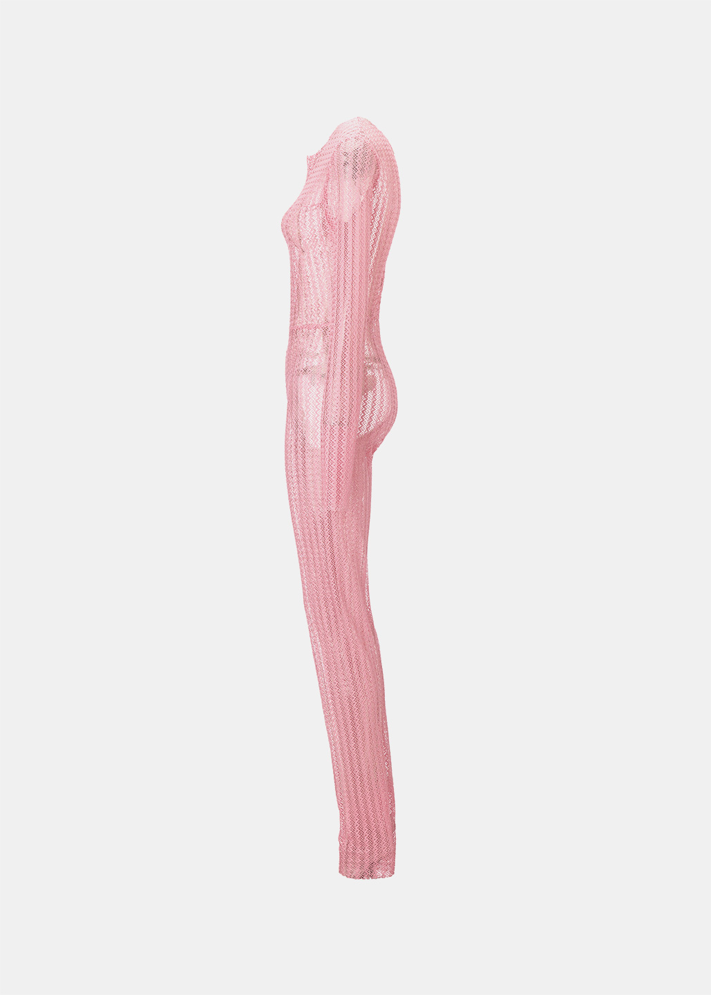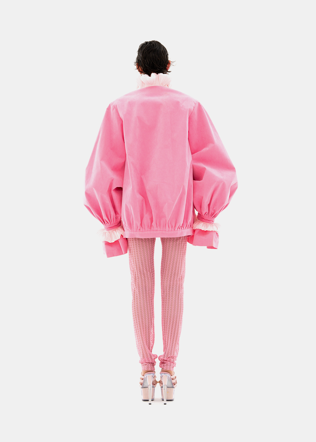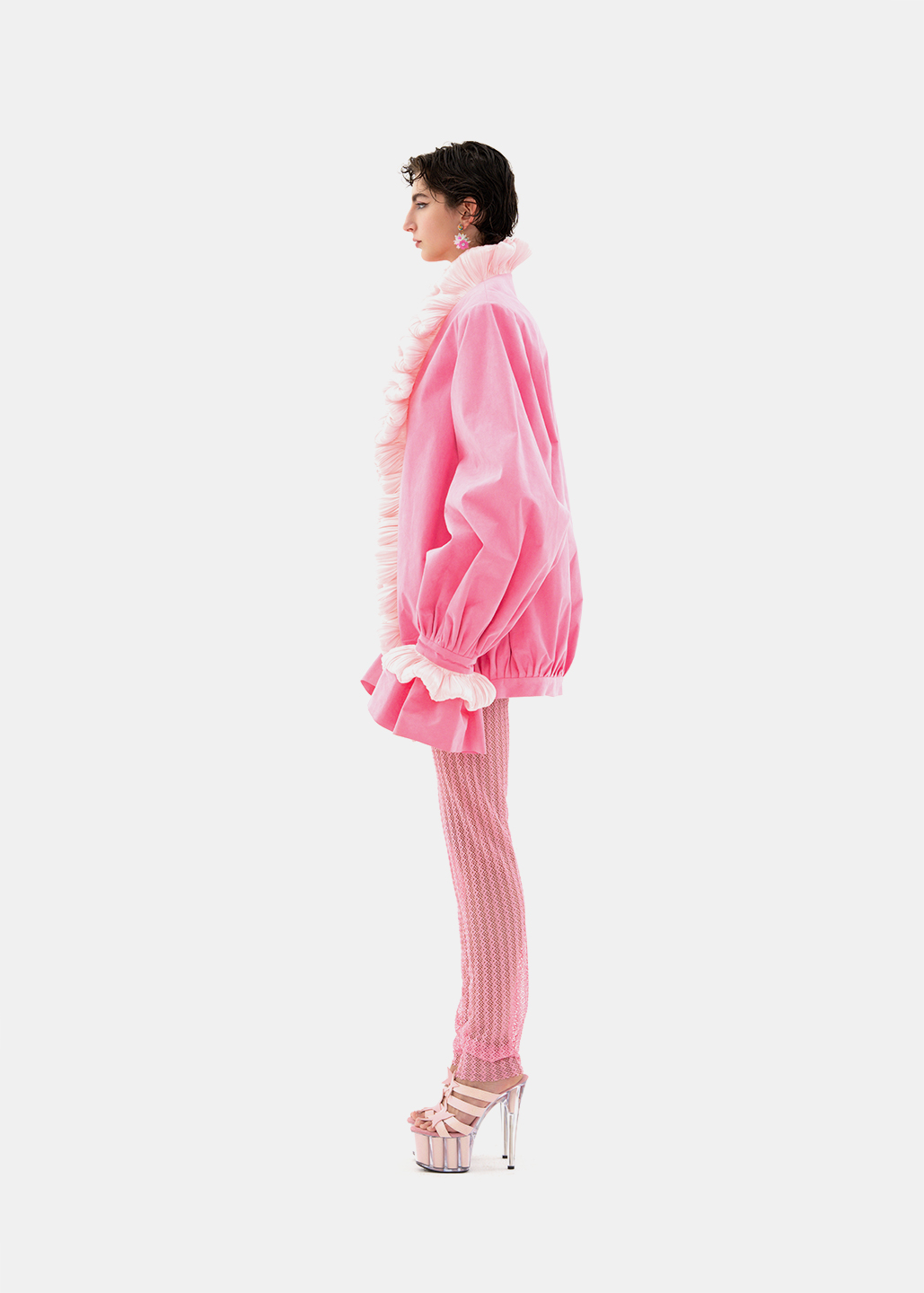 整套服装是充满春意的视觉盛宴。修身连体衣展现身材,人体肌肤若隐若现。搭配宽松、仪式感的大衣,年轻、态度、时尚。