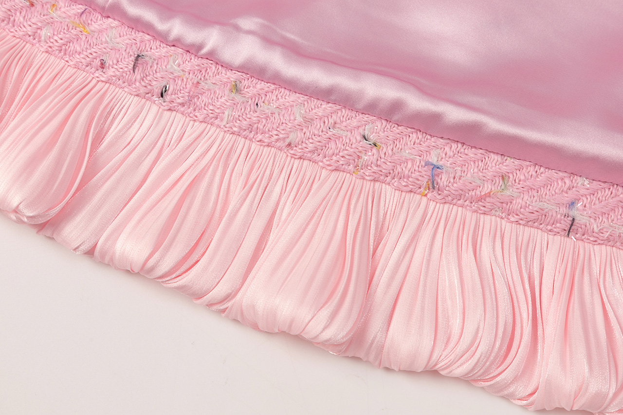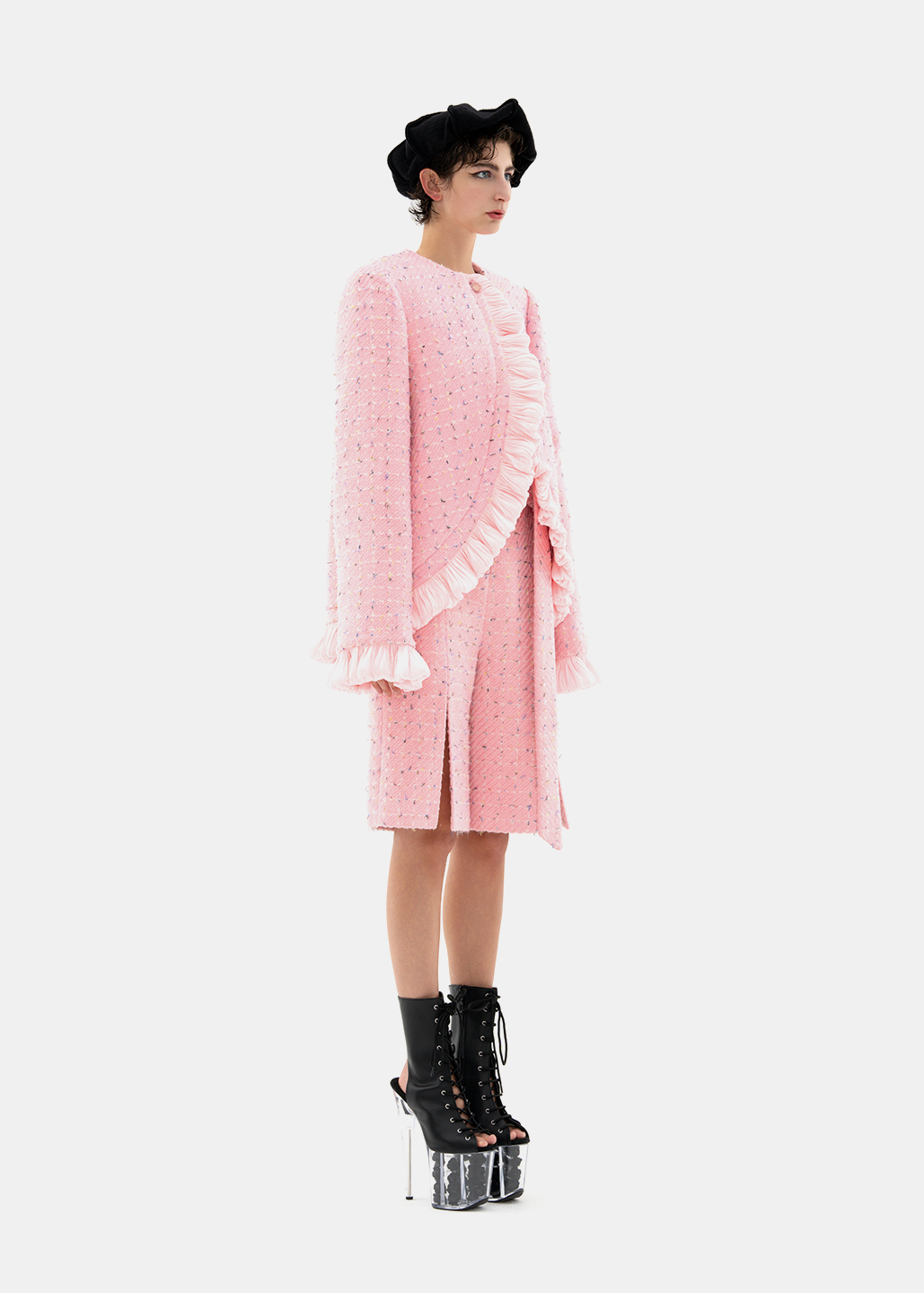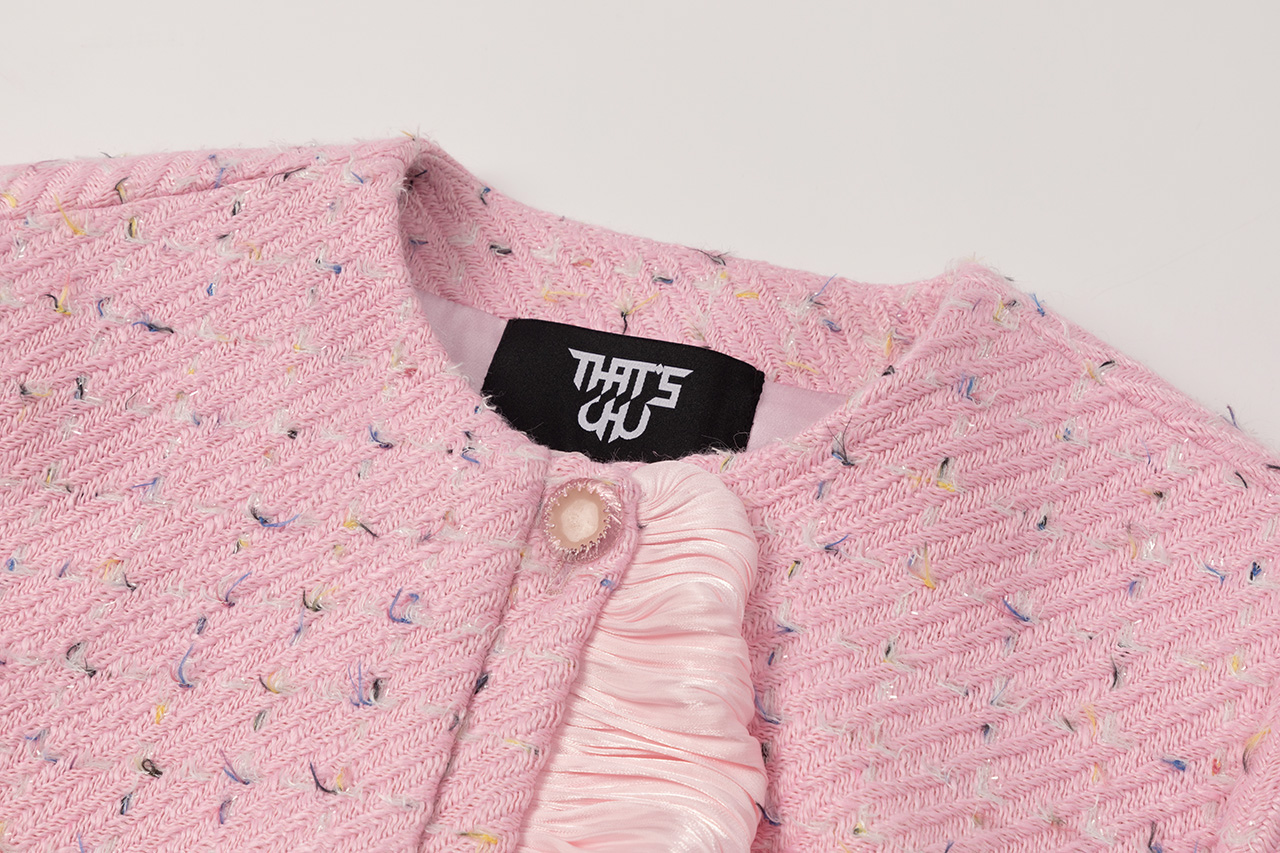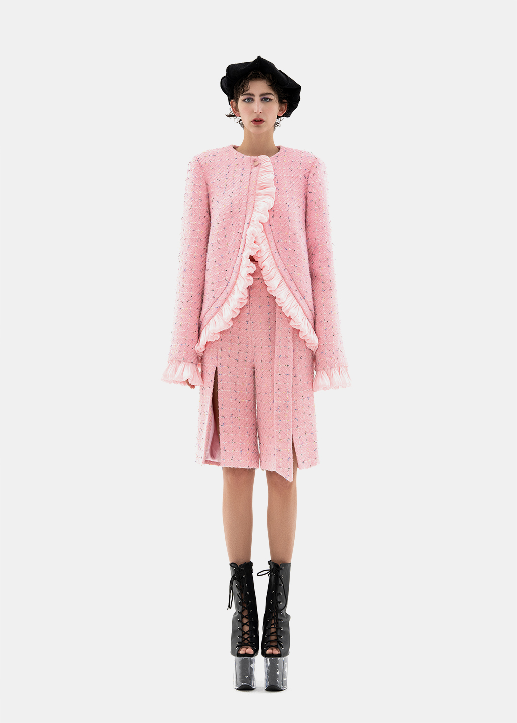 采用弧形剪裁方式,前门襟、下摆与后摆一气呵成连贯流畅,营造独特的层次感,同色面料的粉色蕾丝缠绕其中,为整体增添一抹温柔与浪漫。面料挺括的小香风风格,是对 THAT's CHU 独特年轻浪漫生活态度的诠释。