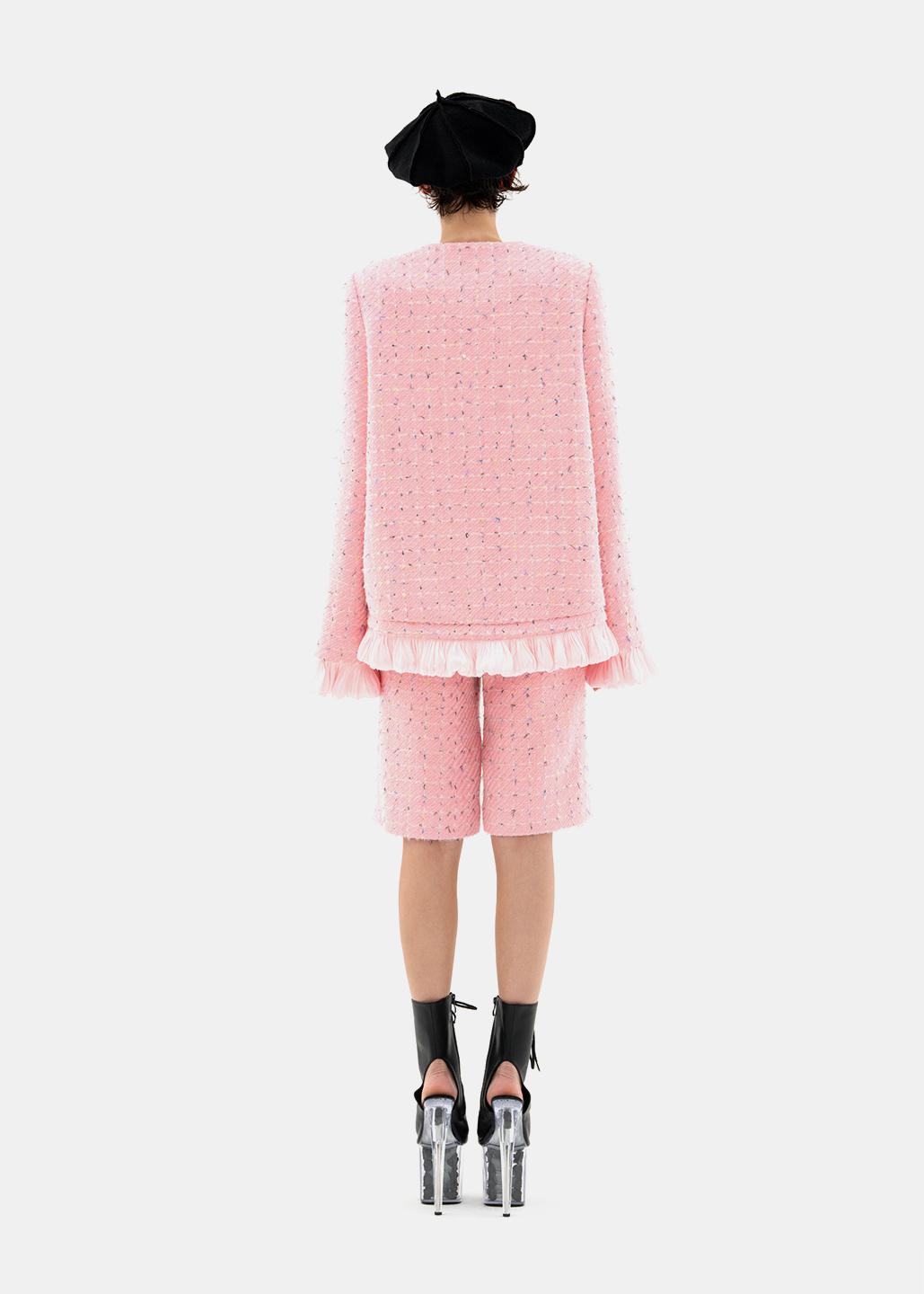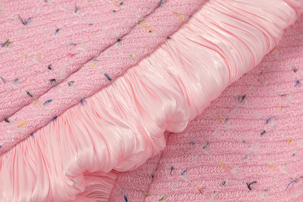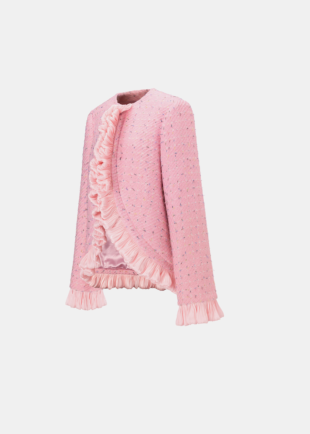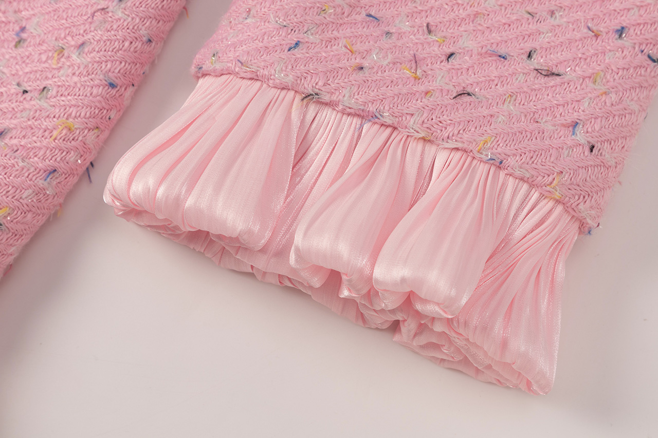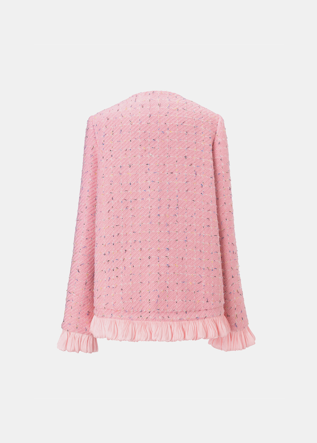 采用弧形剪裁方式,前门襟、下摆与后摆一气呵成连贯流畅,营造独特的层次感,同色面料的粉色蕾丝缠绕其中,为整体增添一抹温柔与浪漫。面料挺括的小香风风格,是对 THAT's CHU 独特年轻浪漫生活态度的诠释。