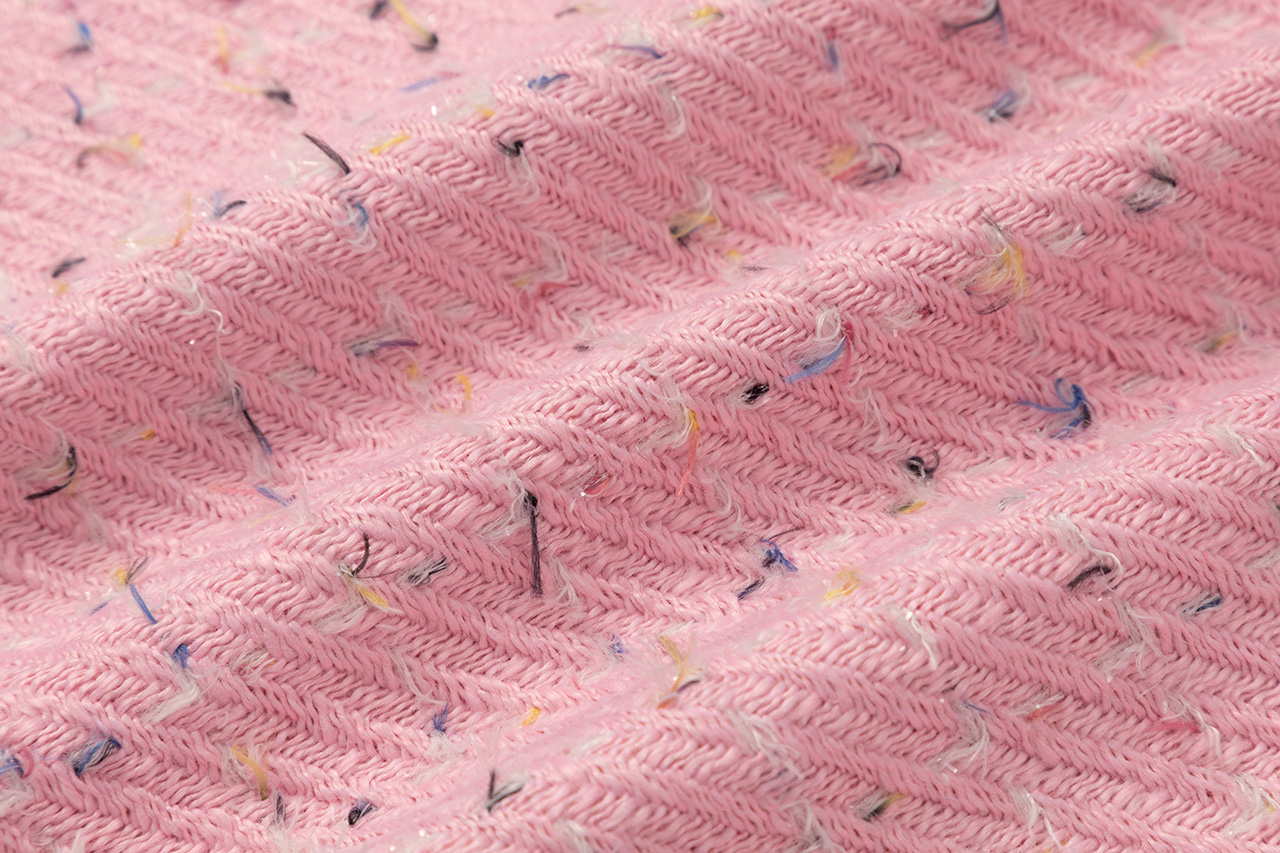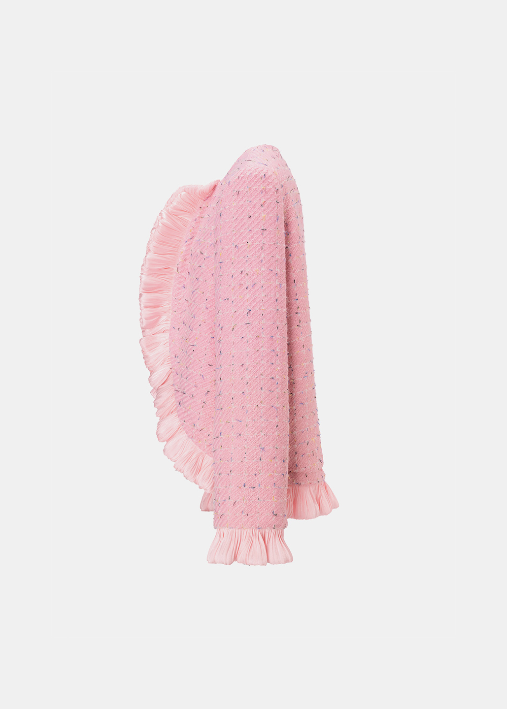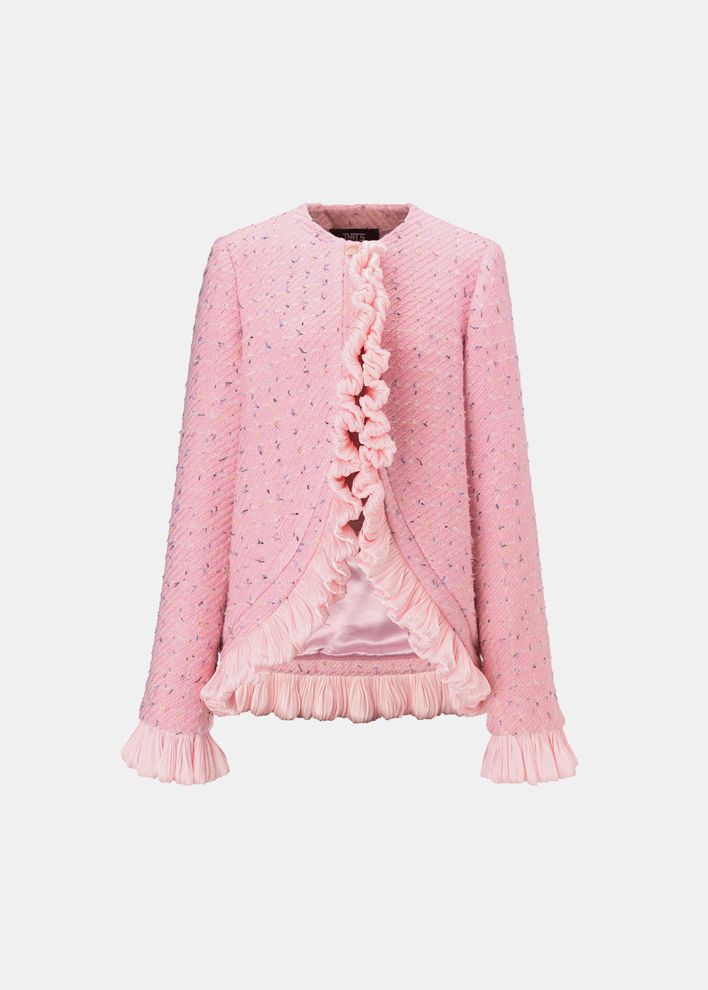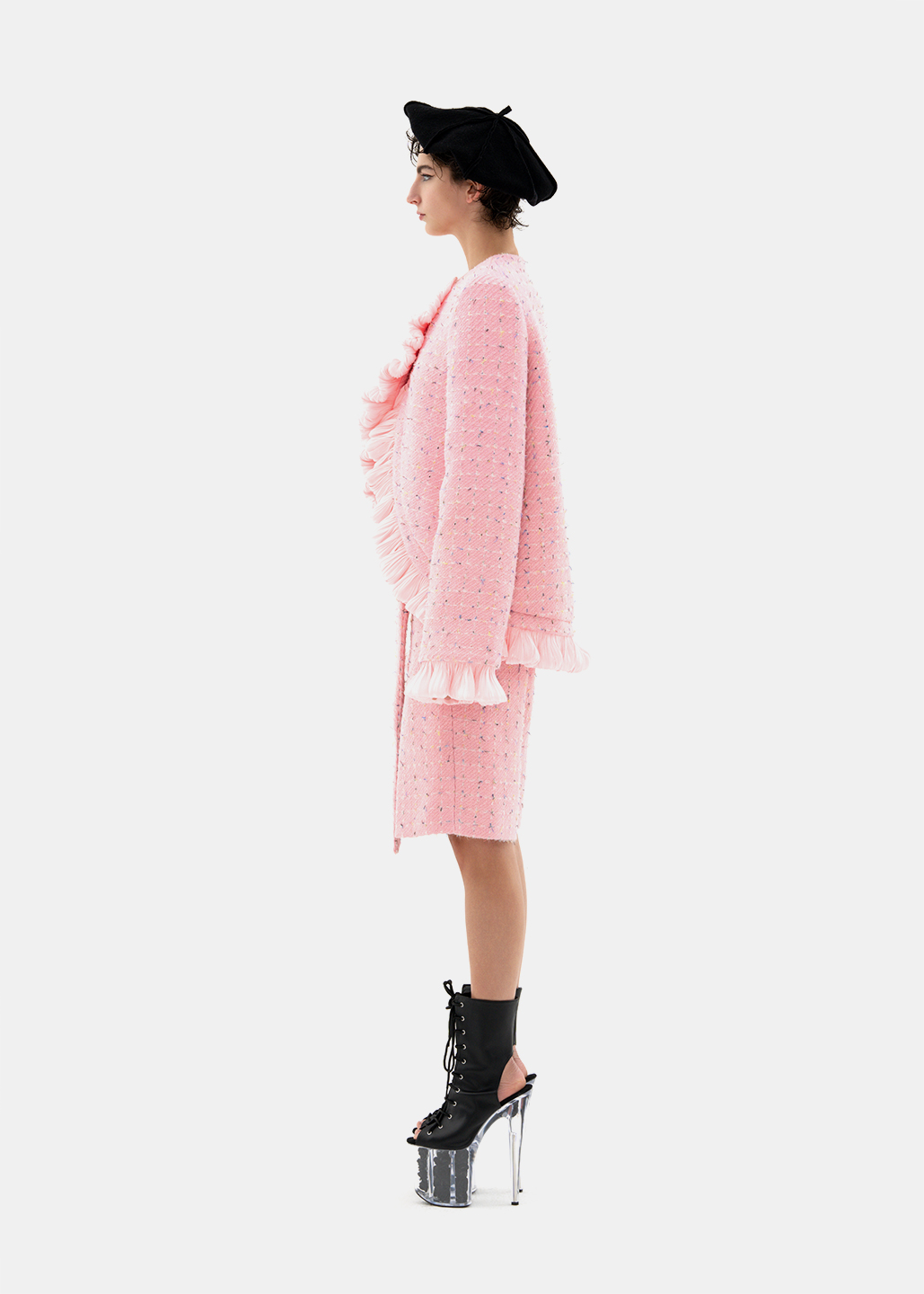 采用弧形剪裁方式,前门襟、下摆与后摆一气呵成连贯流畅,营造独特的层次感,同色面料的粉色蕾丝缠绕其中,为整体增添一抹温柔与浪漫。面料挺括的小香风风格,是对 THAT's CHU 独特年轻浪漫生活态度的诠释。