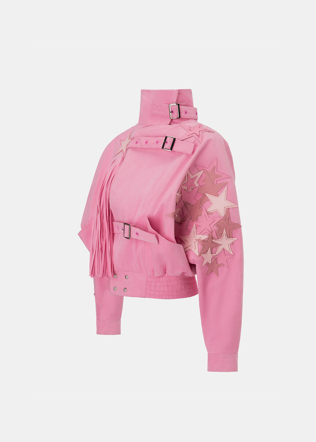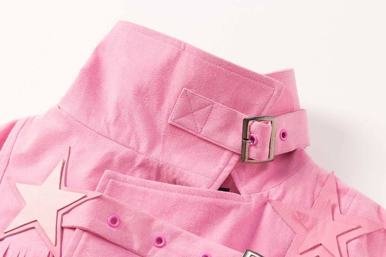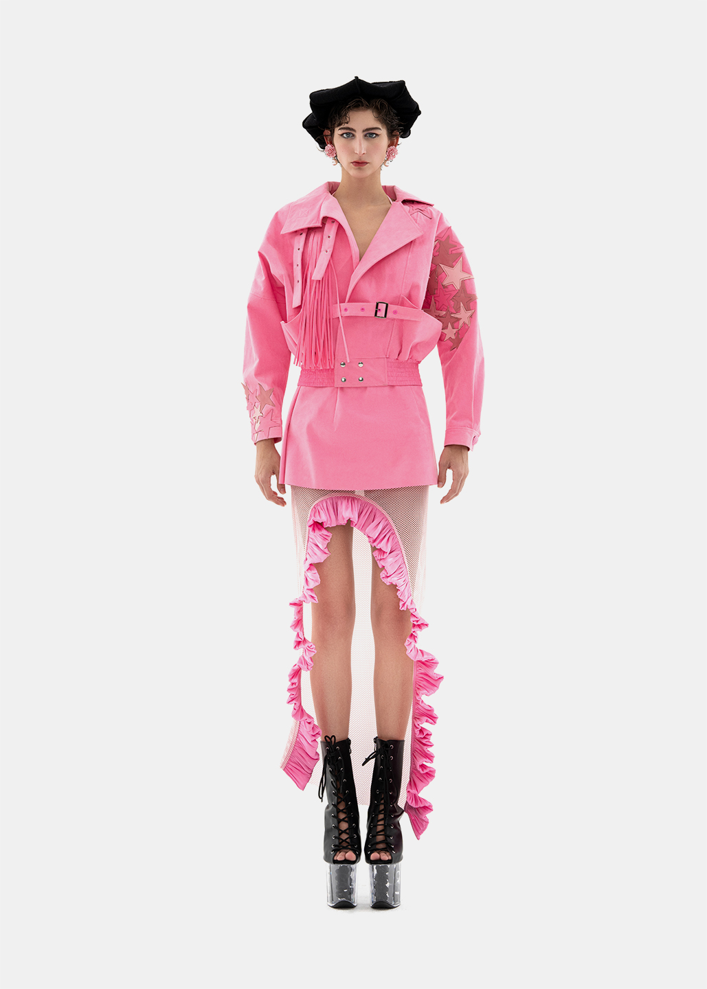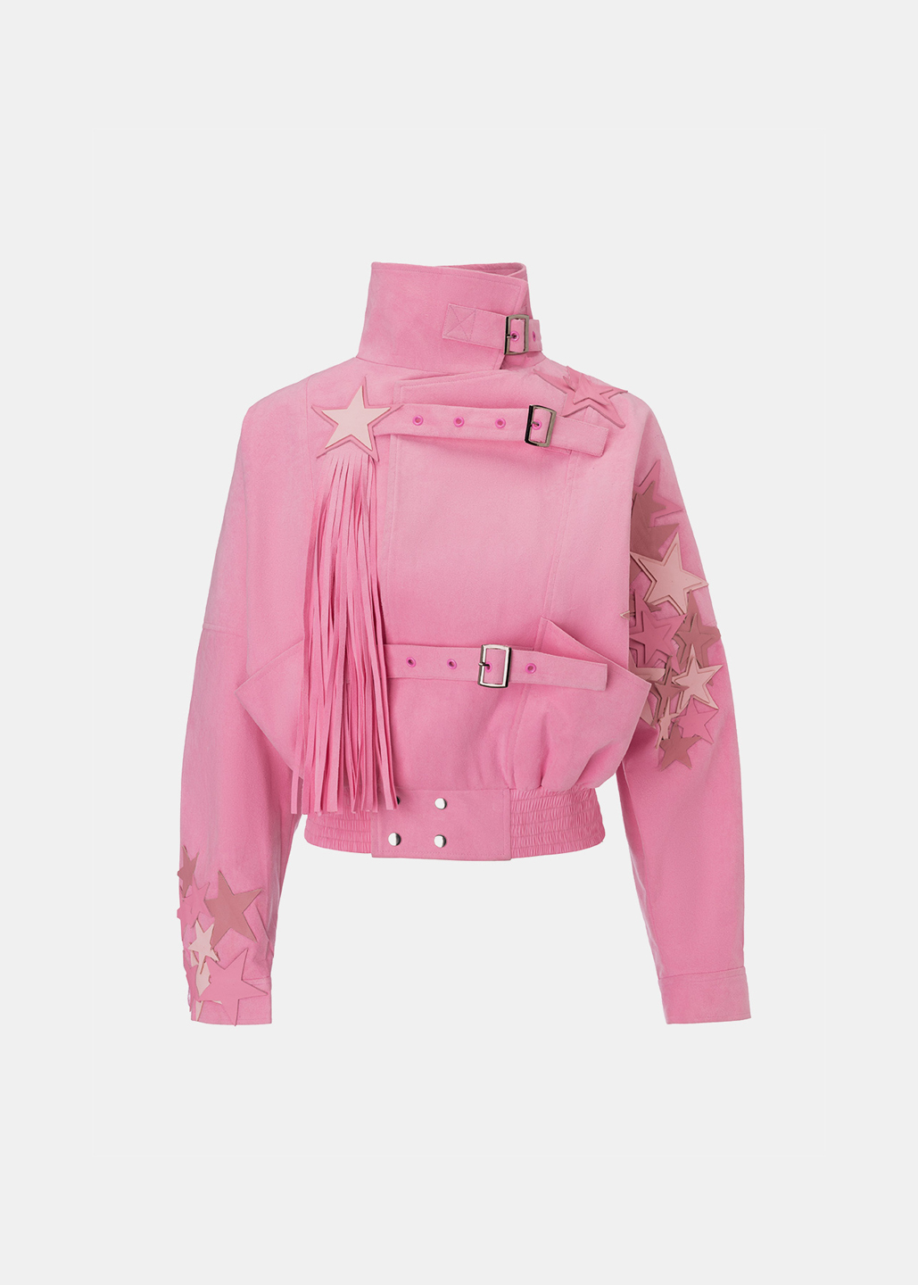 这款粉色星影流苏夹克,采用手工烫贴工艺,将皮质星星元素层层叠加,形成独特的"星影"效果,仿佛将星光穿在身上,既梦幻又充满未来感。纸感廓形的面料挺括有型,赋予夹克利落的轮廓与时尚张力。流苏设计轻盈灵动,随步伐摇曳,为整体增添了一抹动感与浪漫气息。无论是材质的选择还是细节的雕琢,都展现出前卫与时尚的风范。