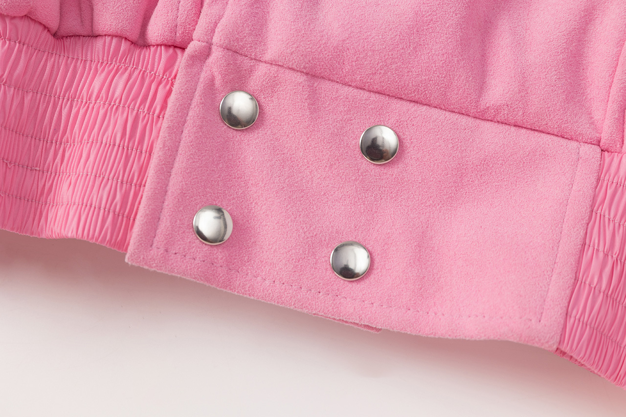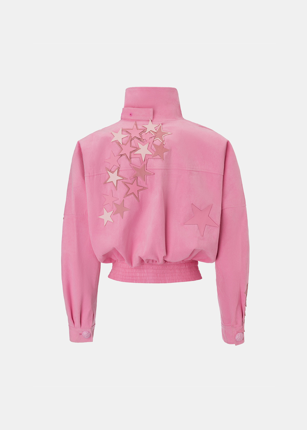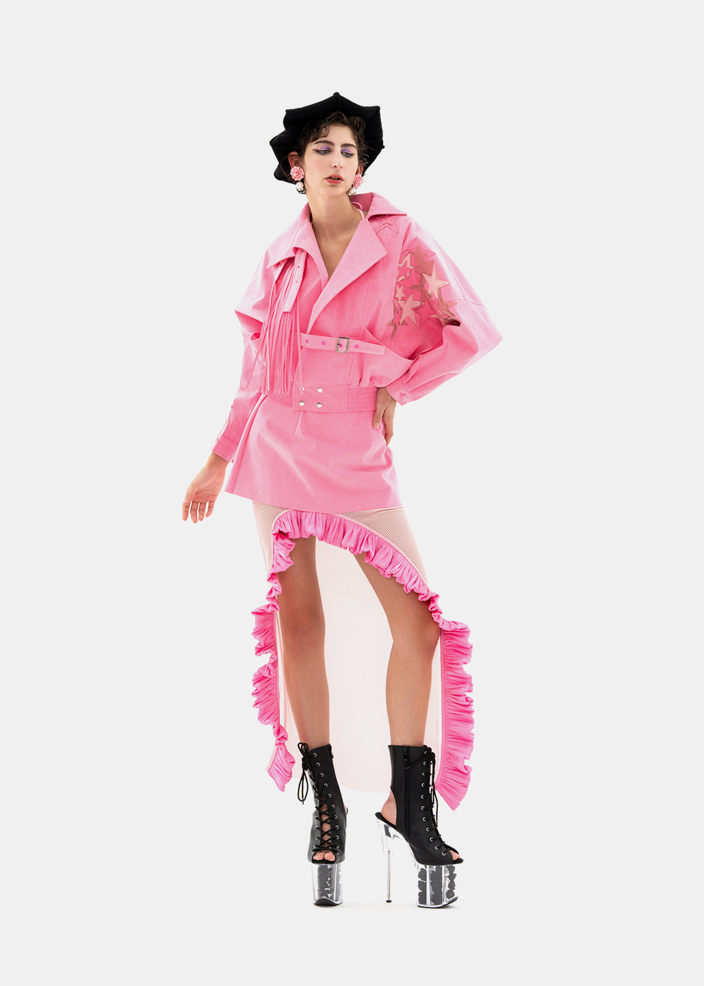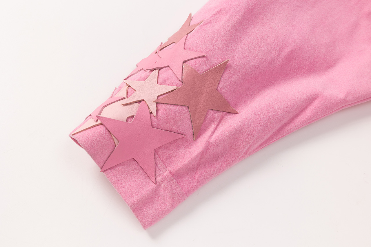 这款粉色星影流苏夹克,采用手工烫贴工艺,将皮质星星元素层层叠加,形成独特的"星影"效果,仿佛将星光穿在身上,既梦幻又充满未来感。纸感廓形的面料挺括有型,赋予夹克利落的轮廓与时尚张力。流苏设计轻盈灵动,随步伐摇曳,为整体增添了一抹动感与浪漫气息。无论是材质的选择还是细节的雕琢,都展现出前卫与时尚的风范。